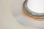 3 Mid-Century cylindrical shaped chandeliers / lanterns having a circular micro-square design with a center silvered metal central band and ceiling post support (PRICED EACH).