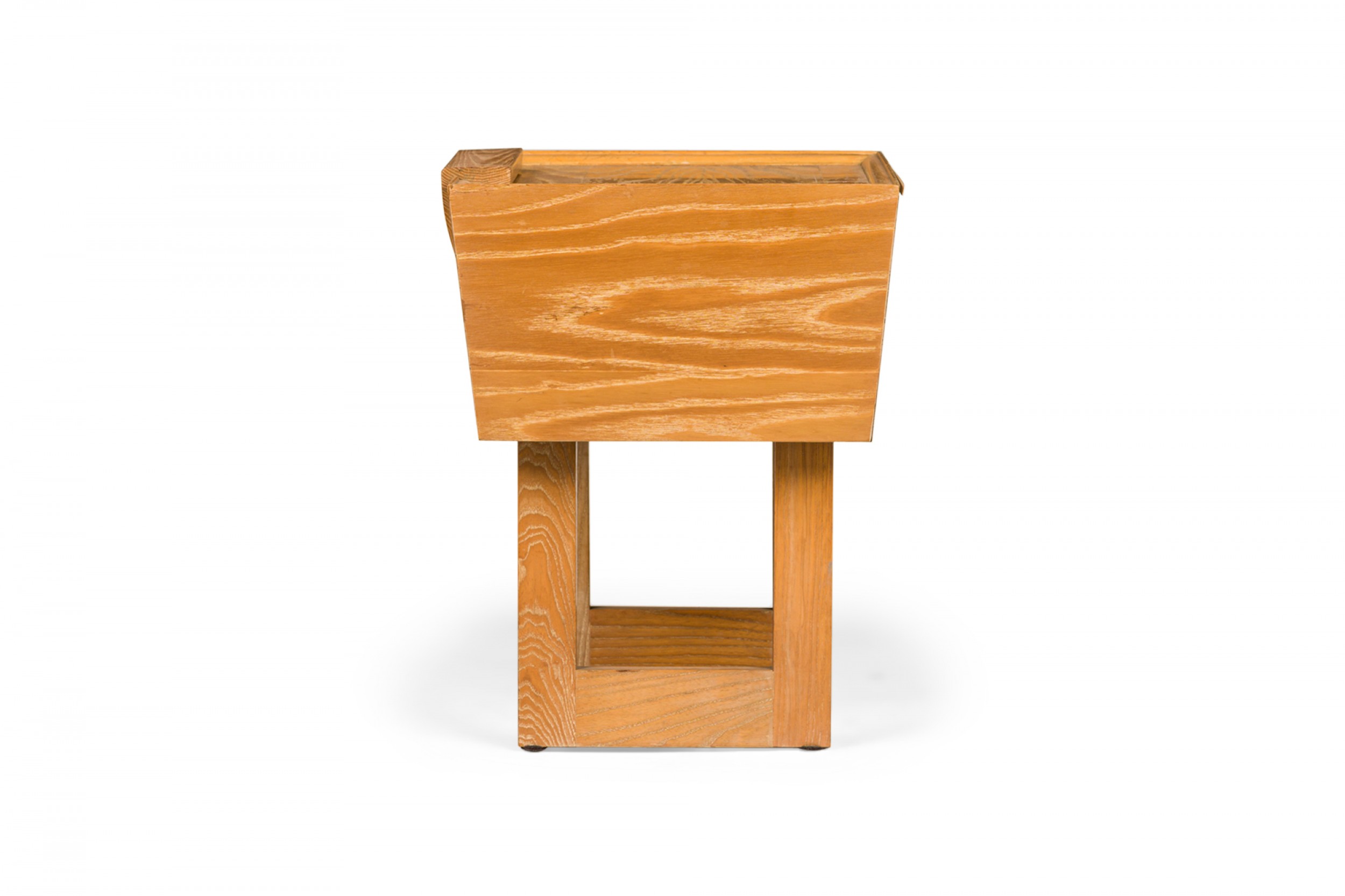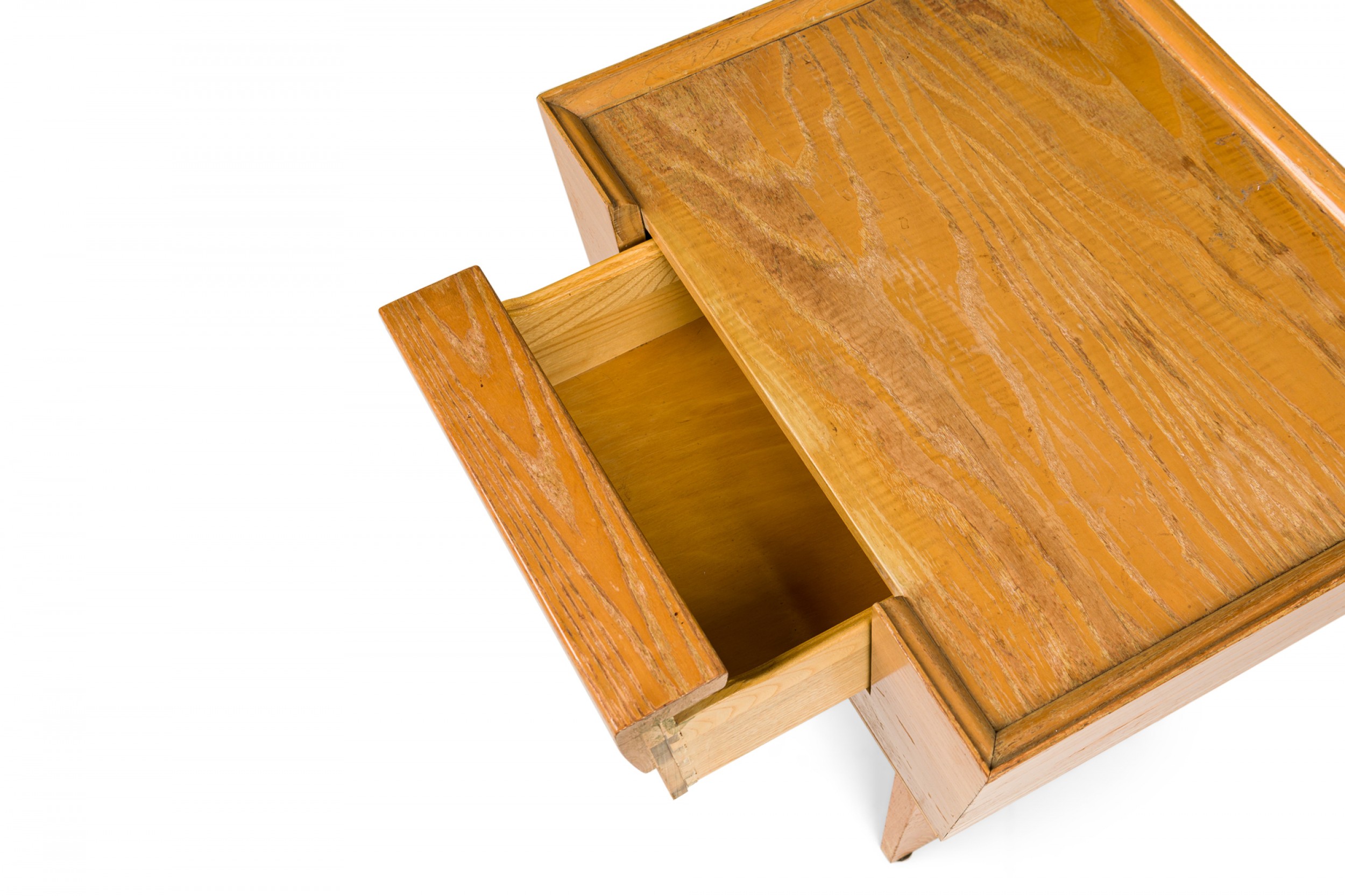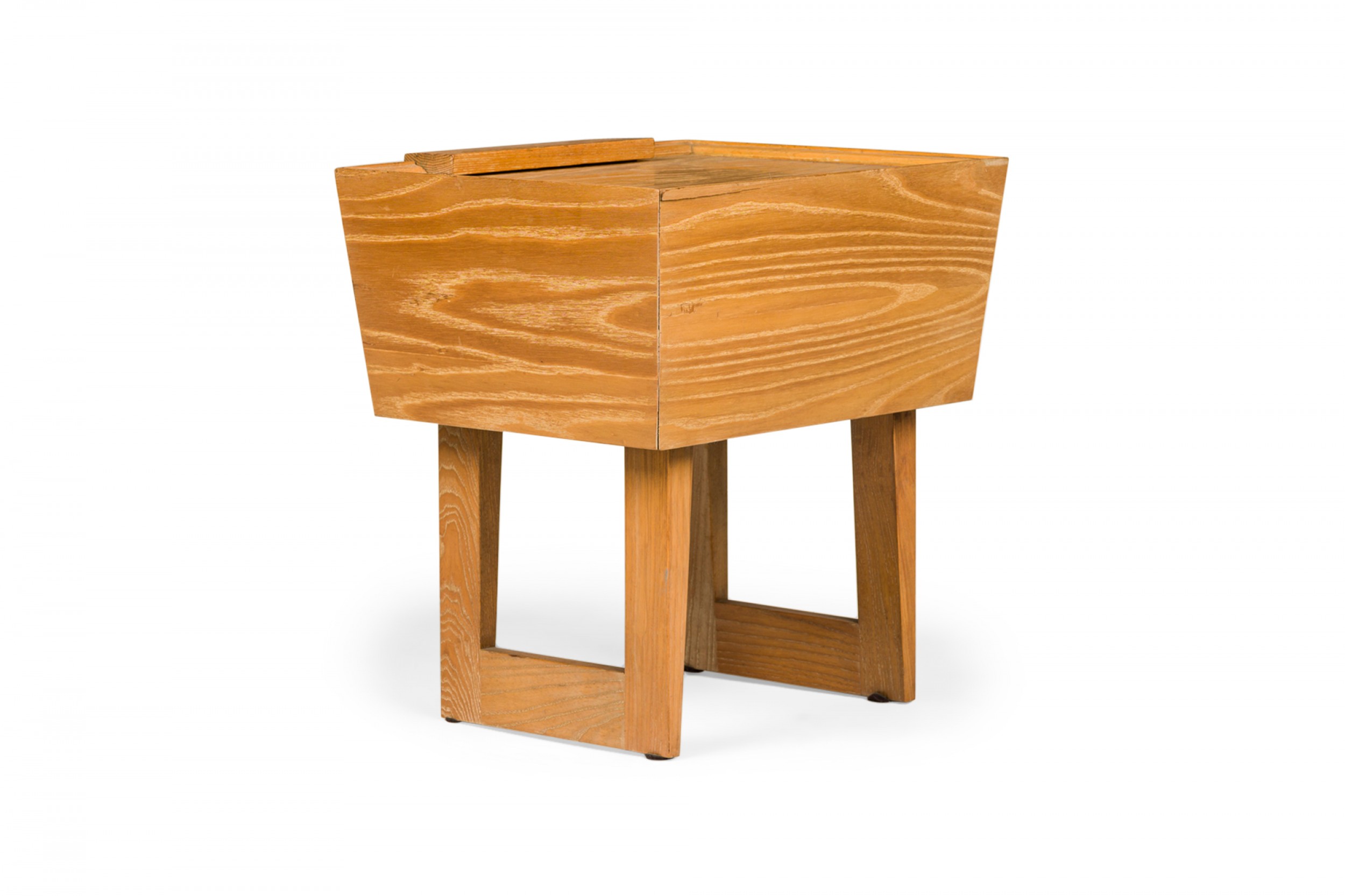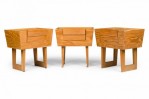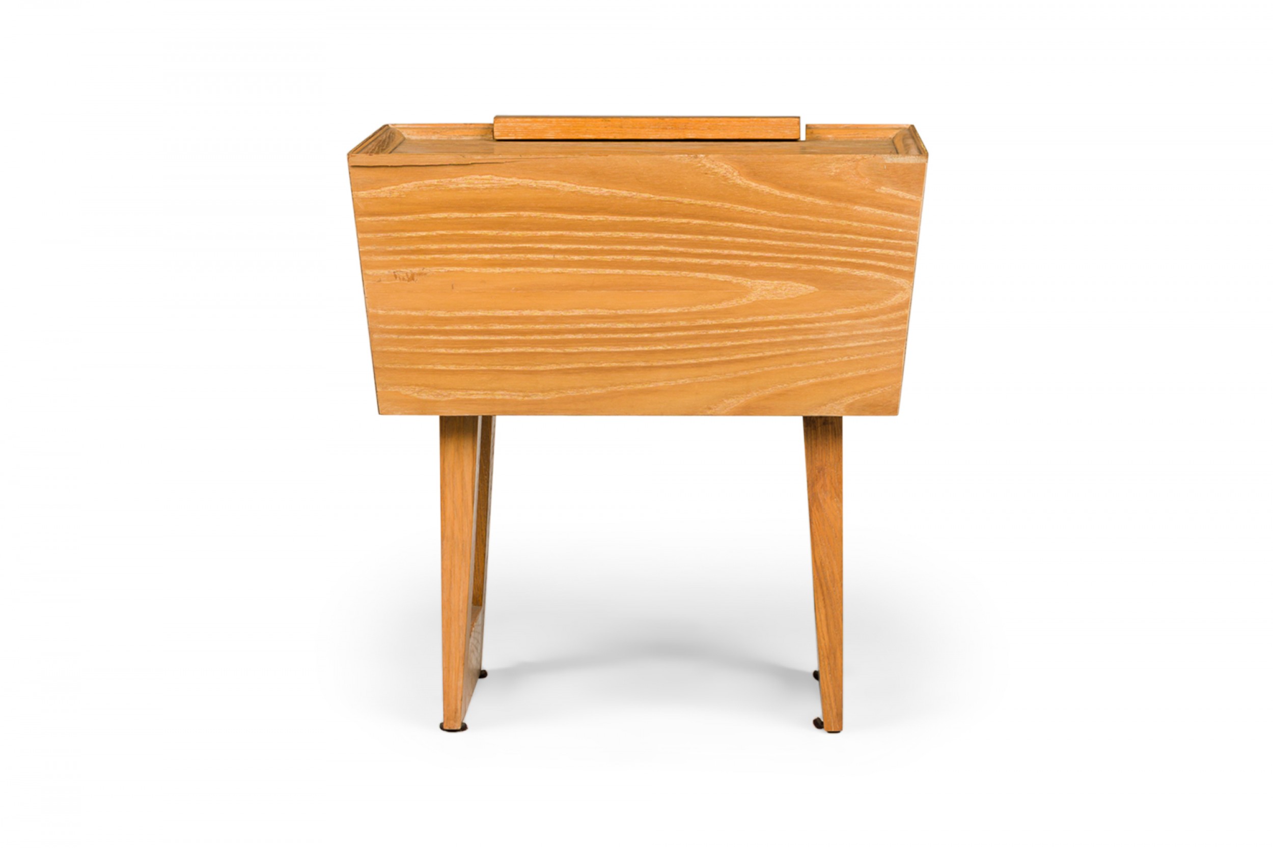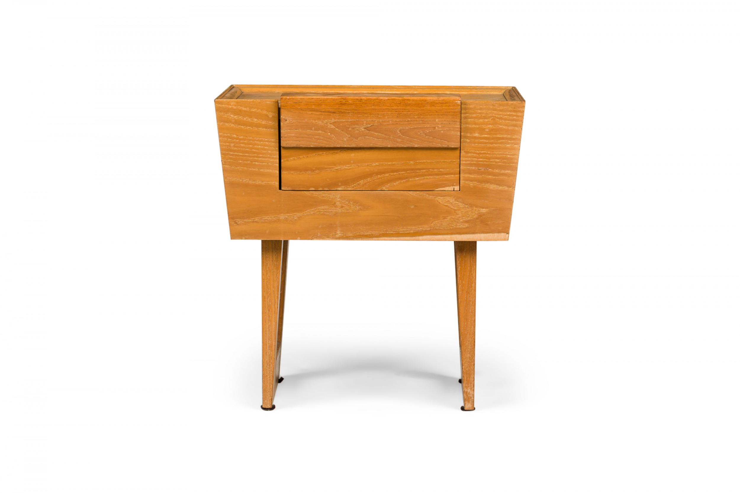 3 American Mid-Century wooden nightstands with a slightly cerused finish, tapered trapezoidal cabinets containing a single drawer, resting on two bracket-shaped legs. (PAUL LASZLO FOR BROWN SALTMAN)(PRICED EACH)
