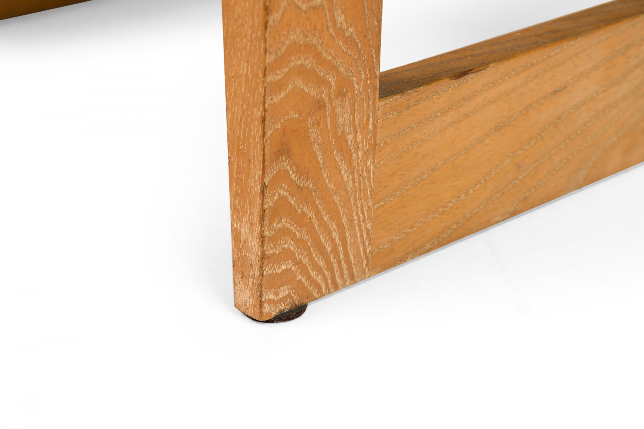3 American Mid-Century wooden nightstands with a slightly cerused finish, tapered trapezoidal cabinets containing a single drawer, resting on two bracket-shaped legs. (PAUL LASZLO FOR BROWN SALTMAN)(PRICED EACH).