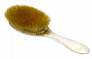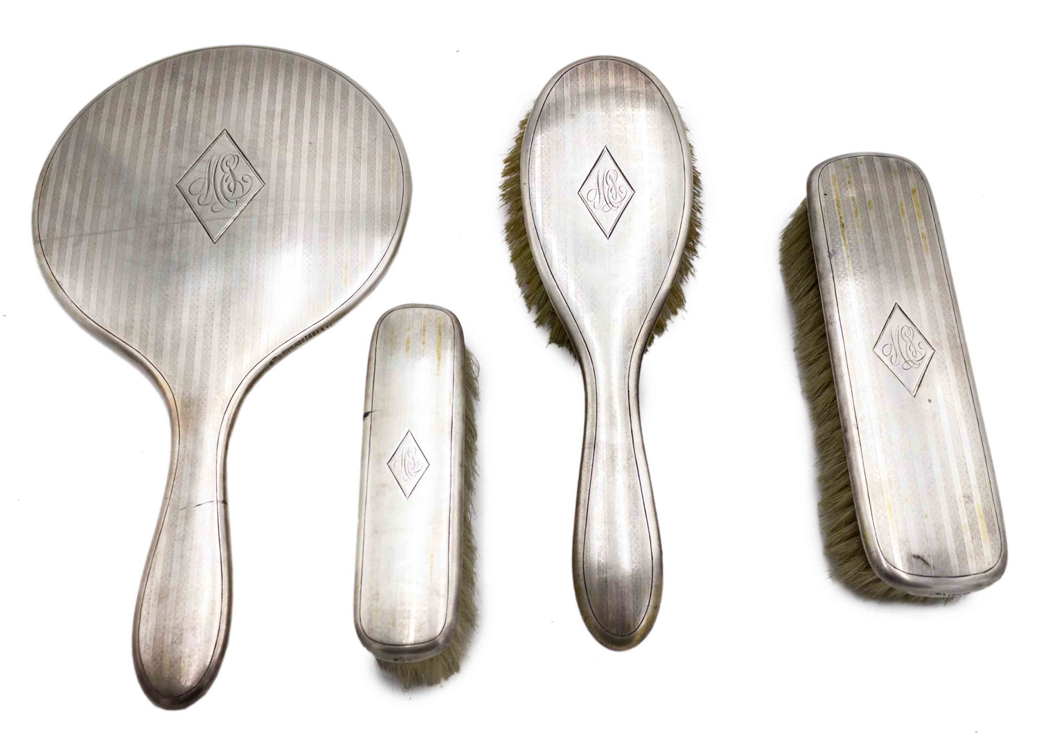 4-Piece American Victorian silver brush set with fluted design and initials engraved in diamond inset (3 brushes & mirror) (PRICED AS SET).