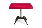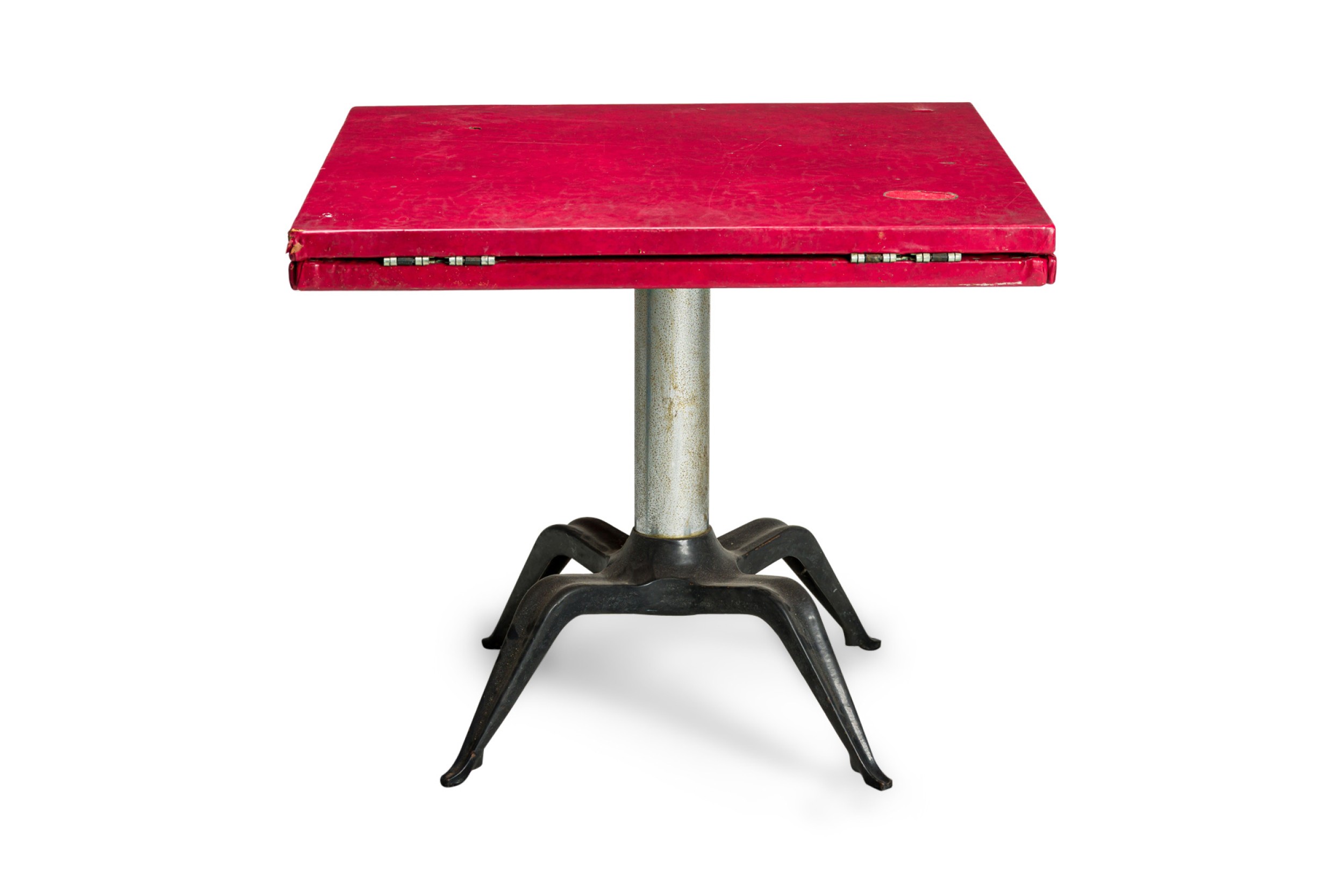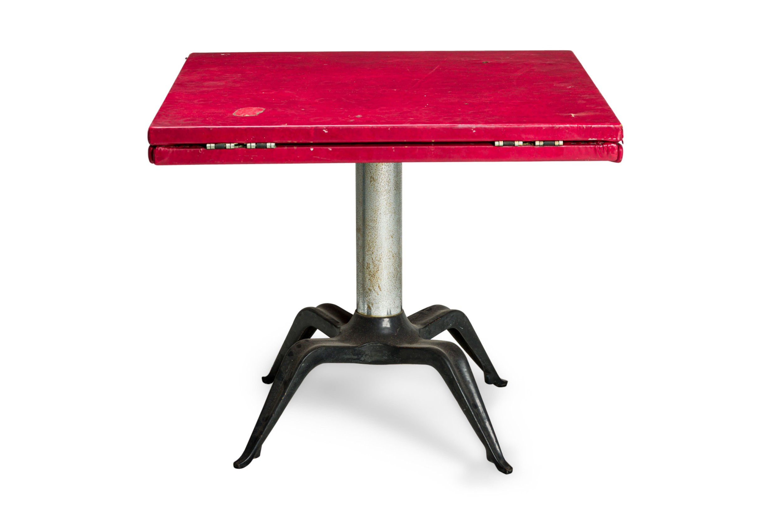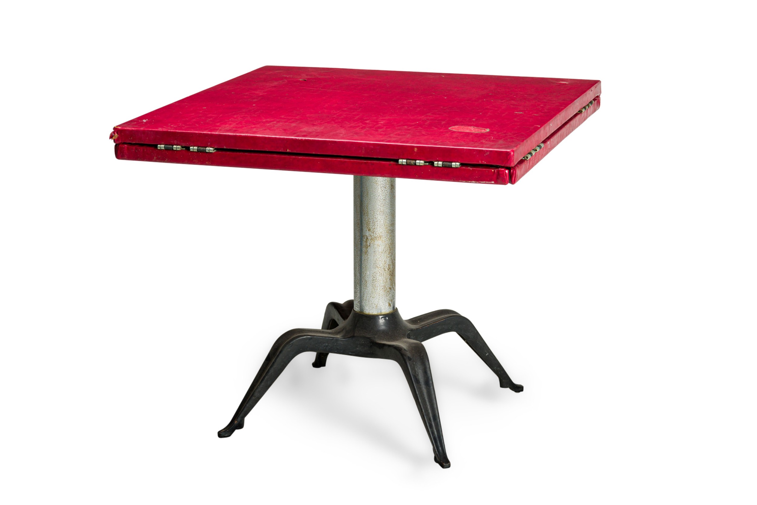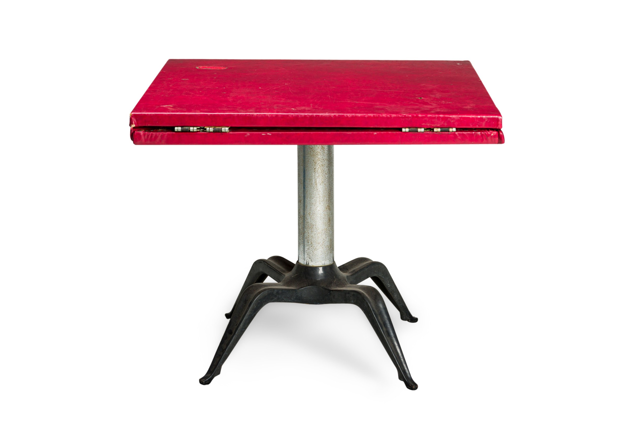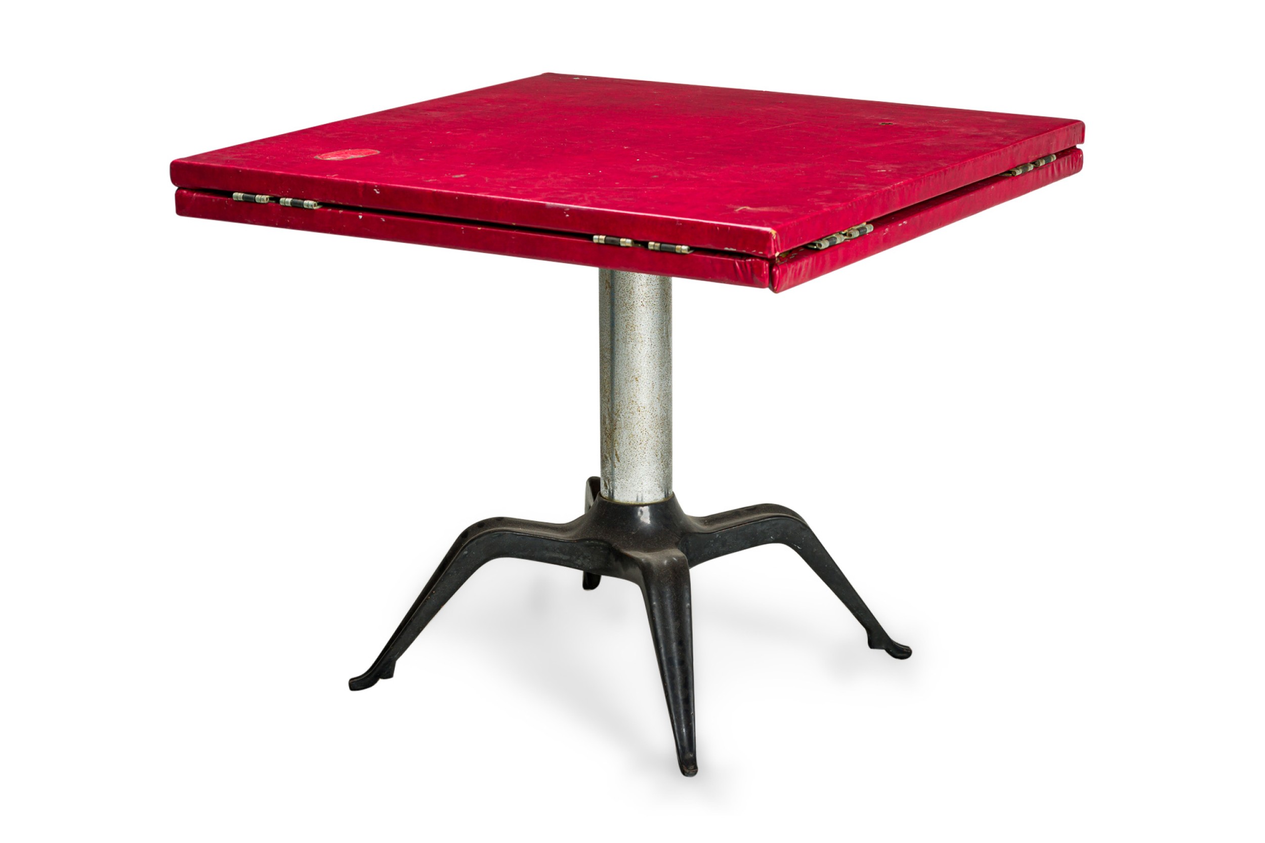 4 American Mid-Century round red vinyl square dining / cafe tables having 4 fold-out table extension creating a larger round table top resting on a steel pedestal base over 4 black iron legs (PRICED EACH)