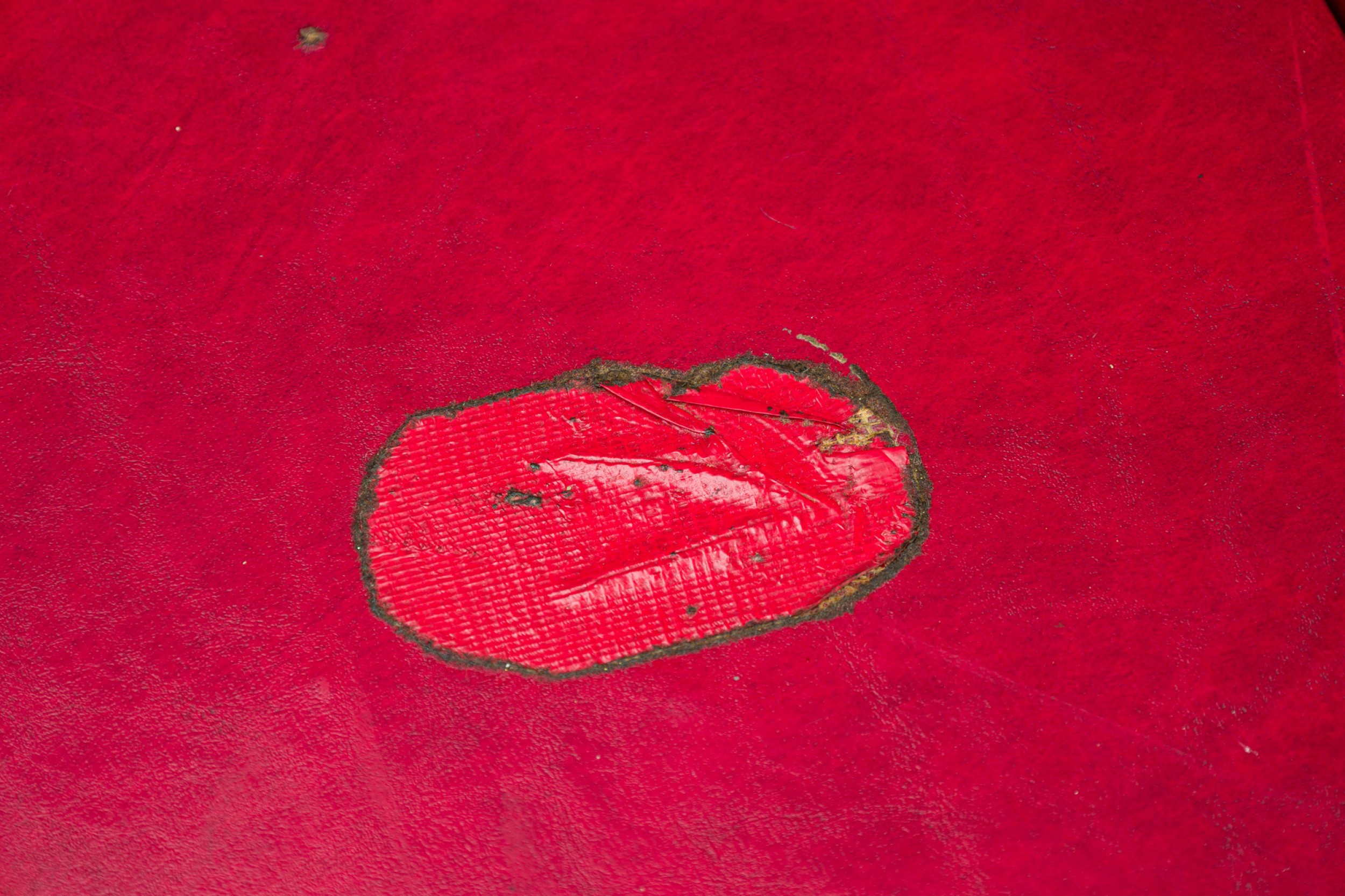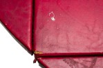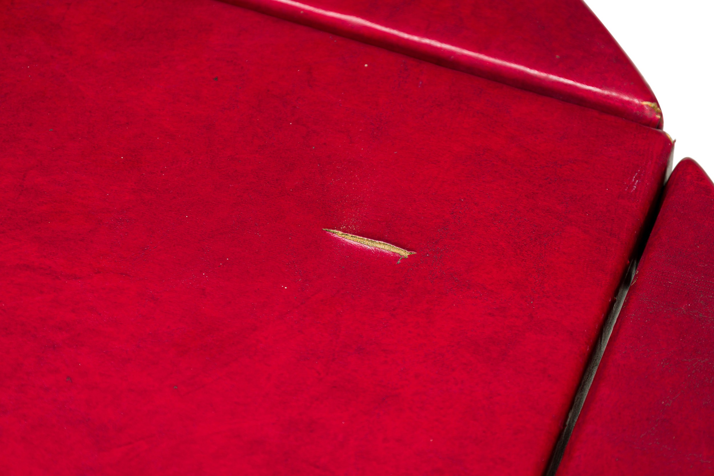 4 American Mid-Century round red vinyl square dining / cafe tables having 4 fold-out table extension creating a larger round table top resting on a steel pedestal base over 4 black iron legs (PRICED EACH).