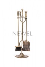 Contemporary 4-piece set of pewter-tone metal fire tools comprised of a shovel, tong and brush, all with molded turned handles topped by ball finials, resting on a square based stand with concave cutout corners. (PRICED AS SET)