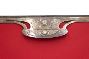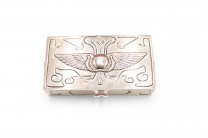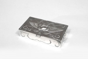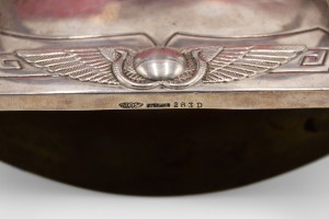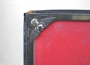 English Arts & Crafts 6 piece sterling silver desk set with Egyptian scarabs and wing design. Desk pad, inkwell, pen tray, stamp box, roll blotter, letter holder. (PRICED AS SET).