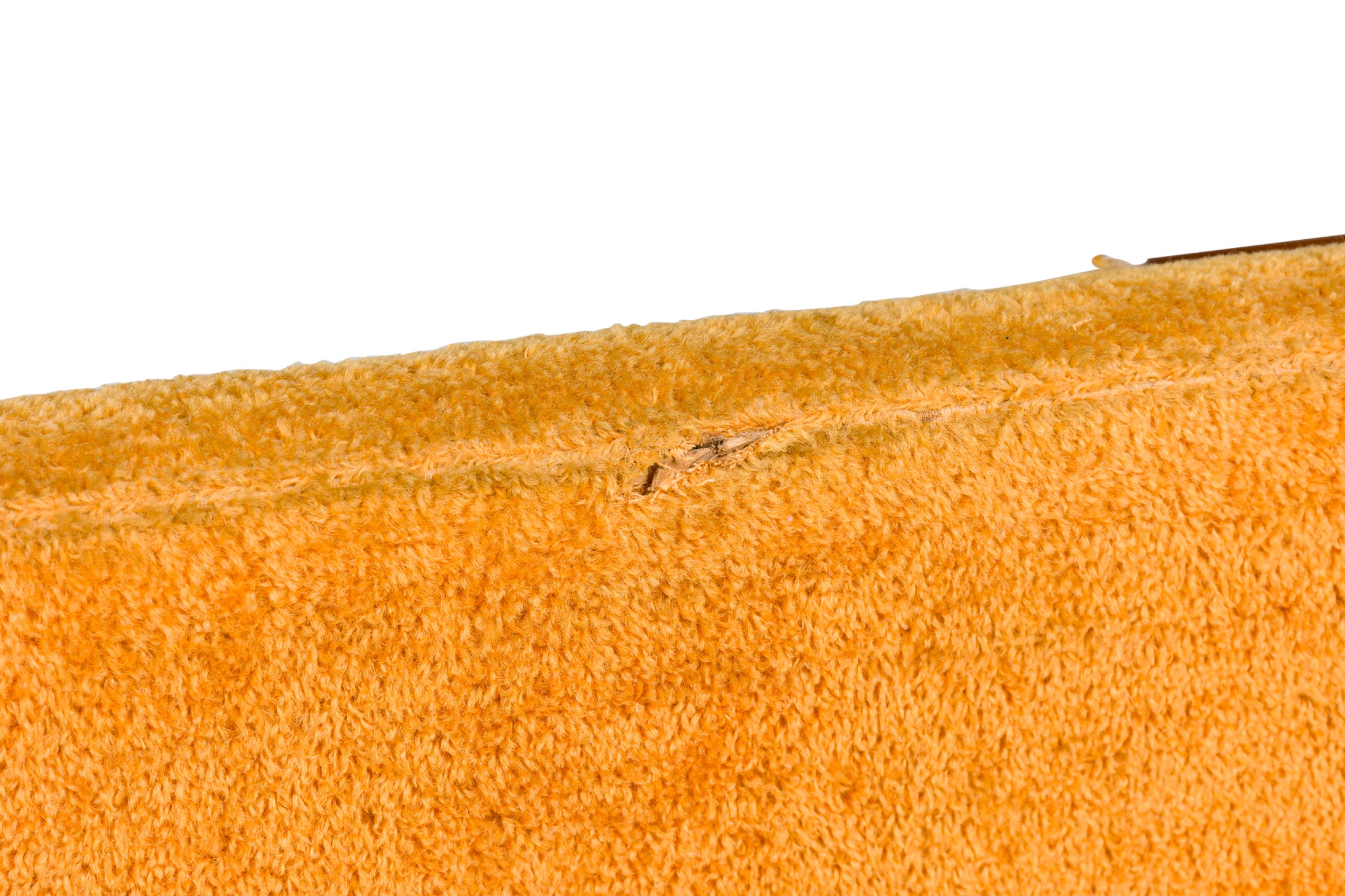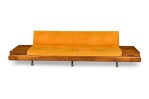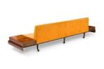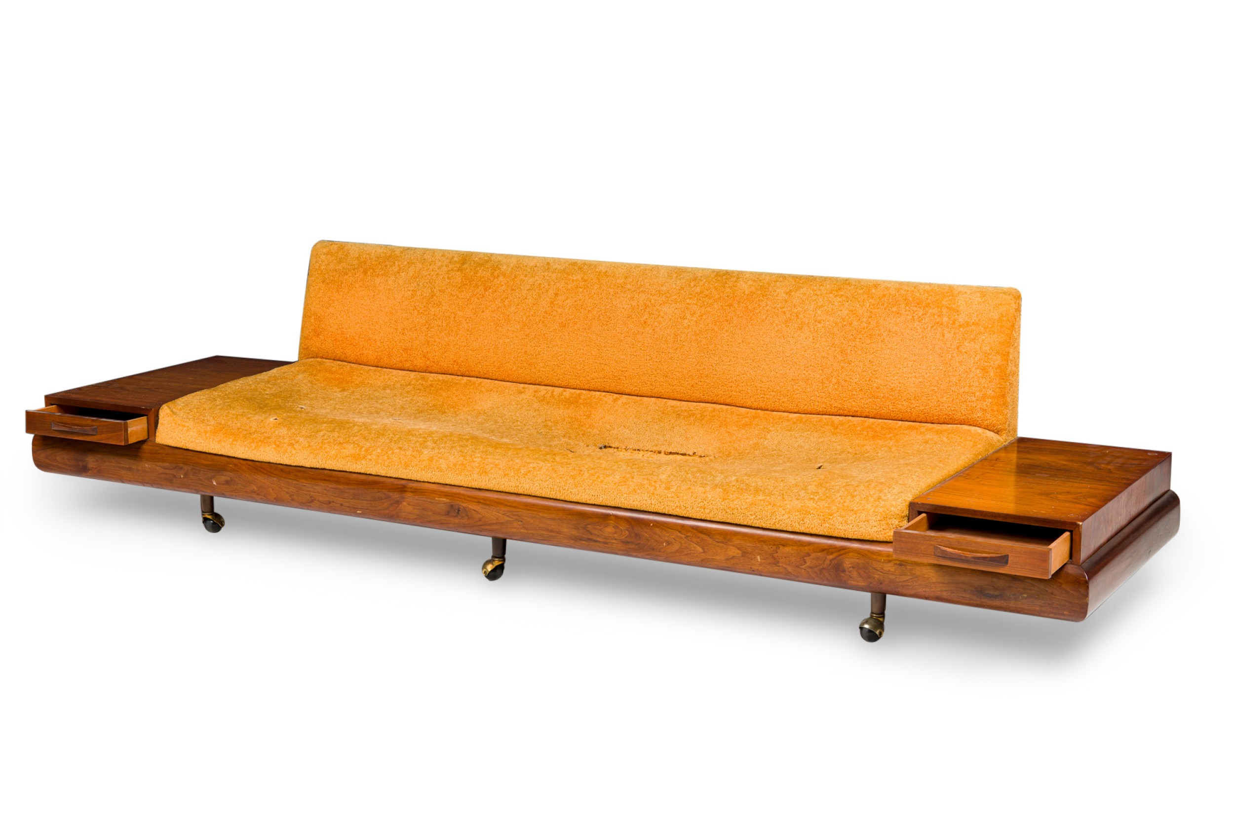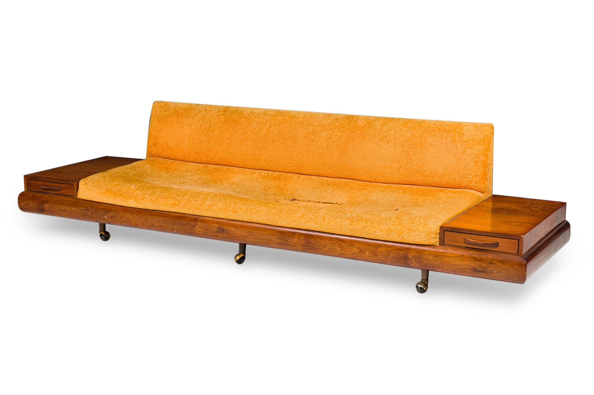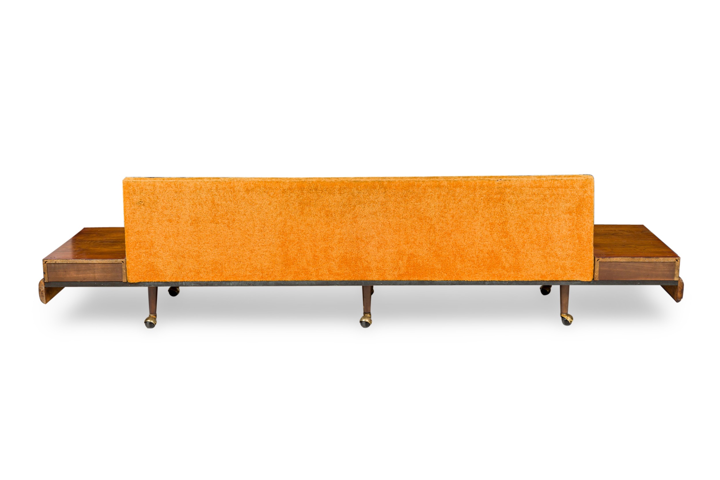 American Mid-Century orange nap upholstered platform sofa with floating walnut frame and end tables on both sides (ADRIAN PEARSALL)