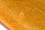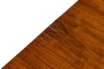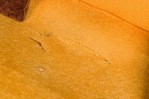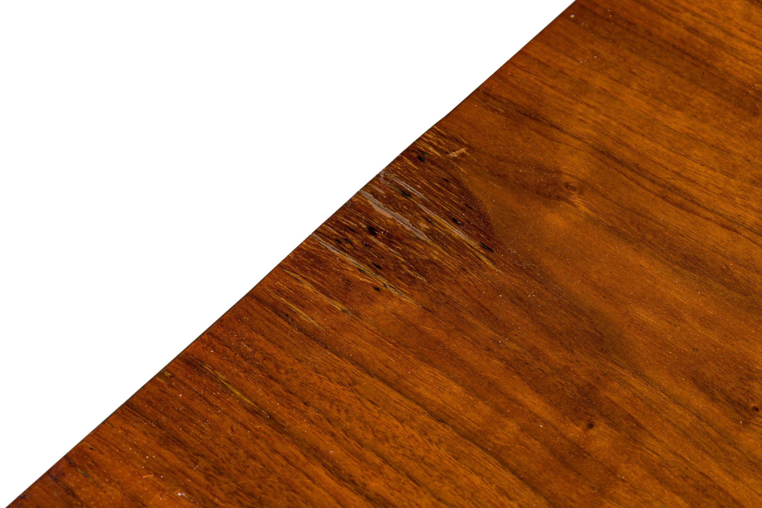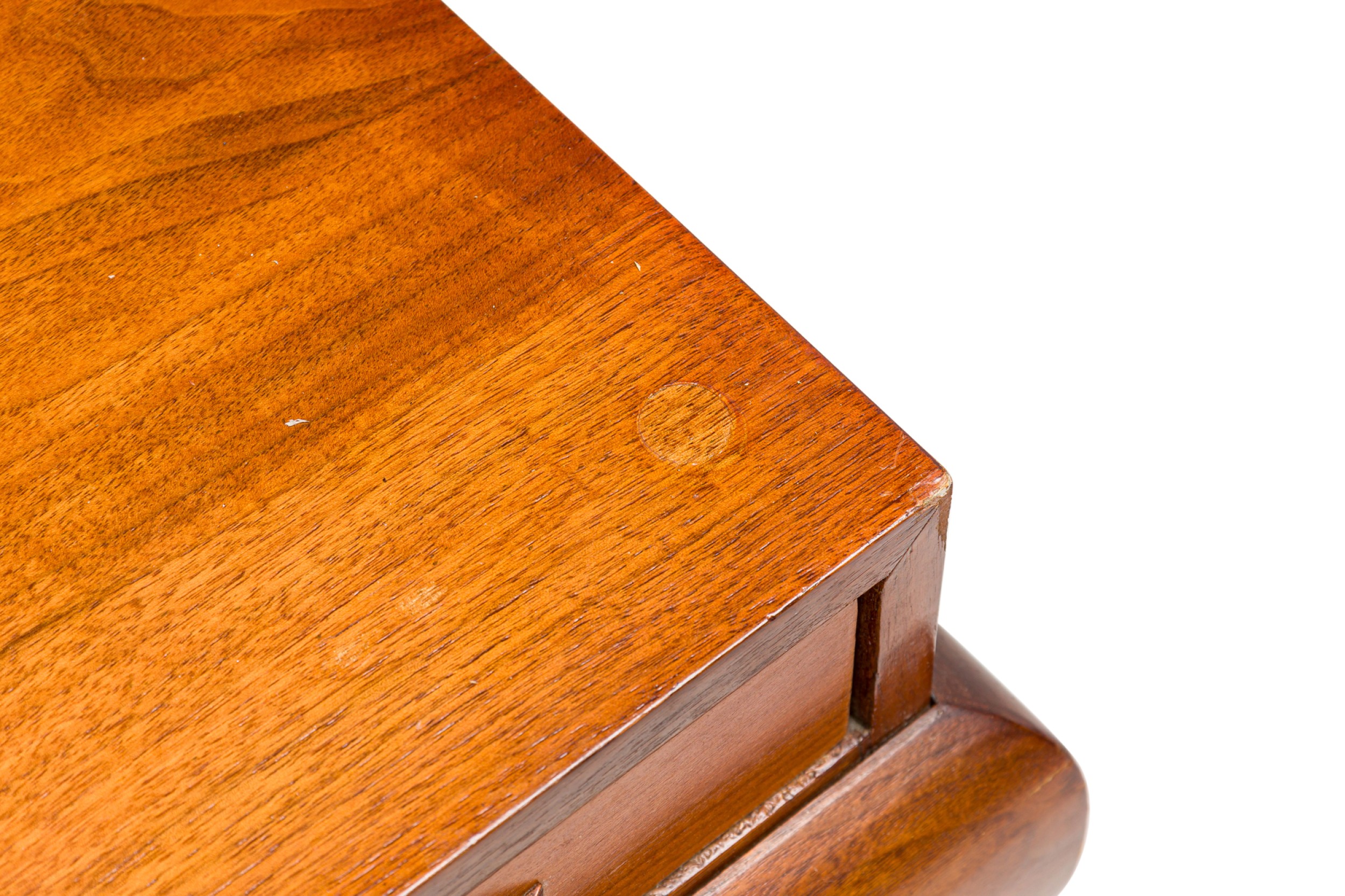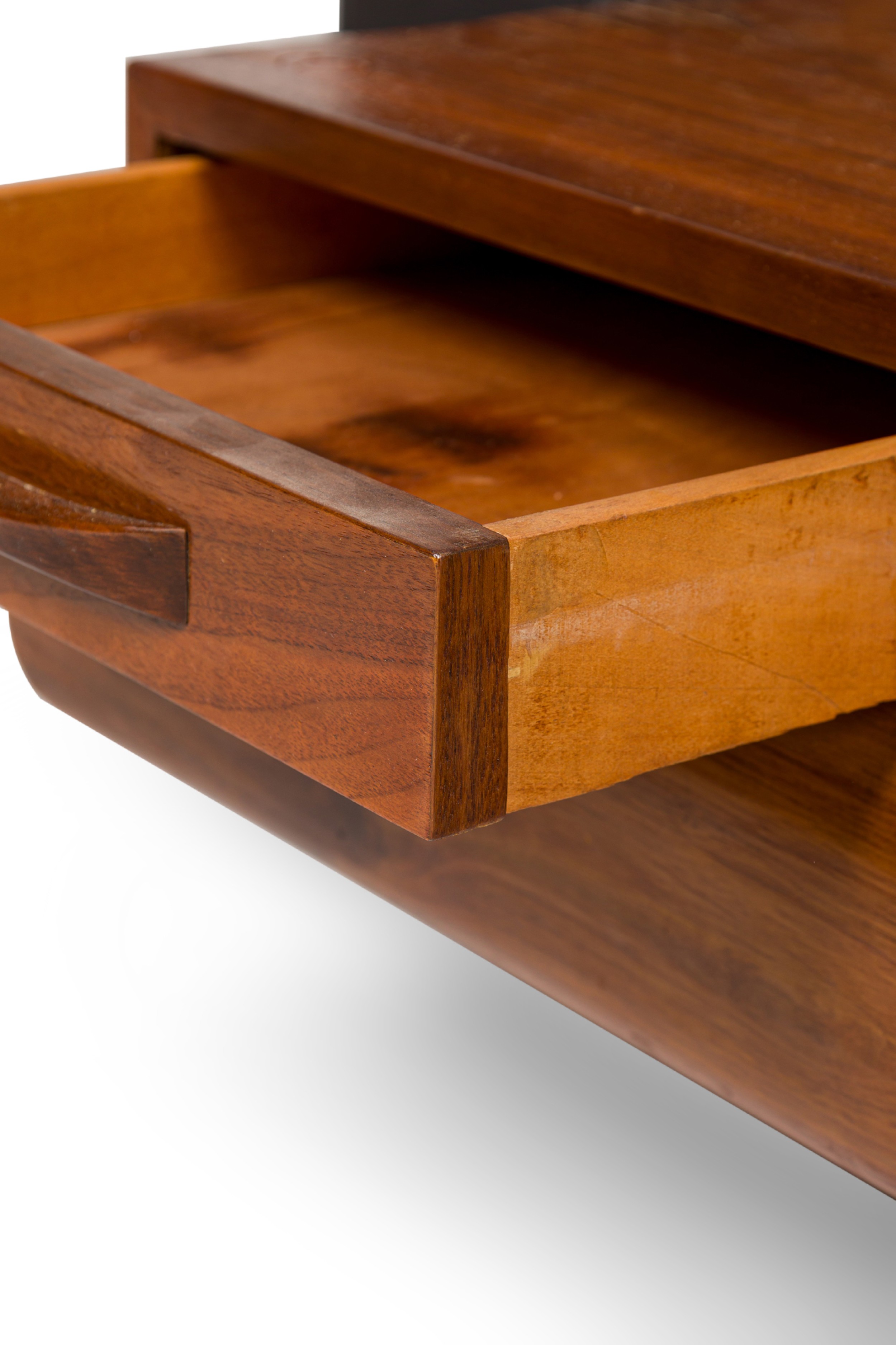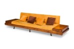 American Mid-Century orange nap upholstered platform sofa with floating walnut frame and end tables on both sides (ADRIAN PEARSALL)