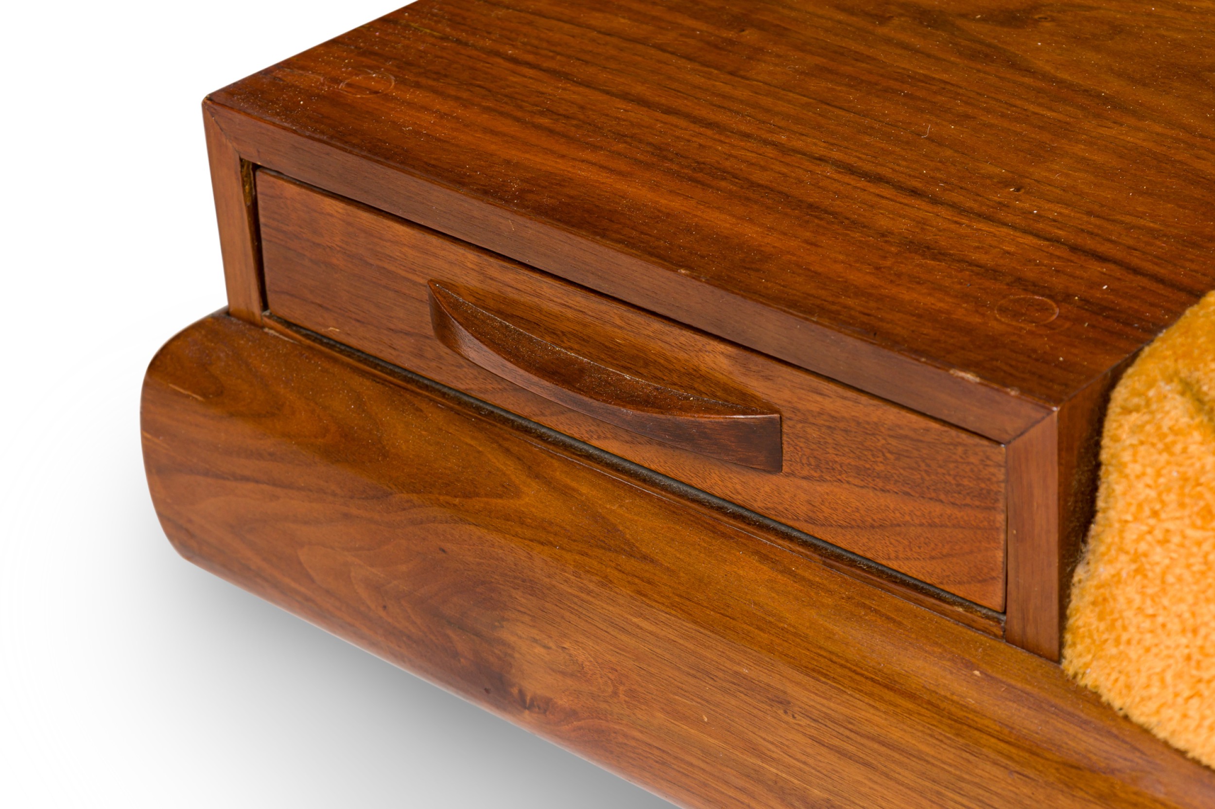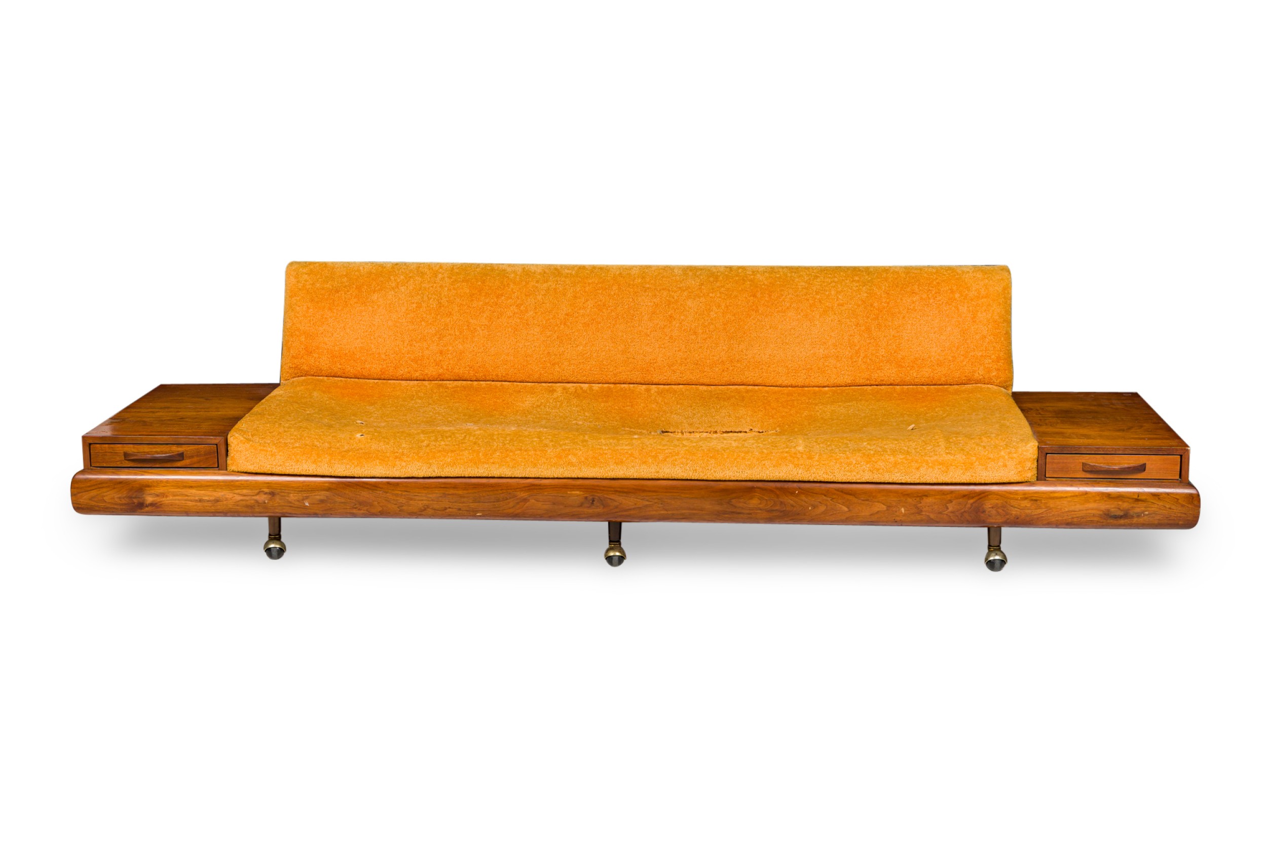 American Mid-Century orange nap upholstered platform sofa with floating walnut frame and end tables on both sides (ADRIAN PEARSALL).