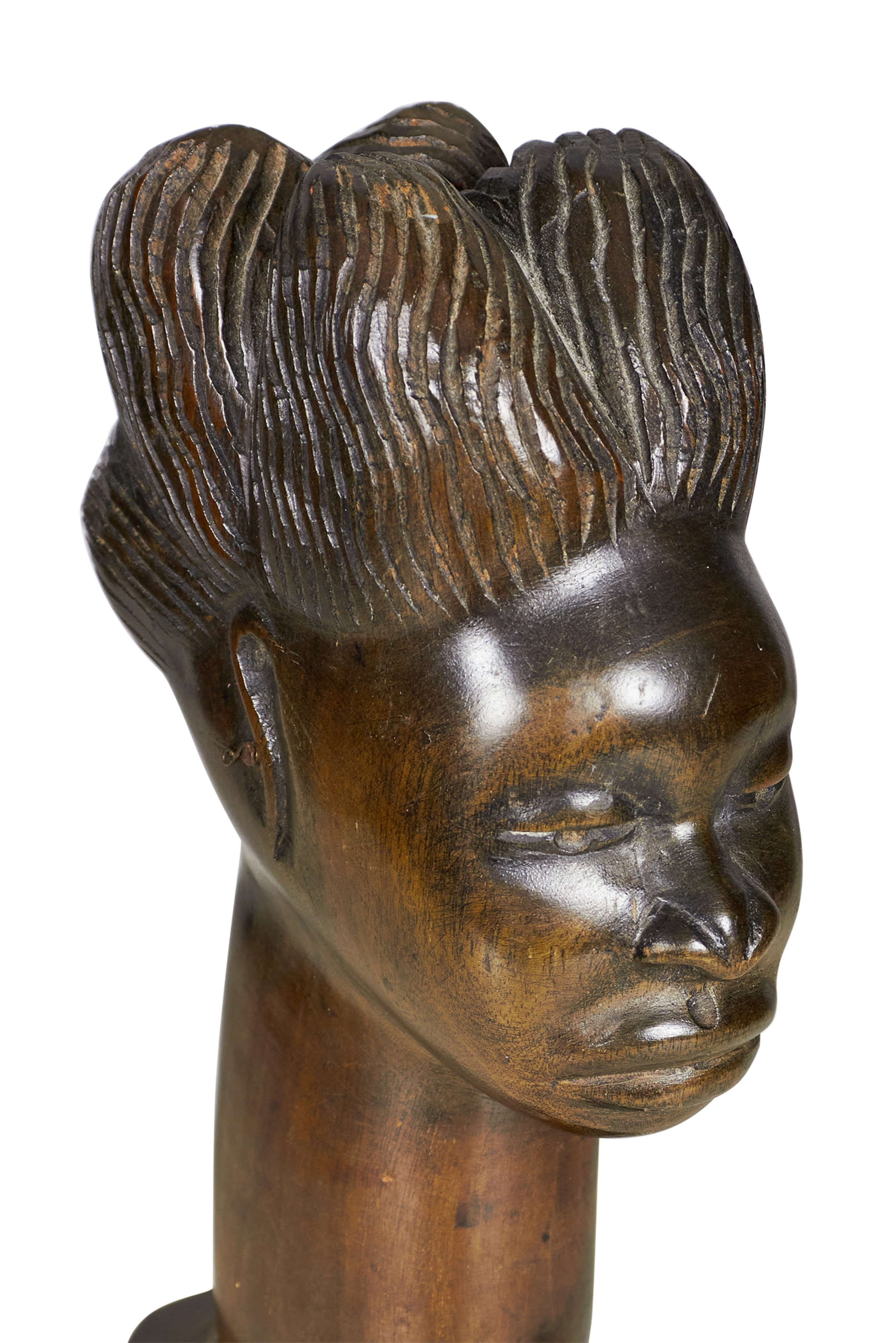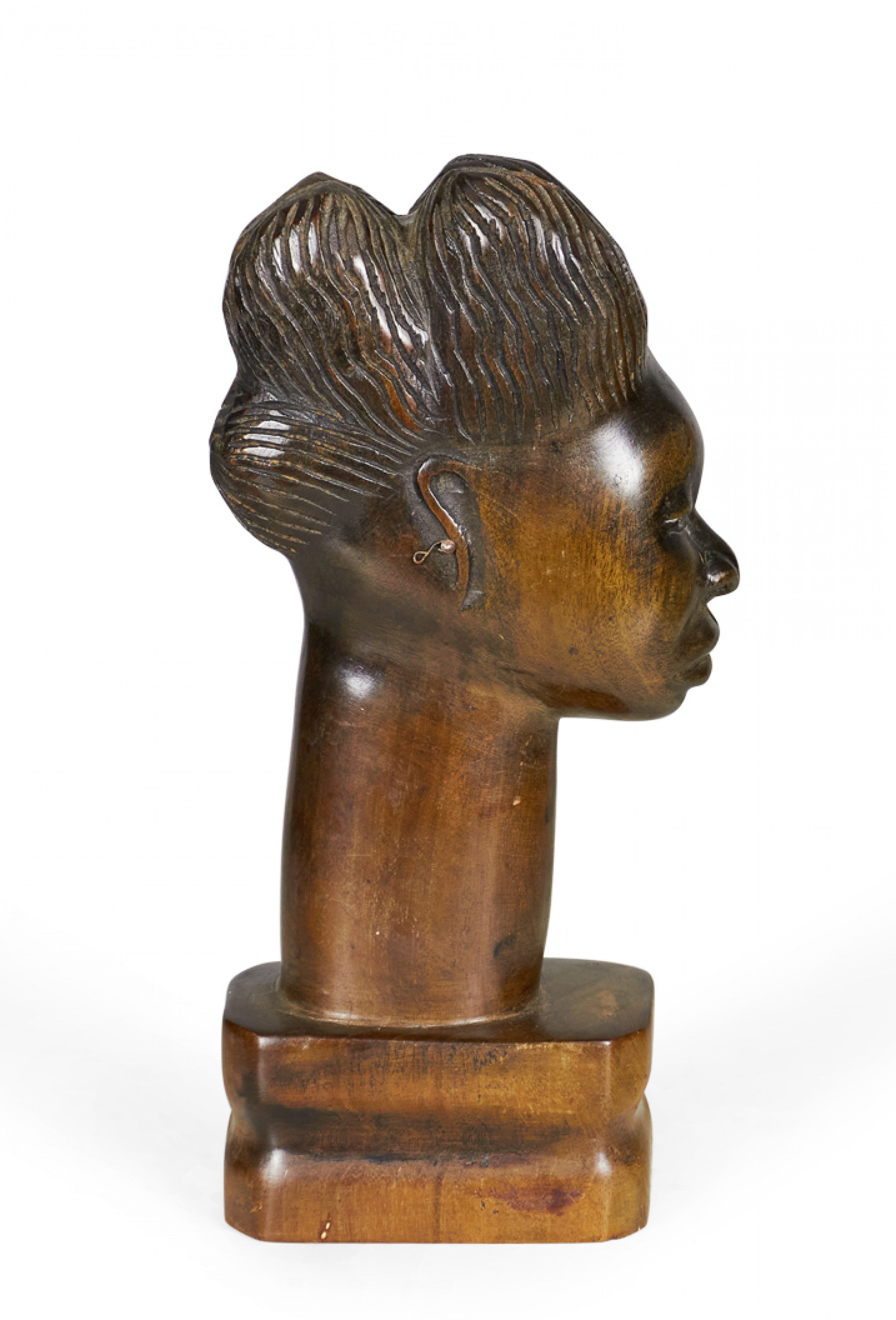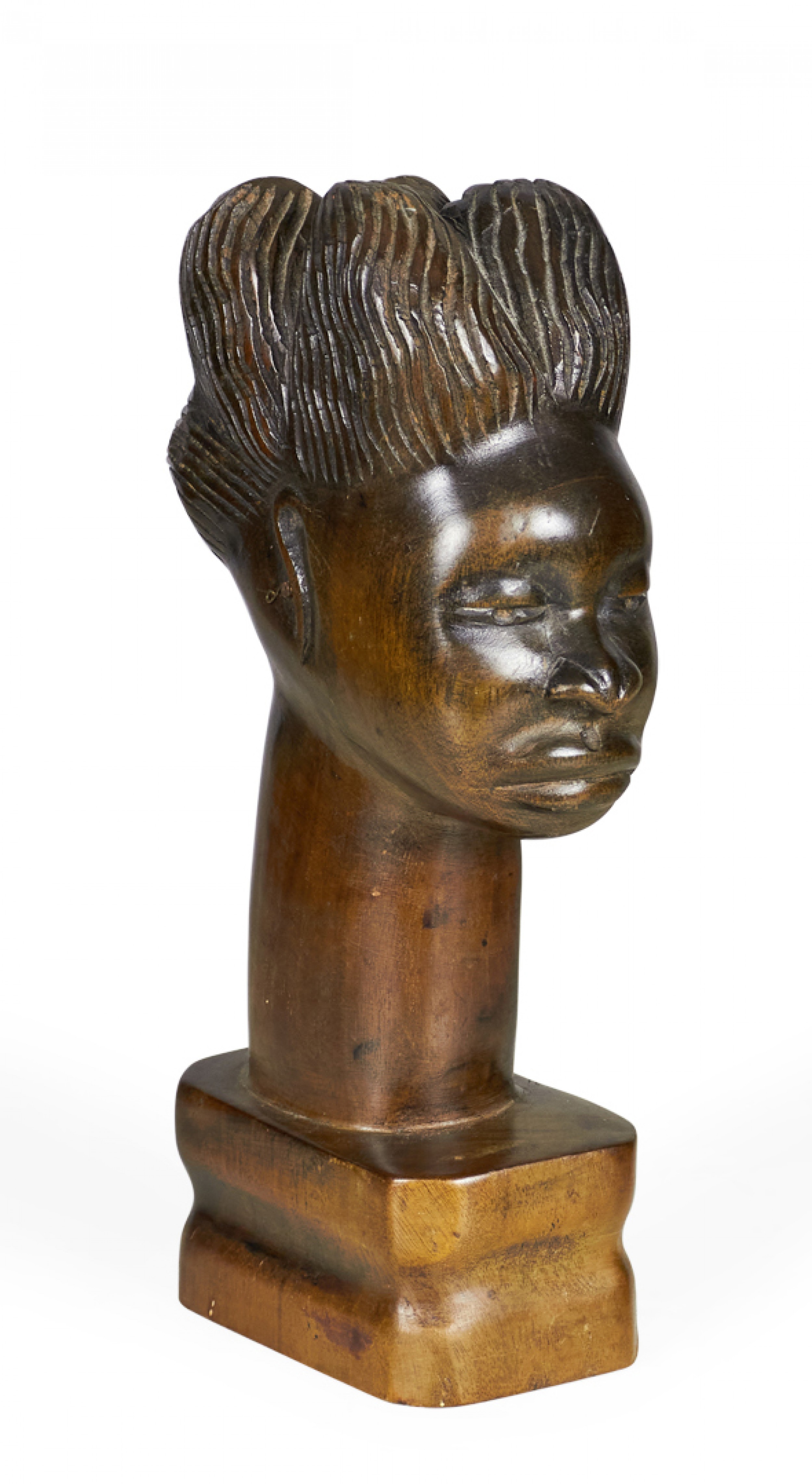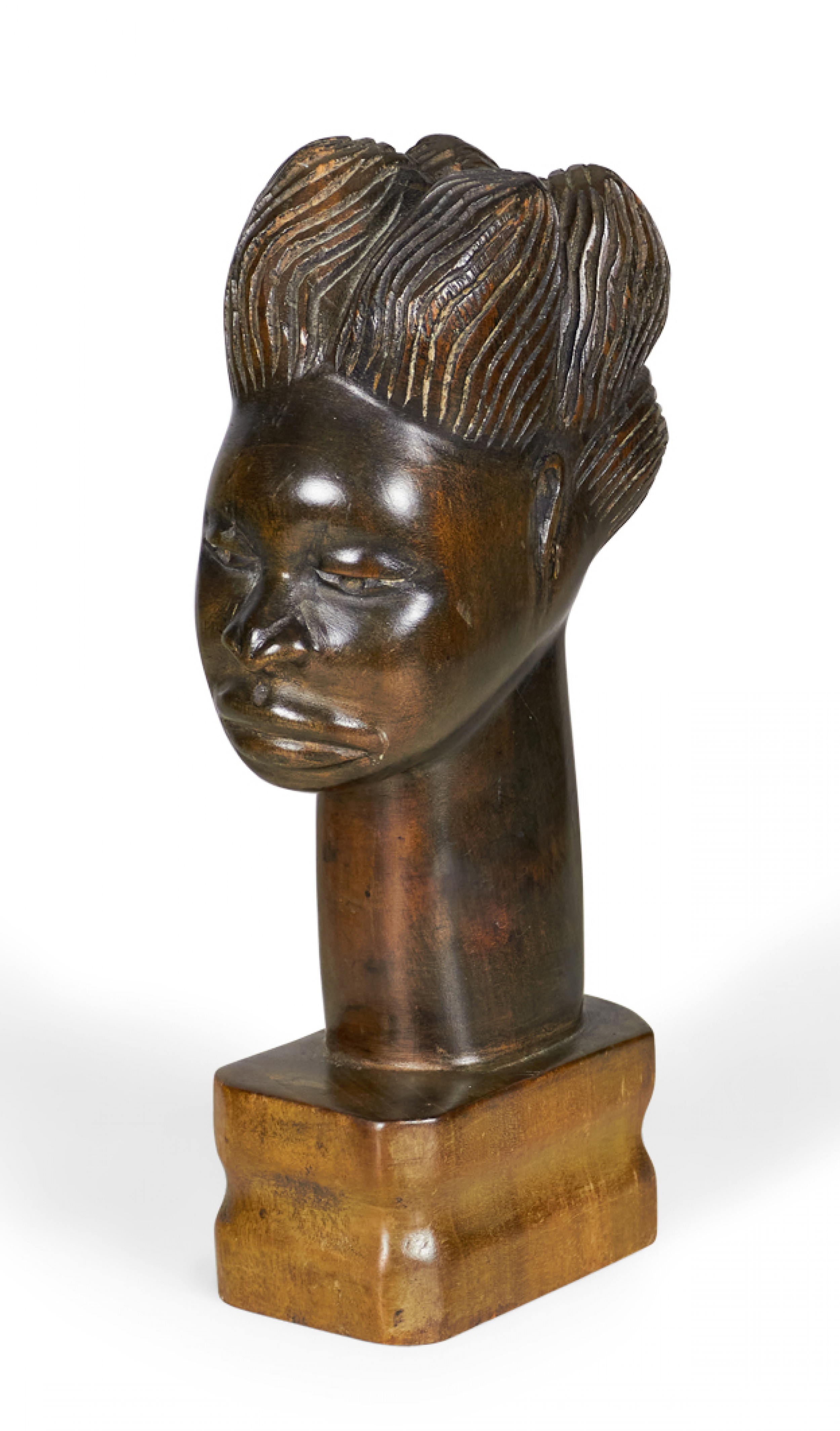 African (possibly Maasai/Kenyan) carved wooden bust depicting a woman with elaborately carved hair and an elongated neck on a carved square wooden base..
