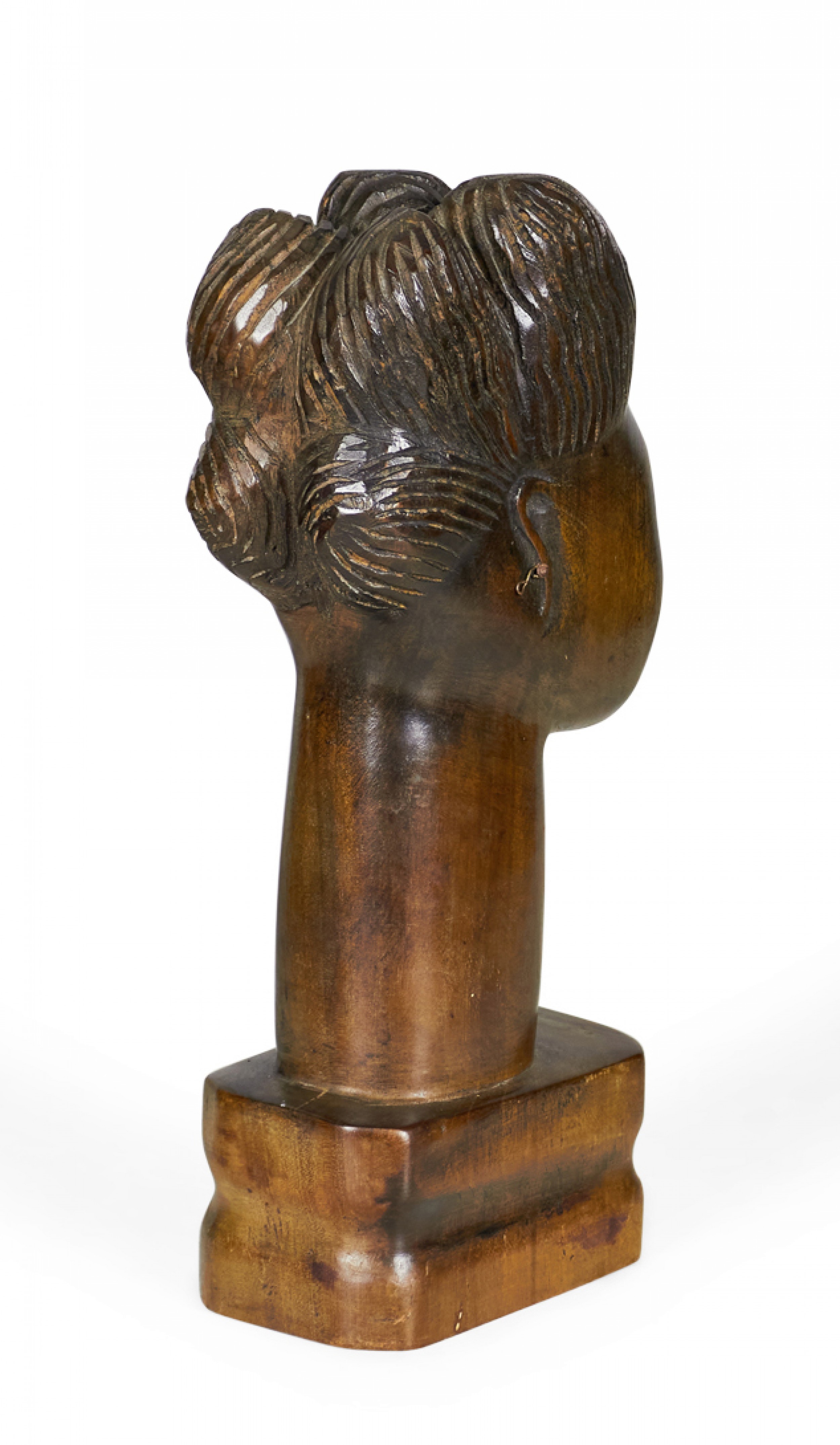 African (possibly Maasai/Kenyan) carved wooden bust depicting a woman with elaborately carved hair and an elongated neck on a carved square wooden base.