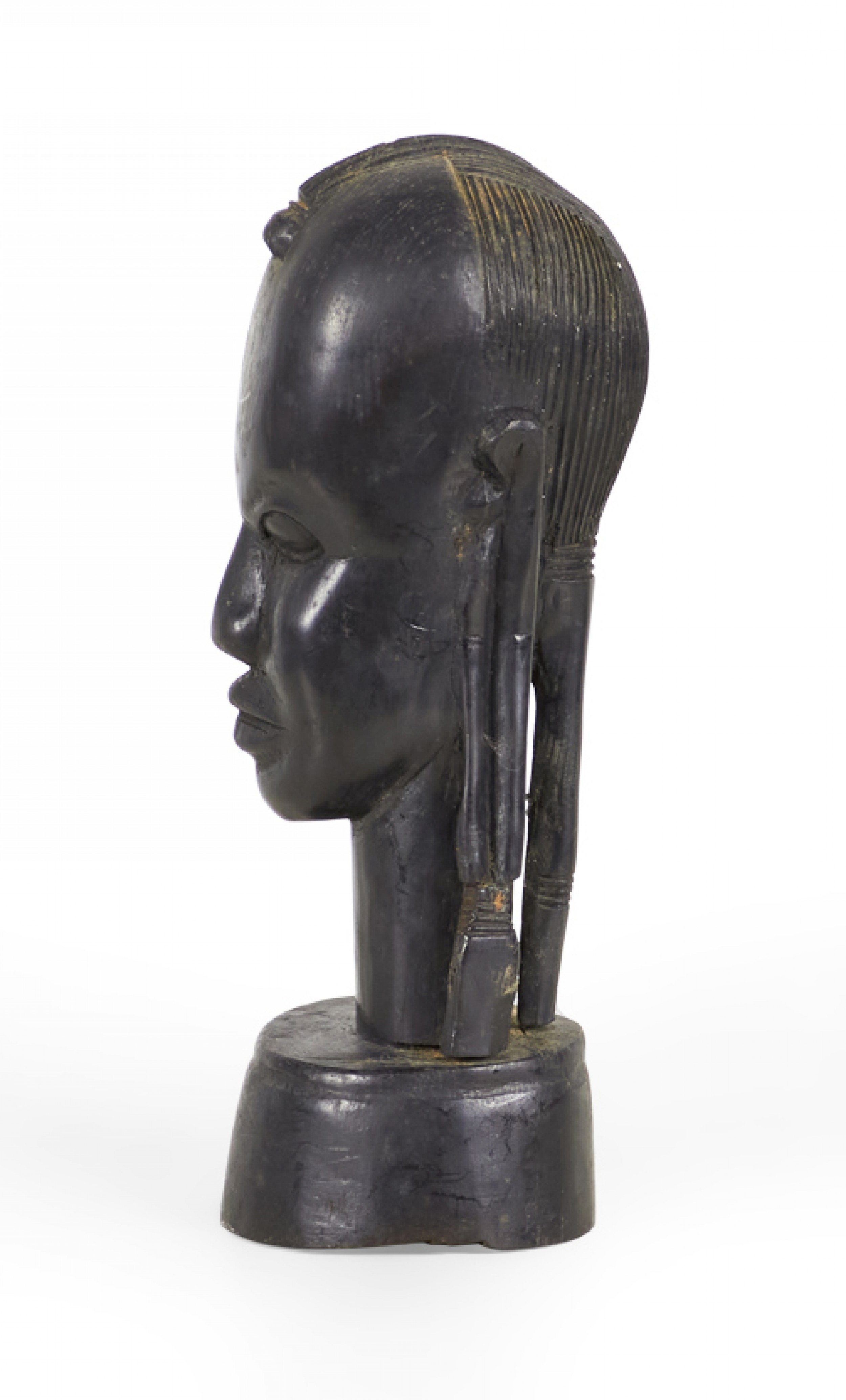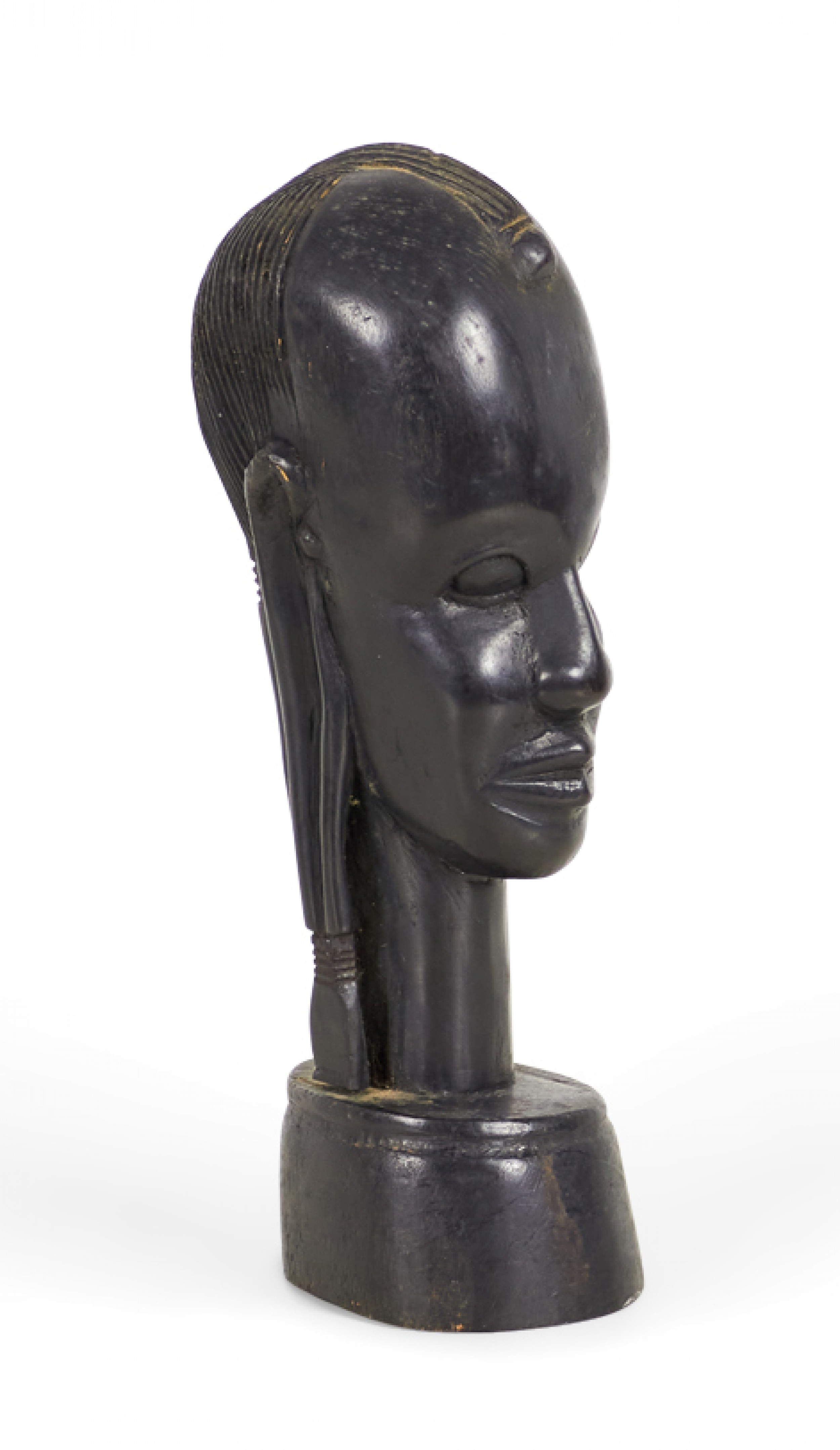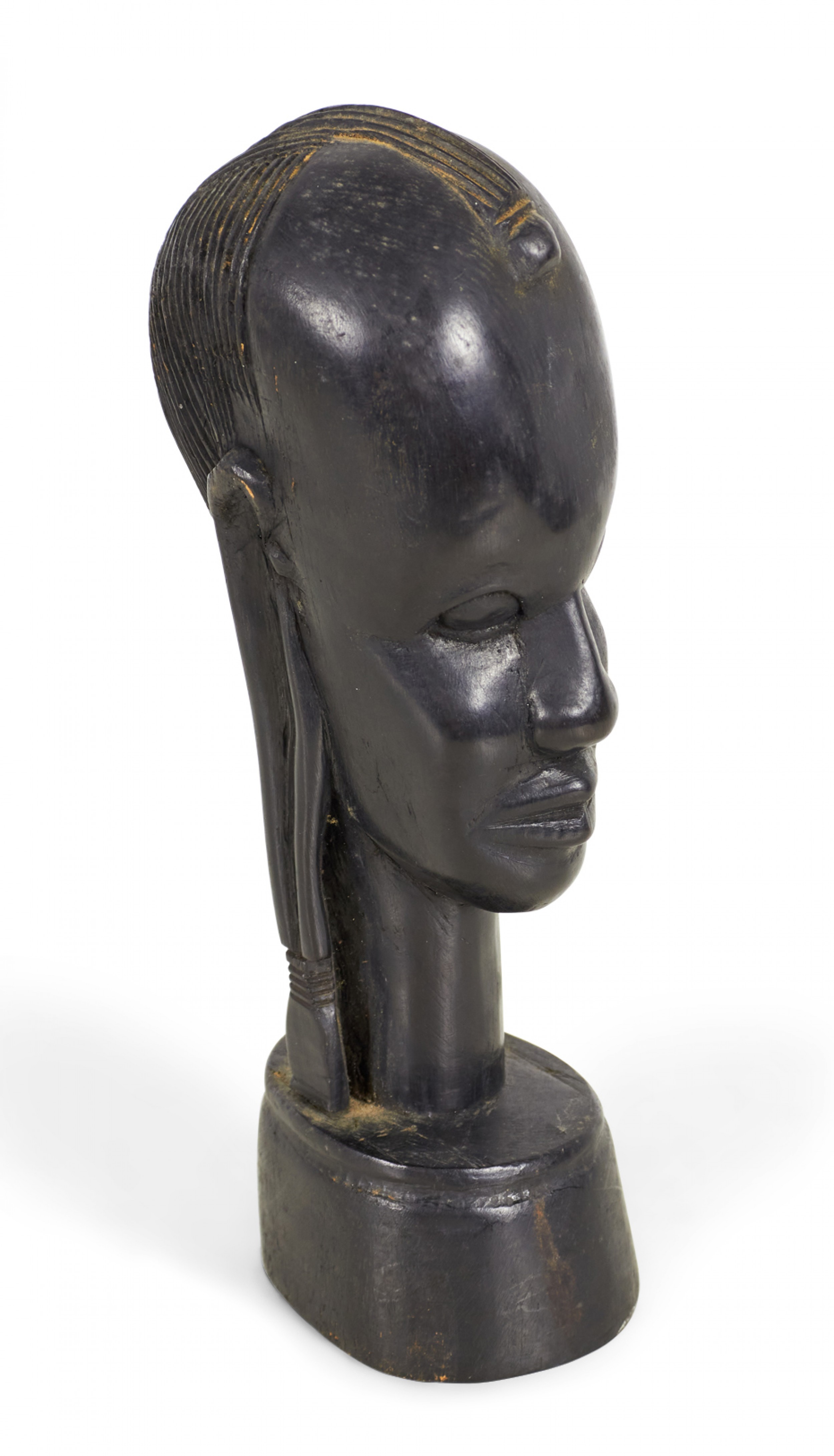 African Maasai (Kenyan or Tanzanian) carved ebony wood bust with a bulbous forehead and geometrically carved hair and jewelry on an an oval carved base..