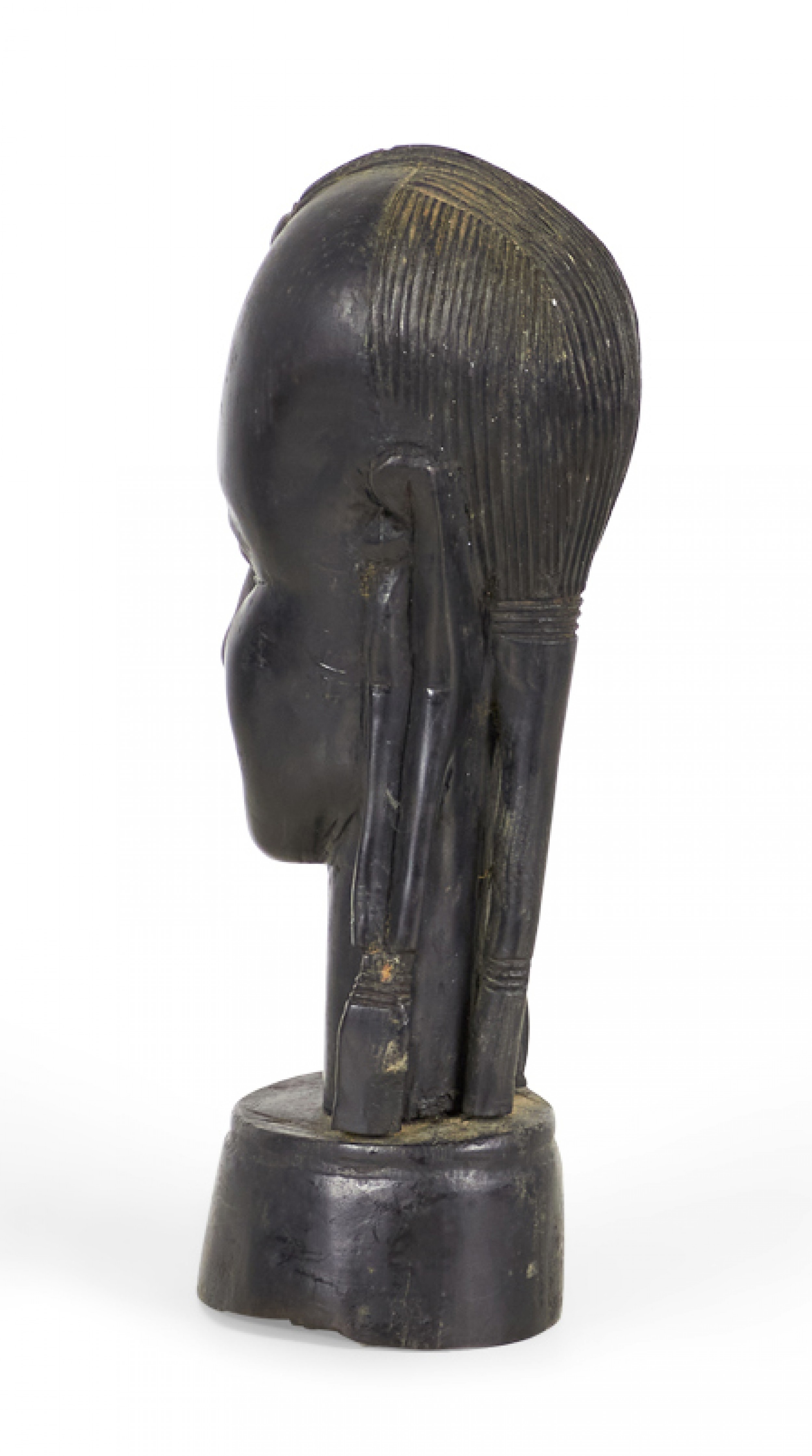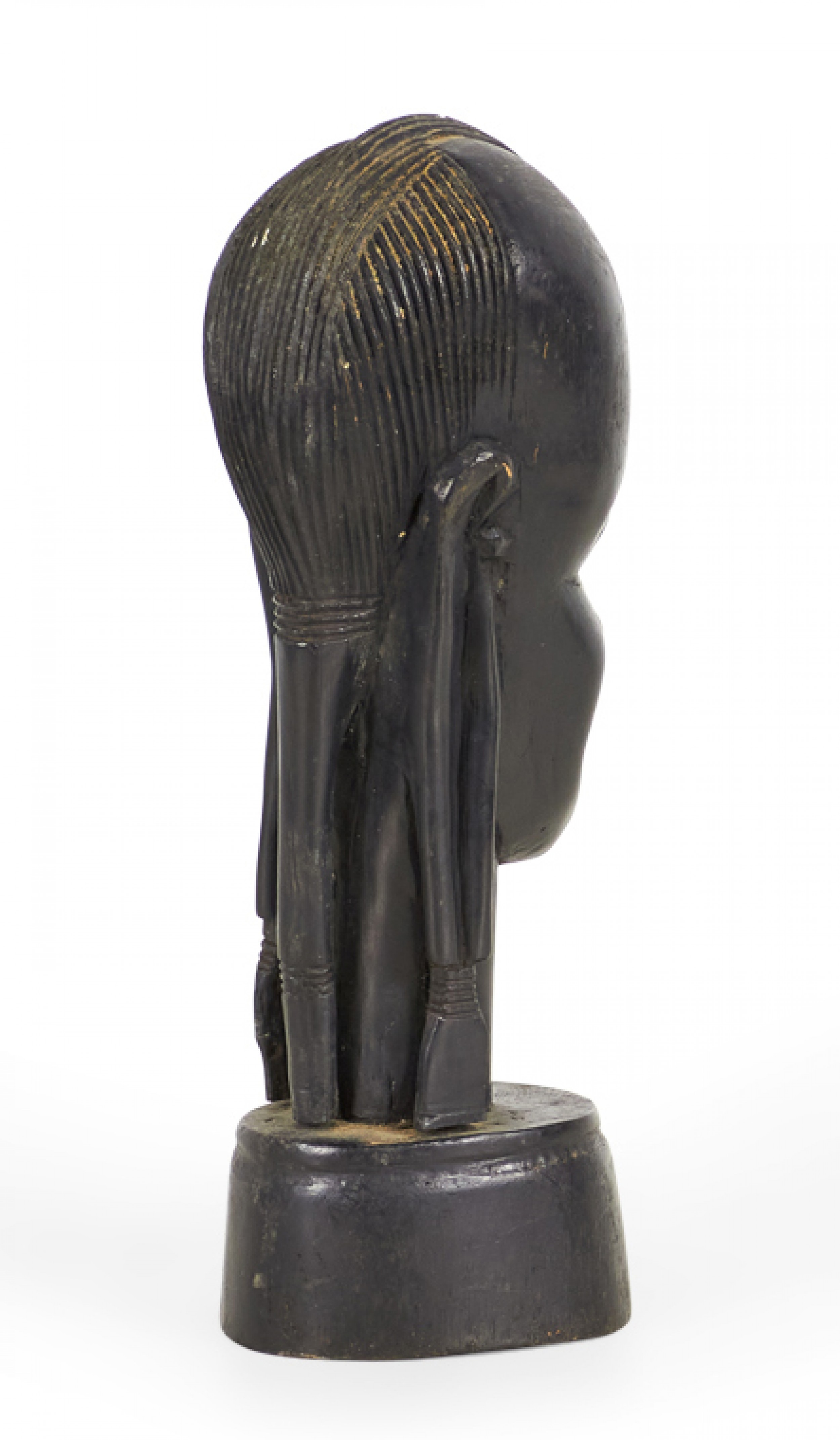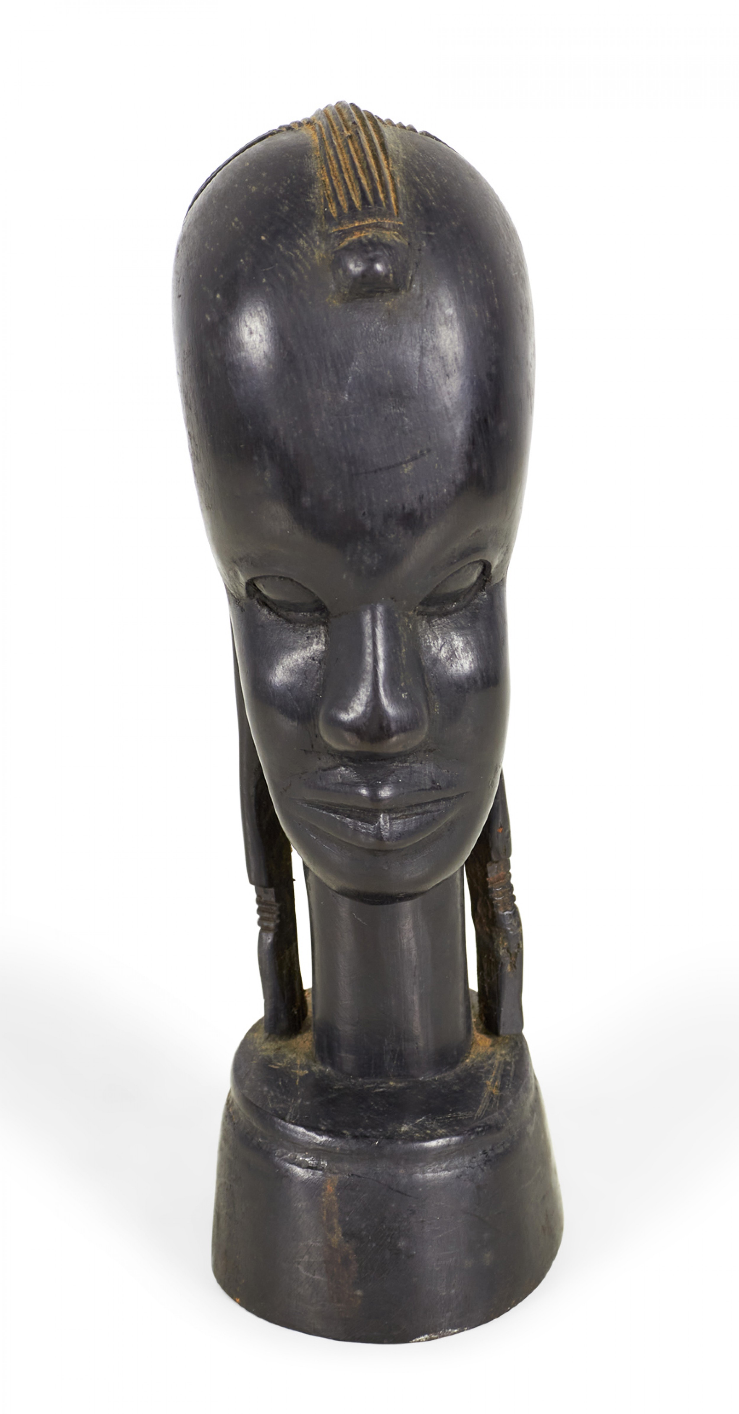 African Maasai (Kenyan or Tanzanian) carved ebony wood bust with a bulbous forehead and geometrically carved hair and jewelry on an an oval carved base..