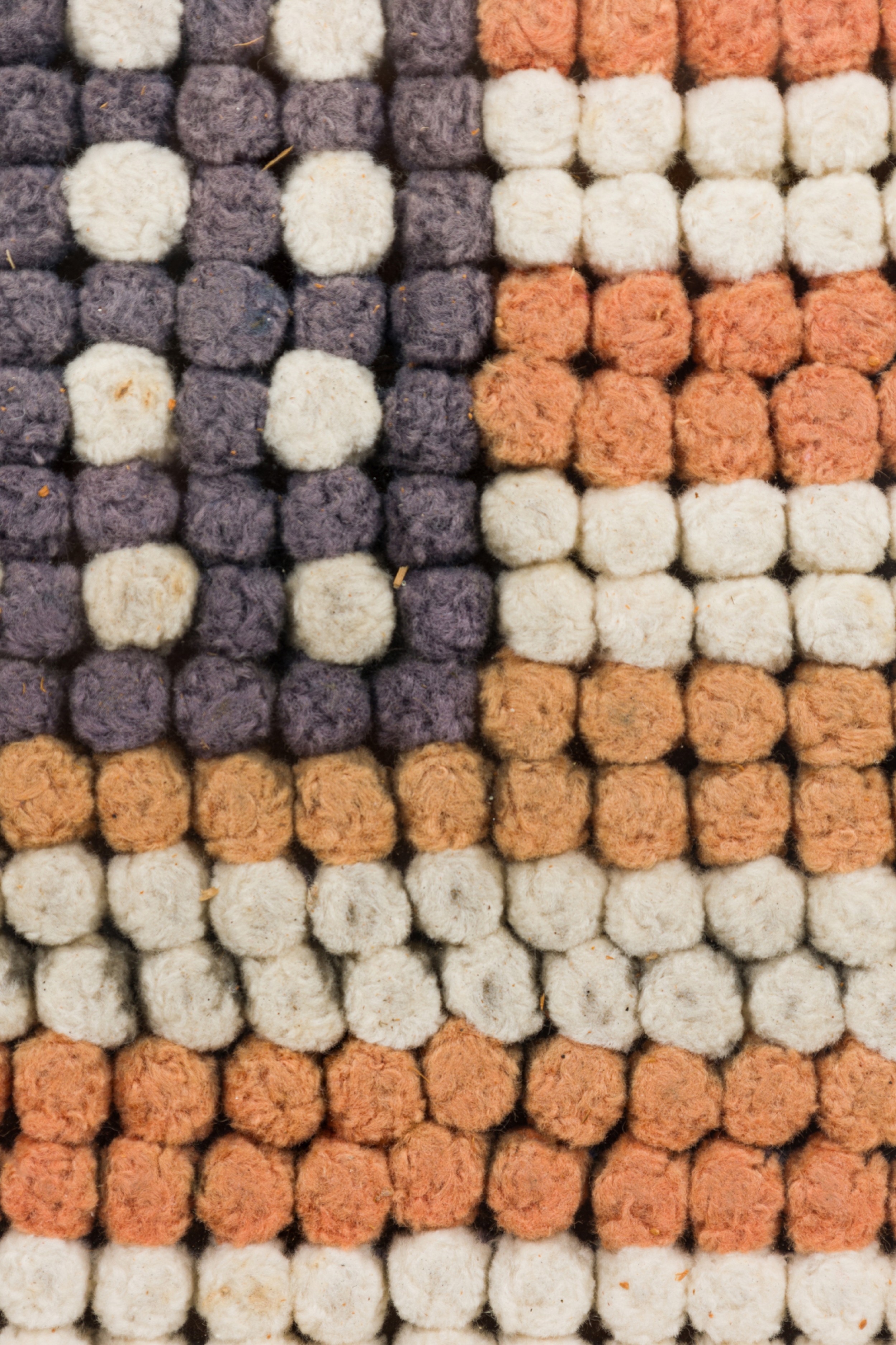 American Country (early 20th Century) folk art embroidery of a US flag portrayed with small pompoms in a wood frame behind glass.