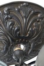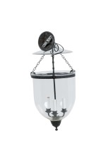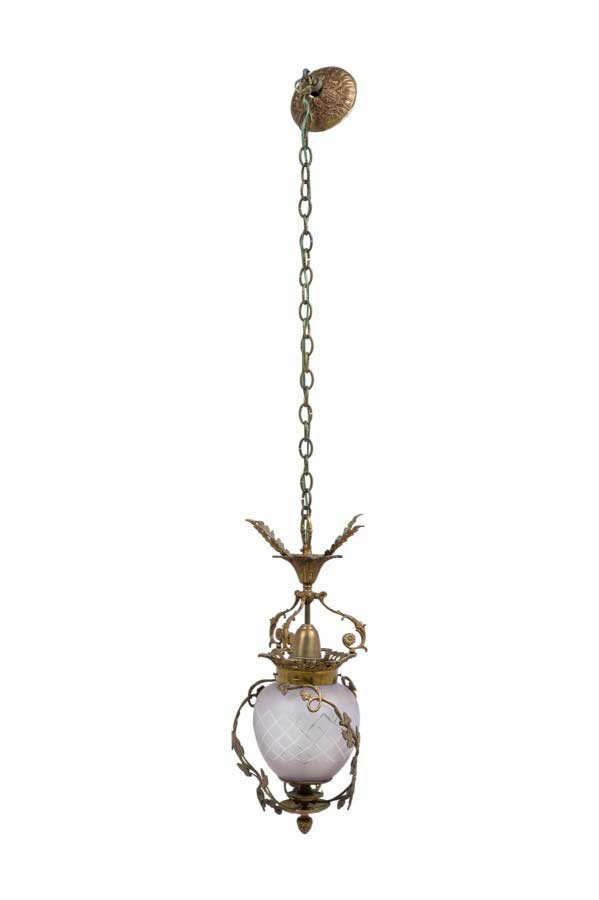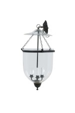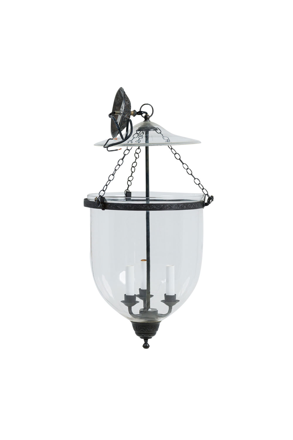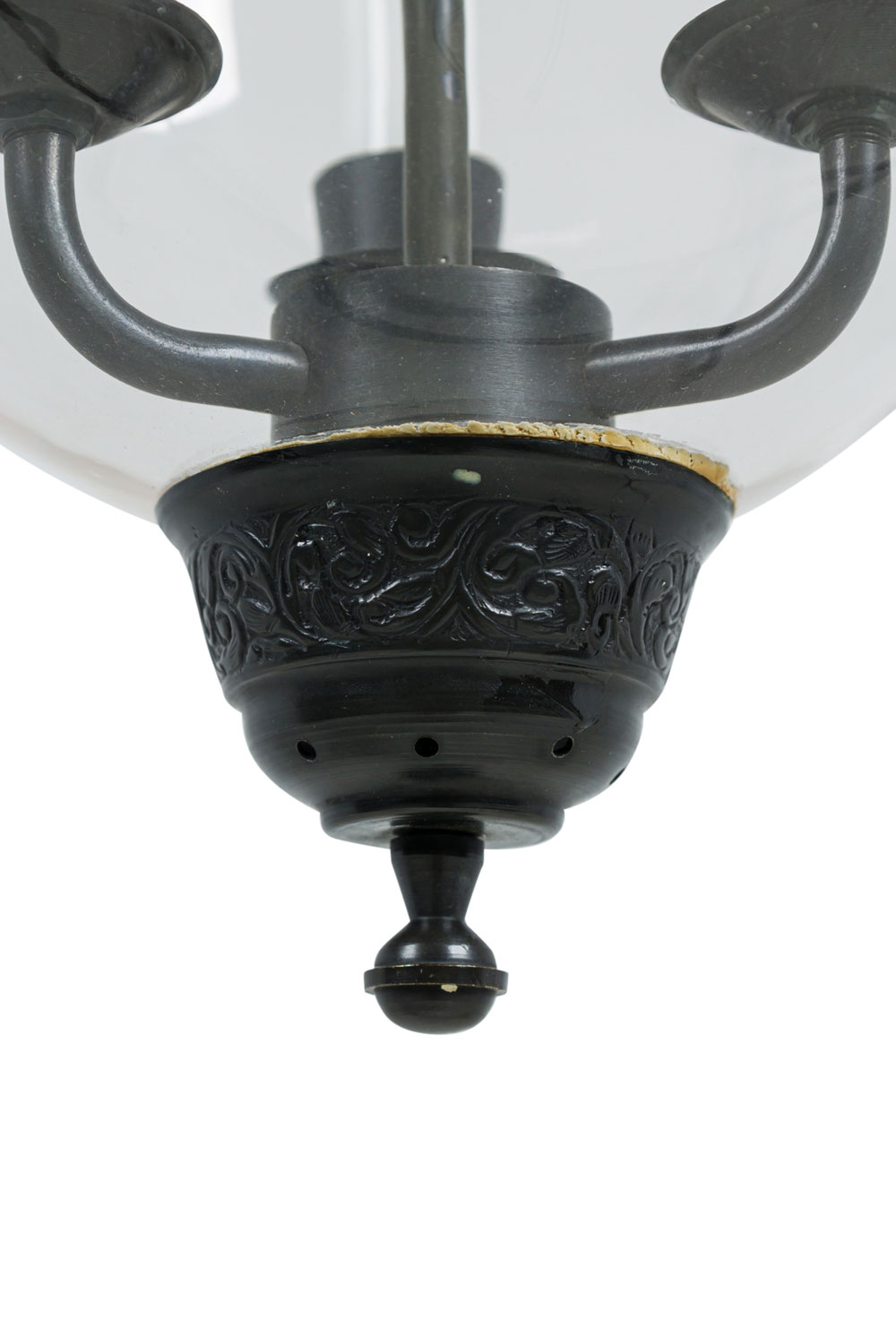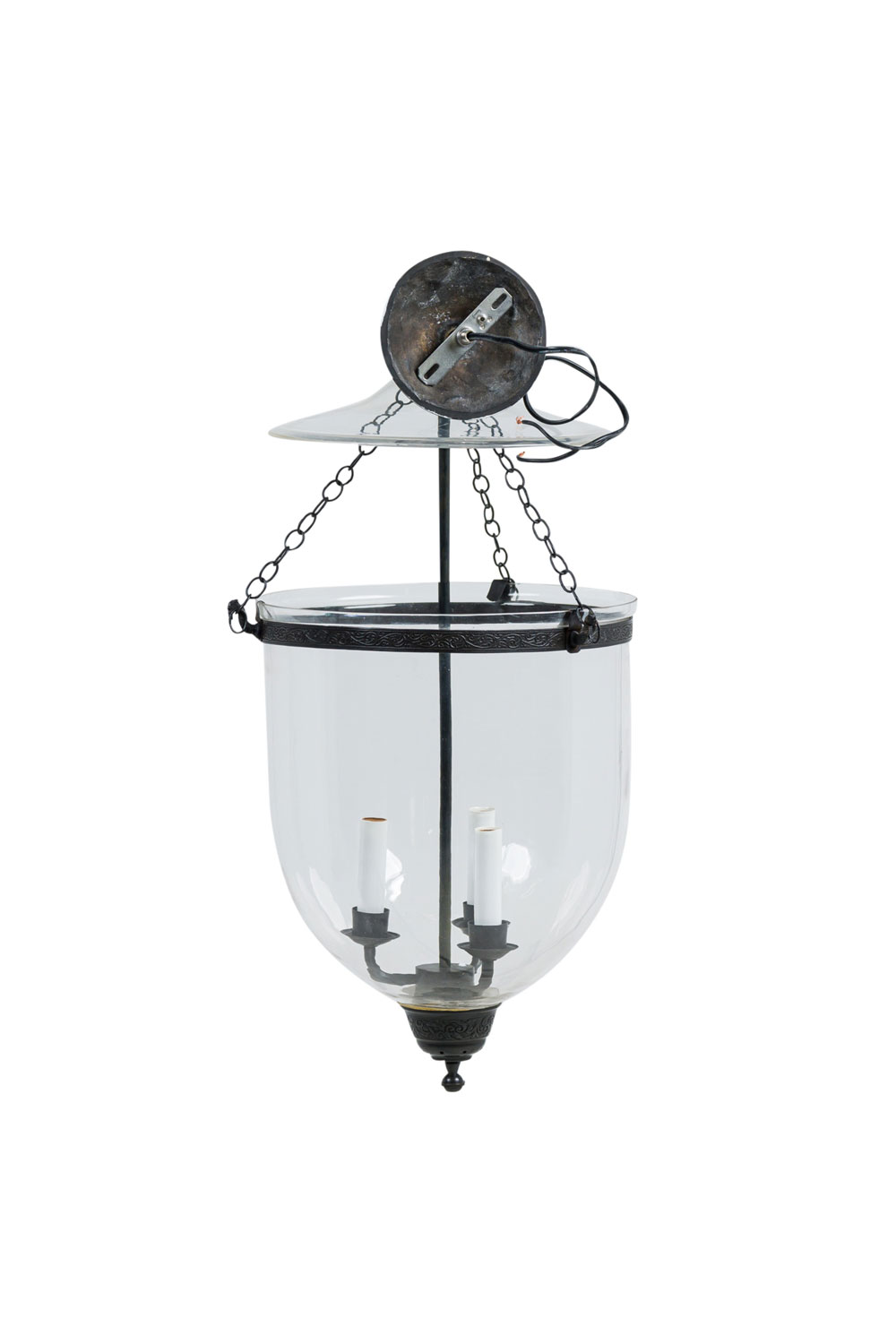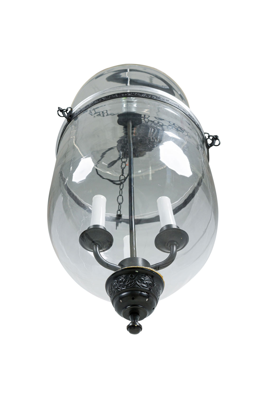 American Federal style (20th Century) 3 arm bell jar lantern bearing engravings of leaf and floral motifs on the band of the suspension and finial bottom.