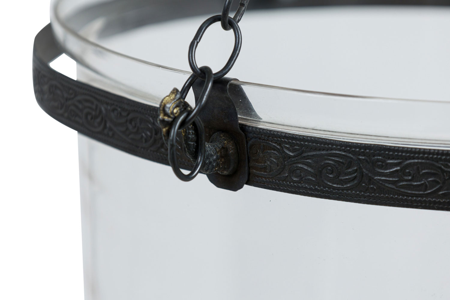American Federal style (20th Century) 3 arm bell jar lantern bearing engravings of leaf and floral motifs on the band of the suspension and finial bottom