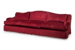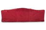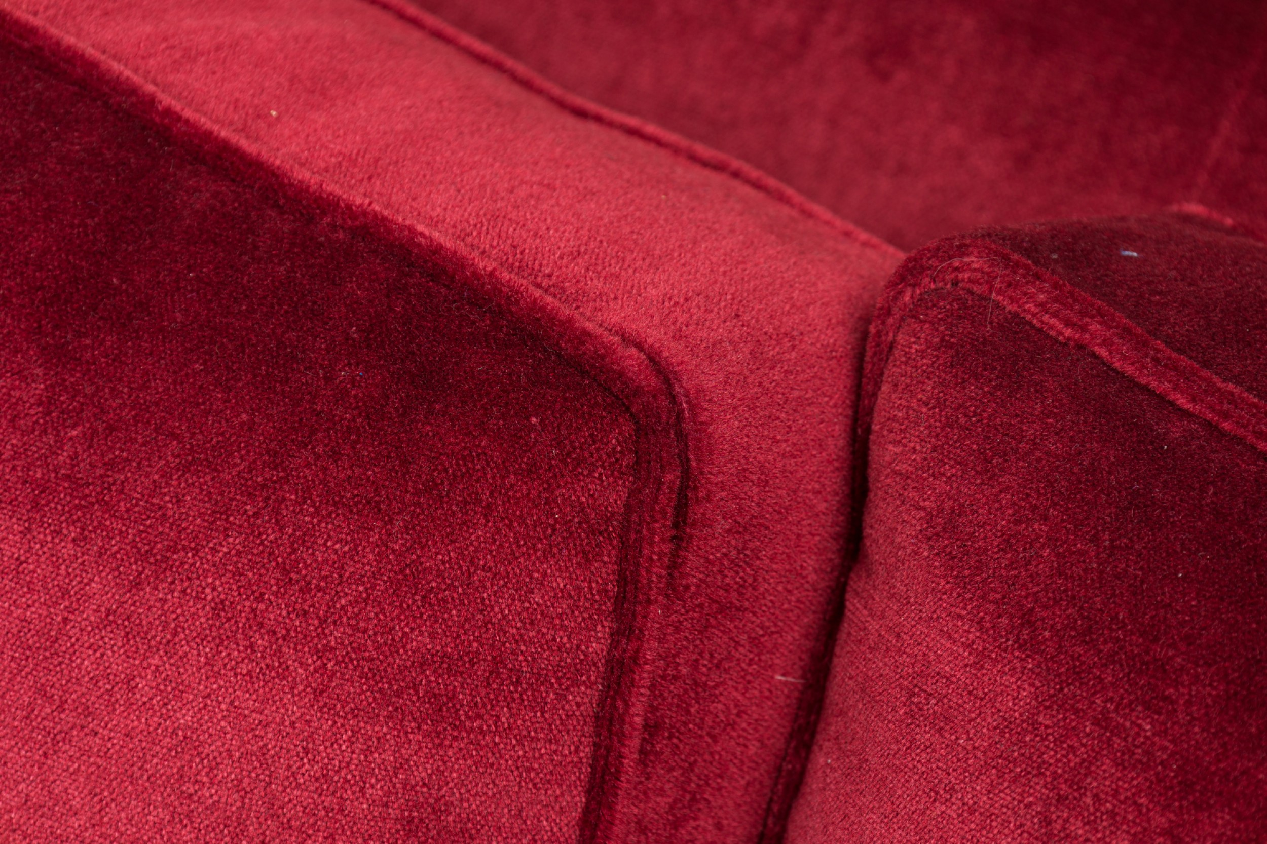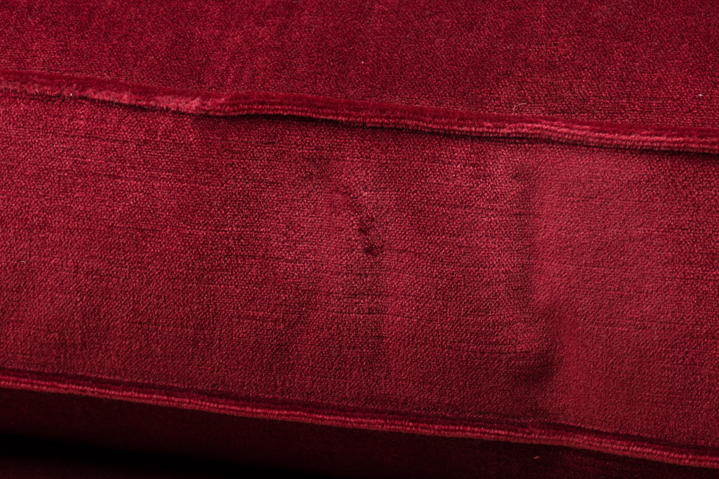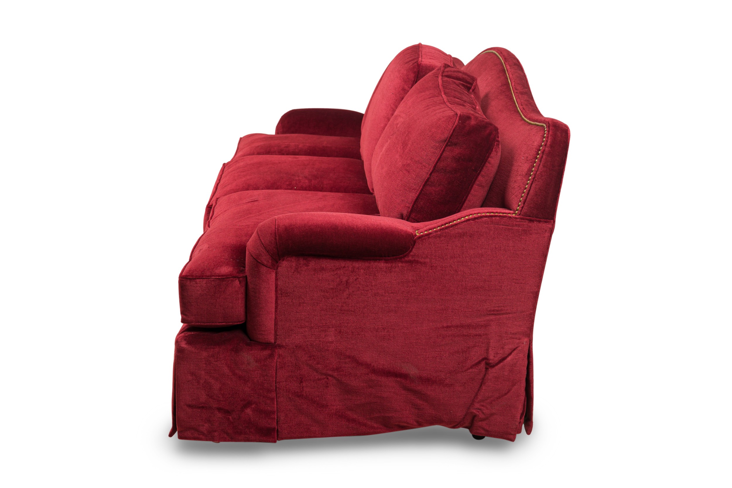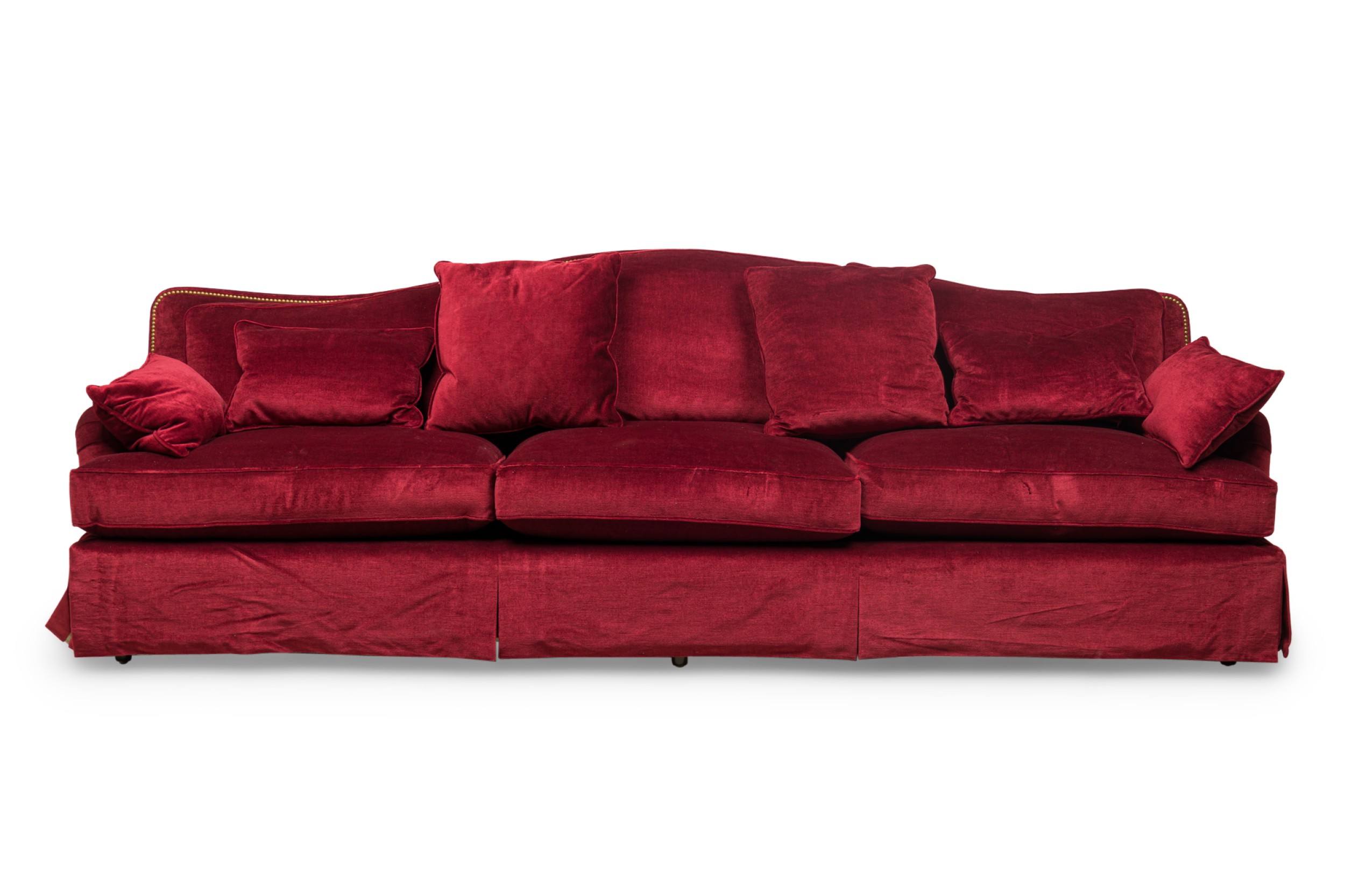 American Mid-Century large crimson mohair sofa with decorative brass nailhead trim around the serpentine shaped back and arms with a curtain bottom and having 3 seat and back cushions with multiple throw pillows