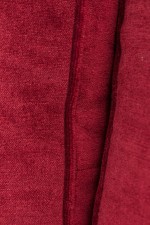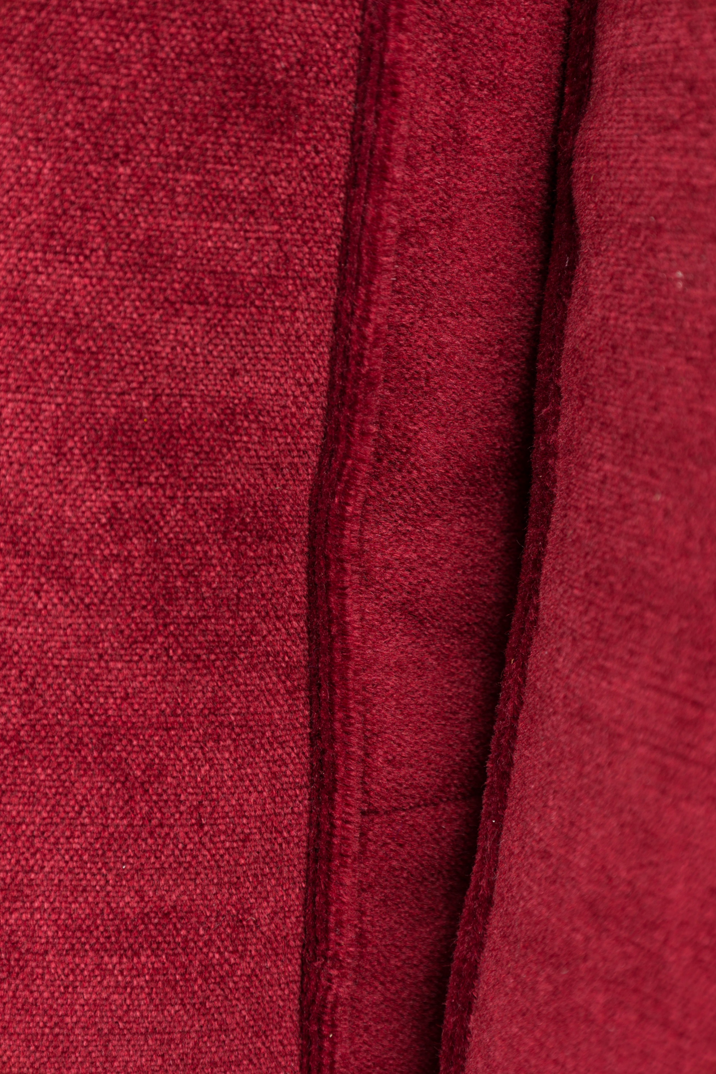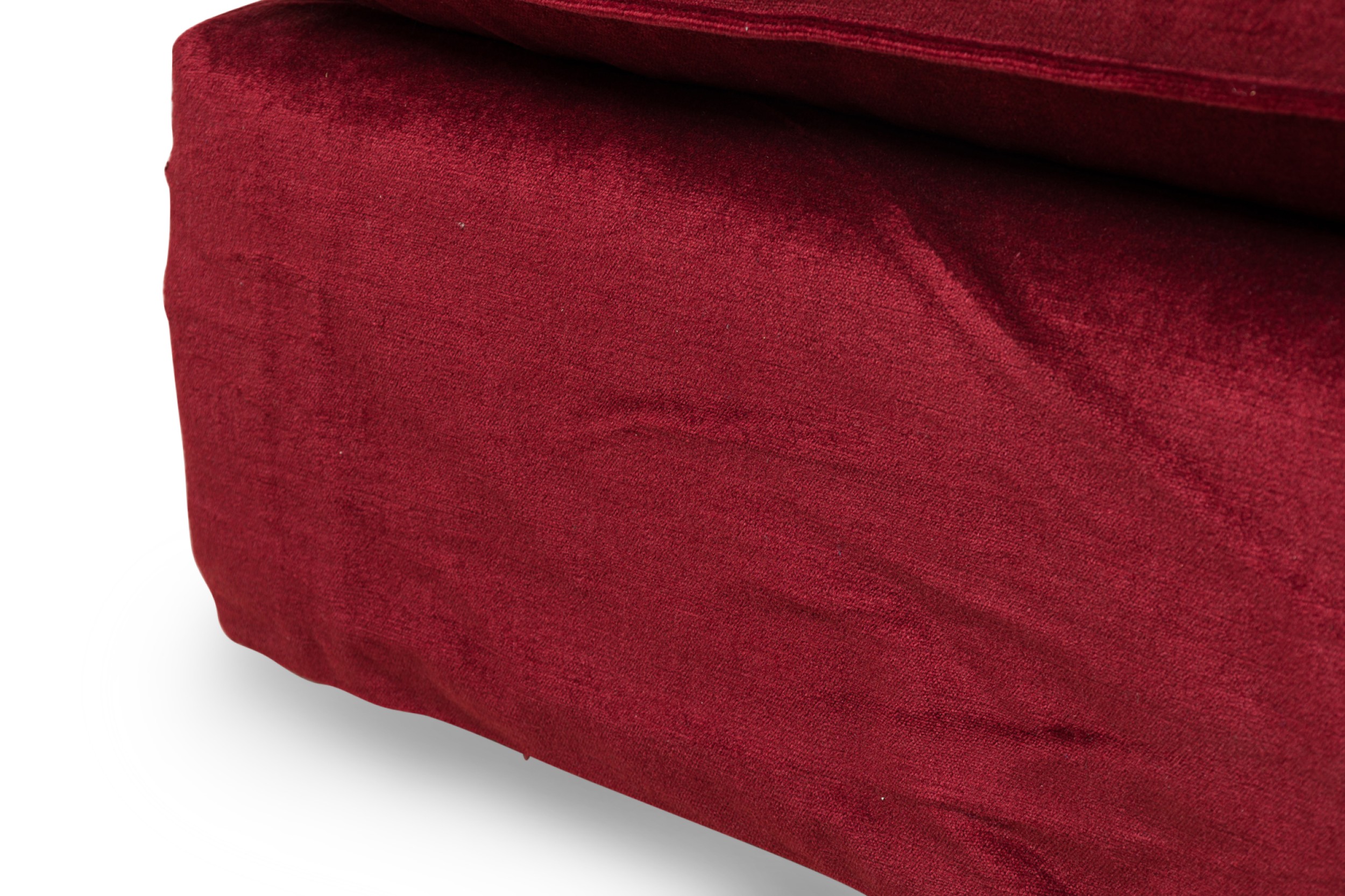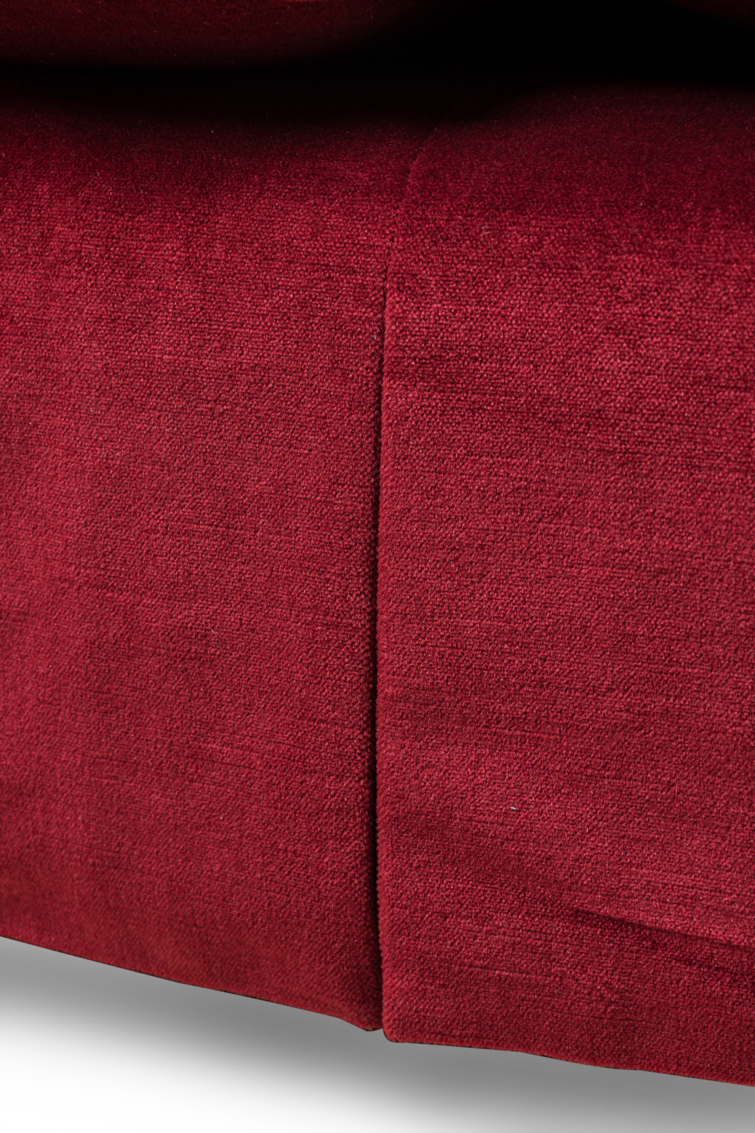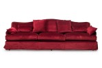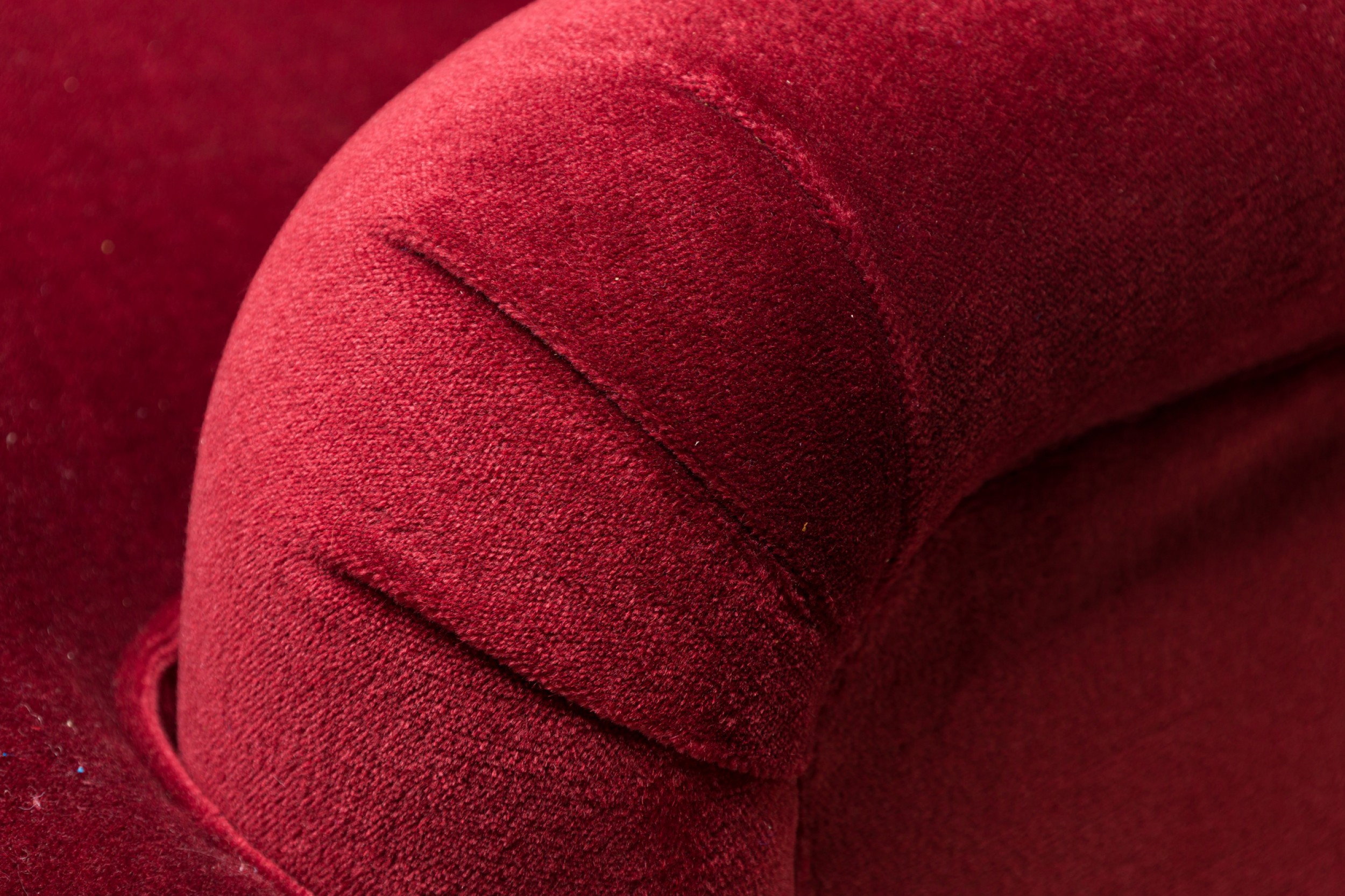 American Mid-Century large crimson mohair sofa with decorative brass nailhead trim around the serpentine shaped back and arms with a curtain bottom and having 3 seat and back cushions with multiple throw pillows