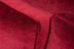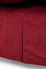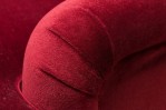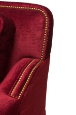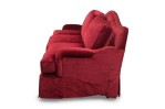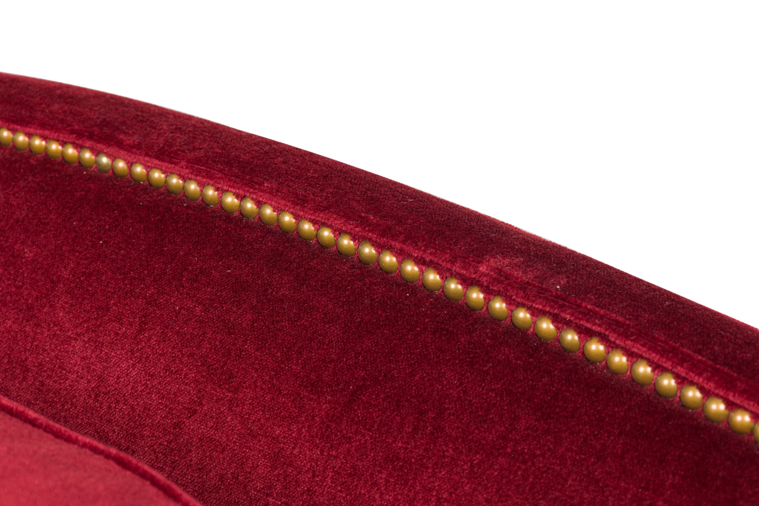 American Mid-Century large crimson mohair sofa with decorative brass nailhead trim around the serpentine shaped back and arms with a curtain bottom and having 3 seat and back cushions with multiple throw pillows.