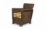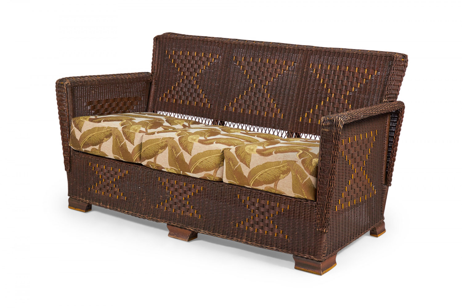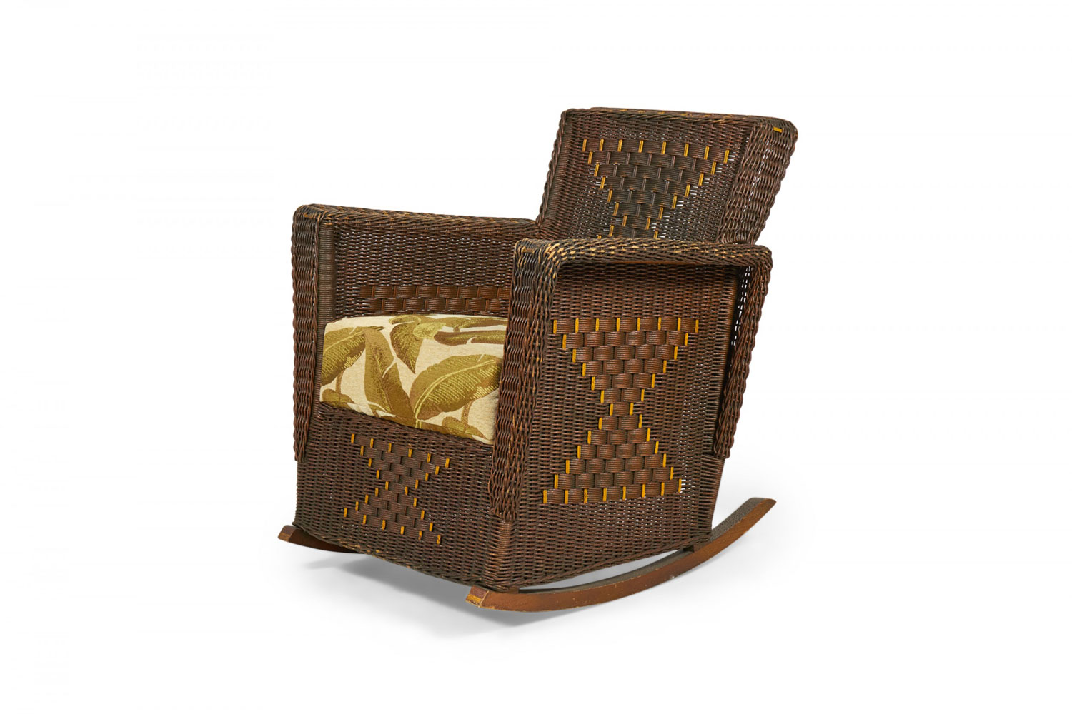 American Art Deco 3-piece dark brown wicker salon set comprised of a three-seat settee, a rocking chair, and an armchair, all with squared backs and arms with a woven hourglass pattern throughout and custom golden palm frond patterned seat cushions. (PRICED AS SET)