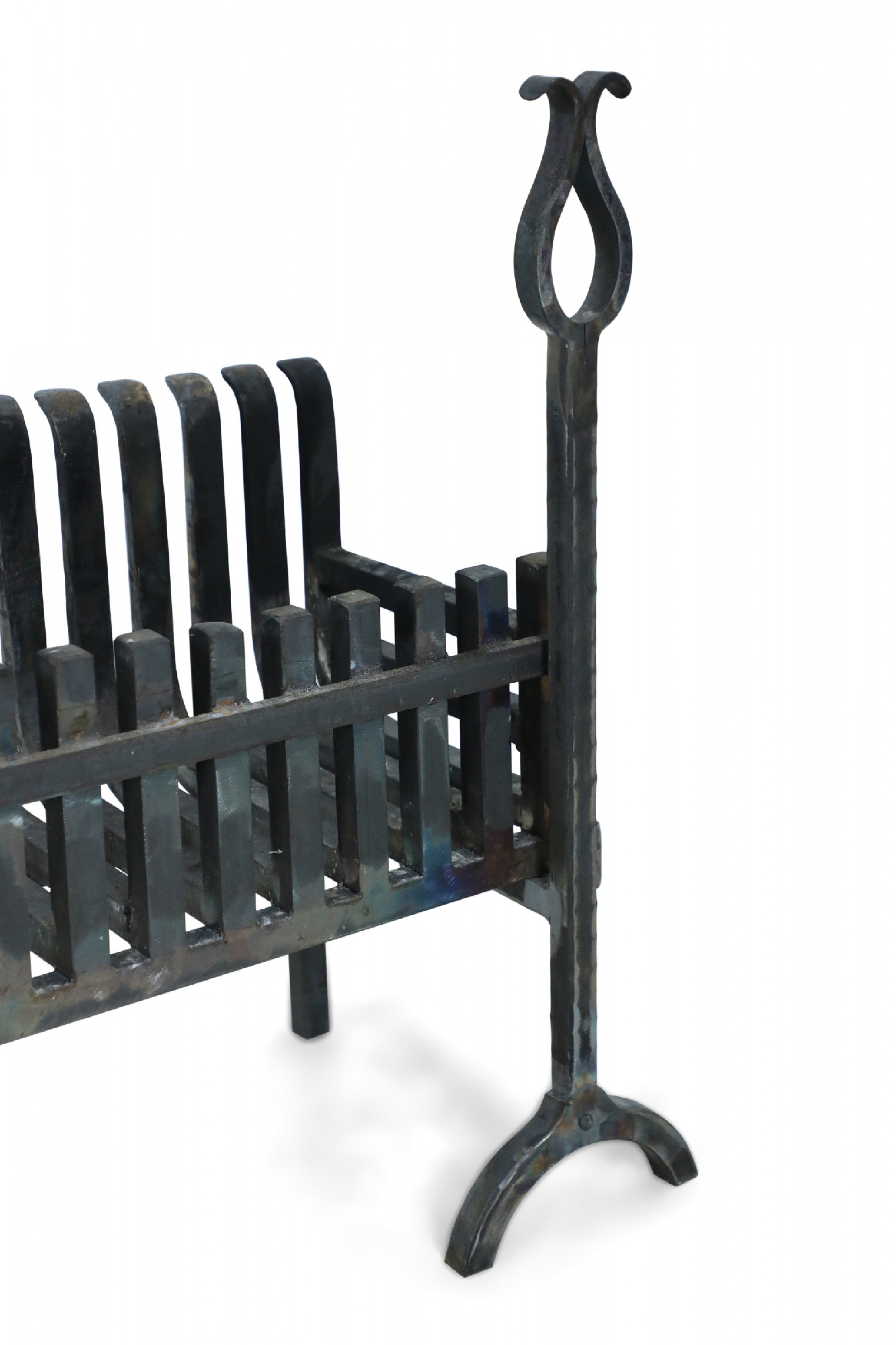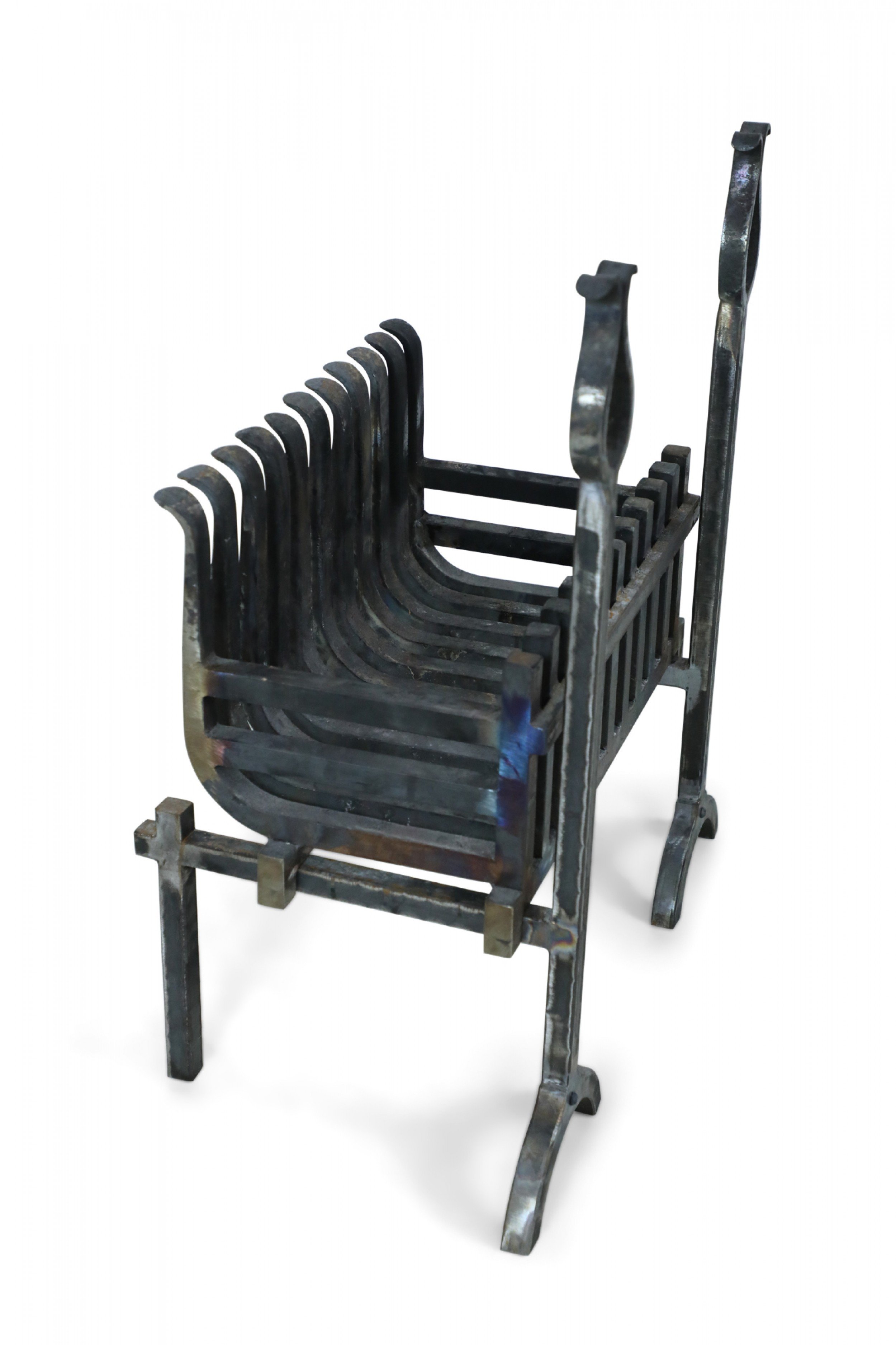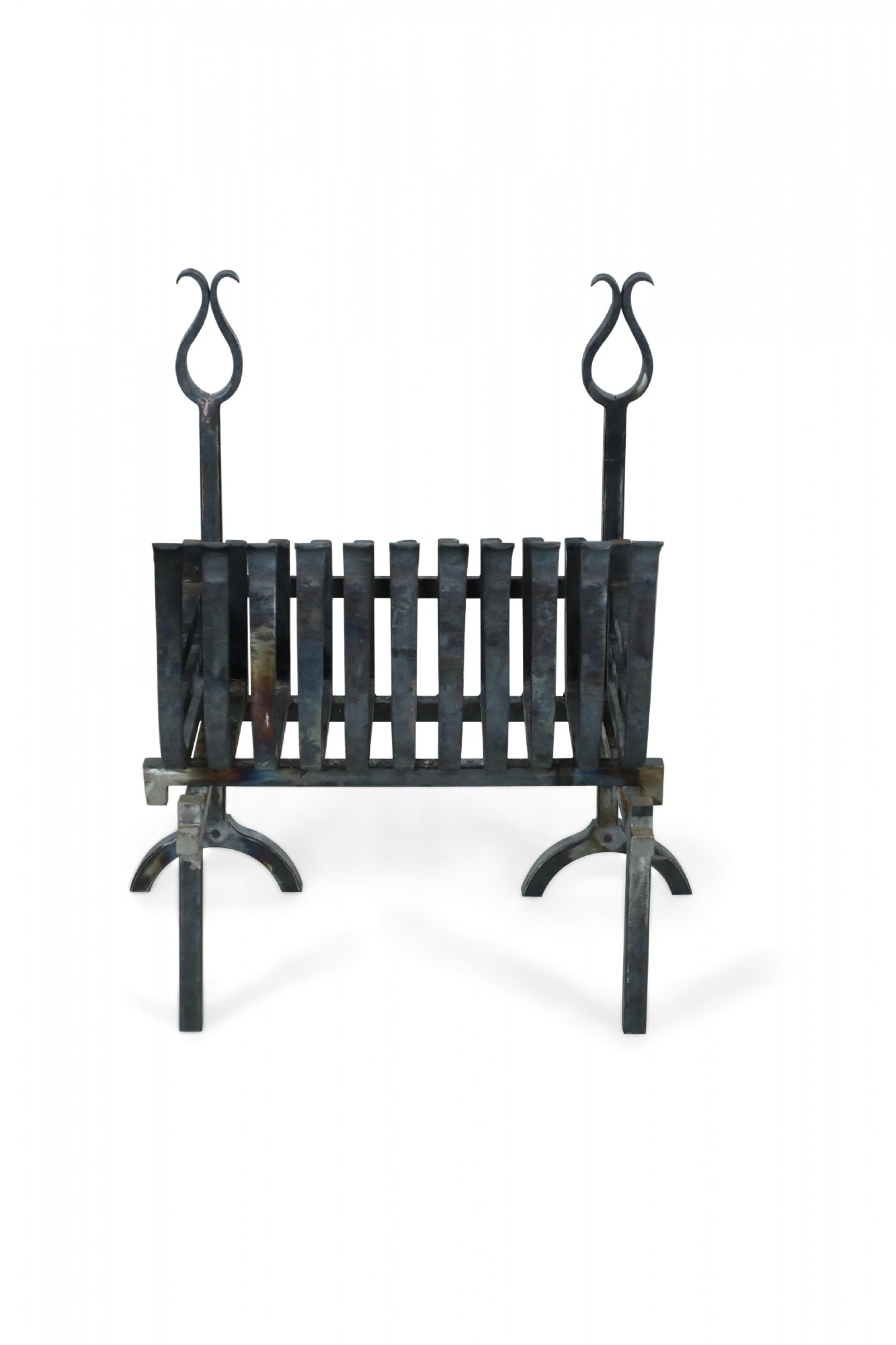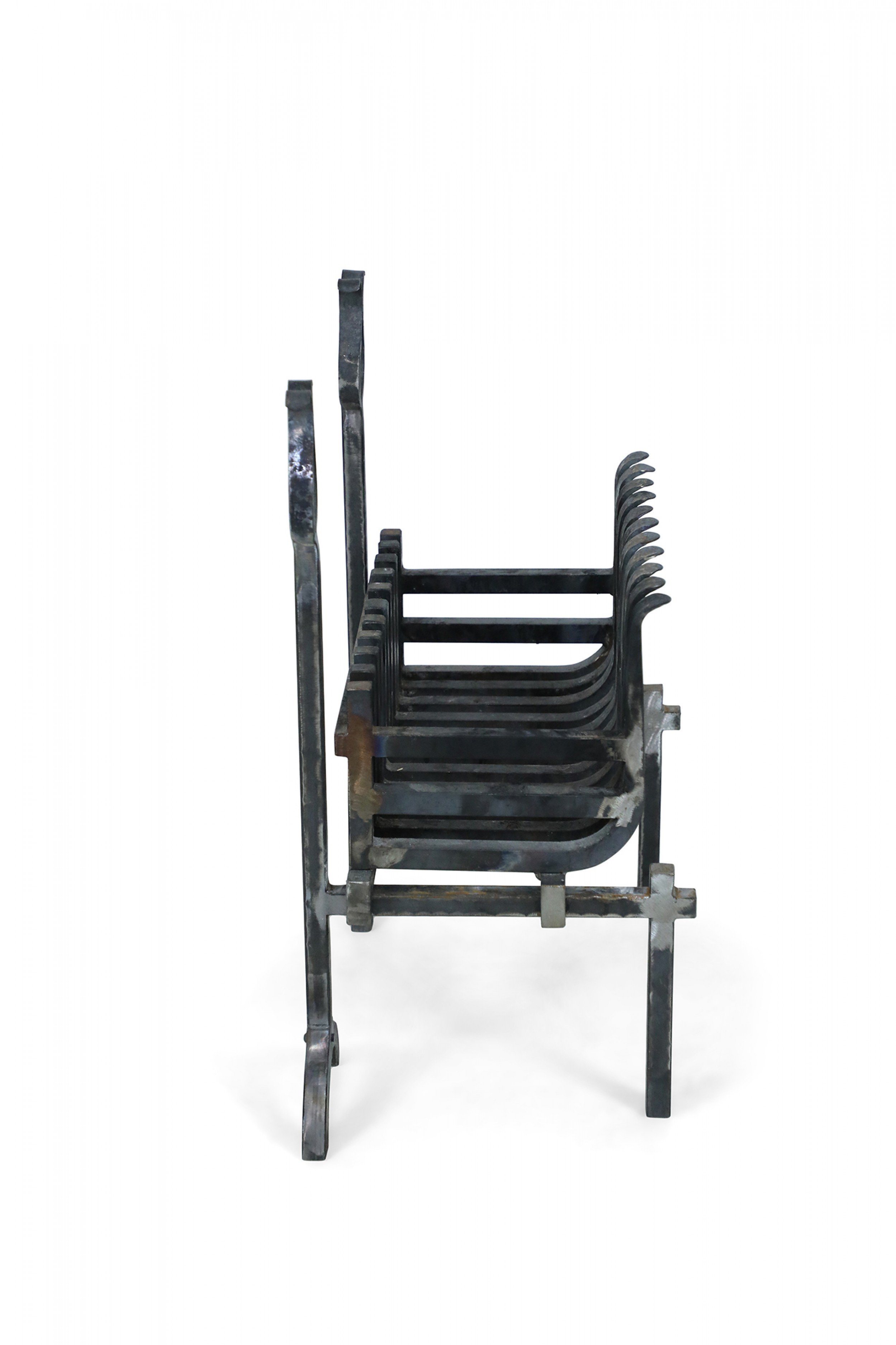 American Art Deco 3-piece iron fire grate comprised of a curved iron slat grate resting on two independent andirons.