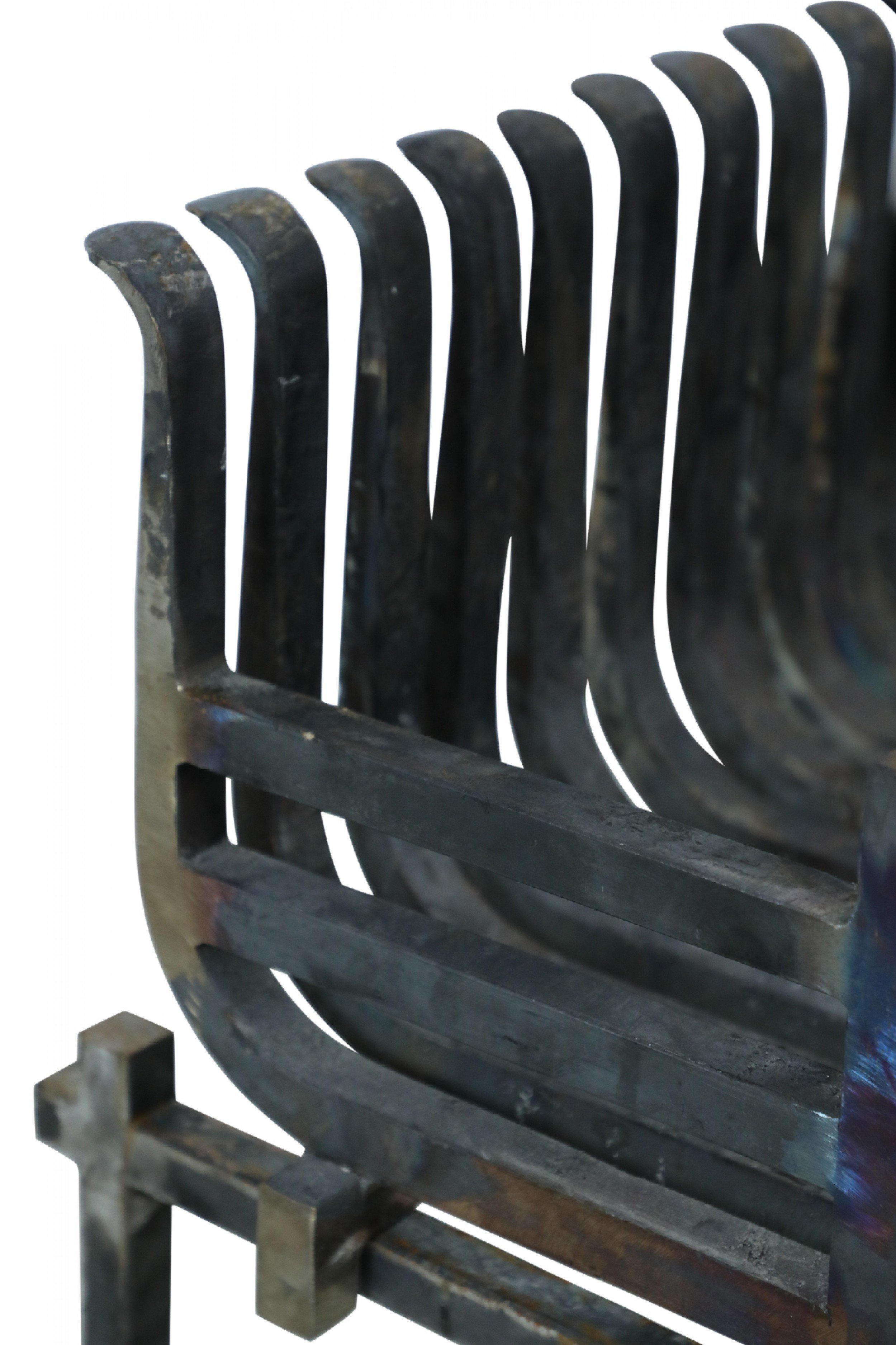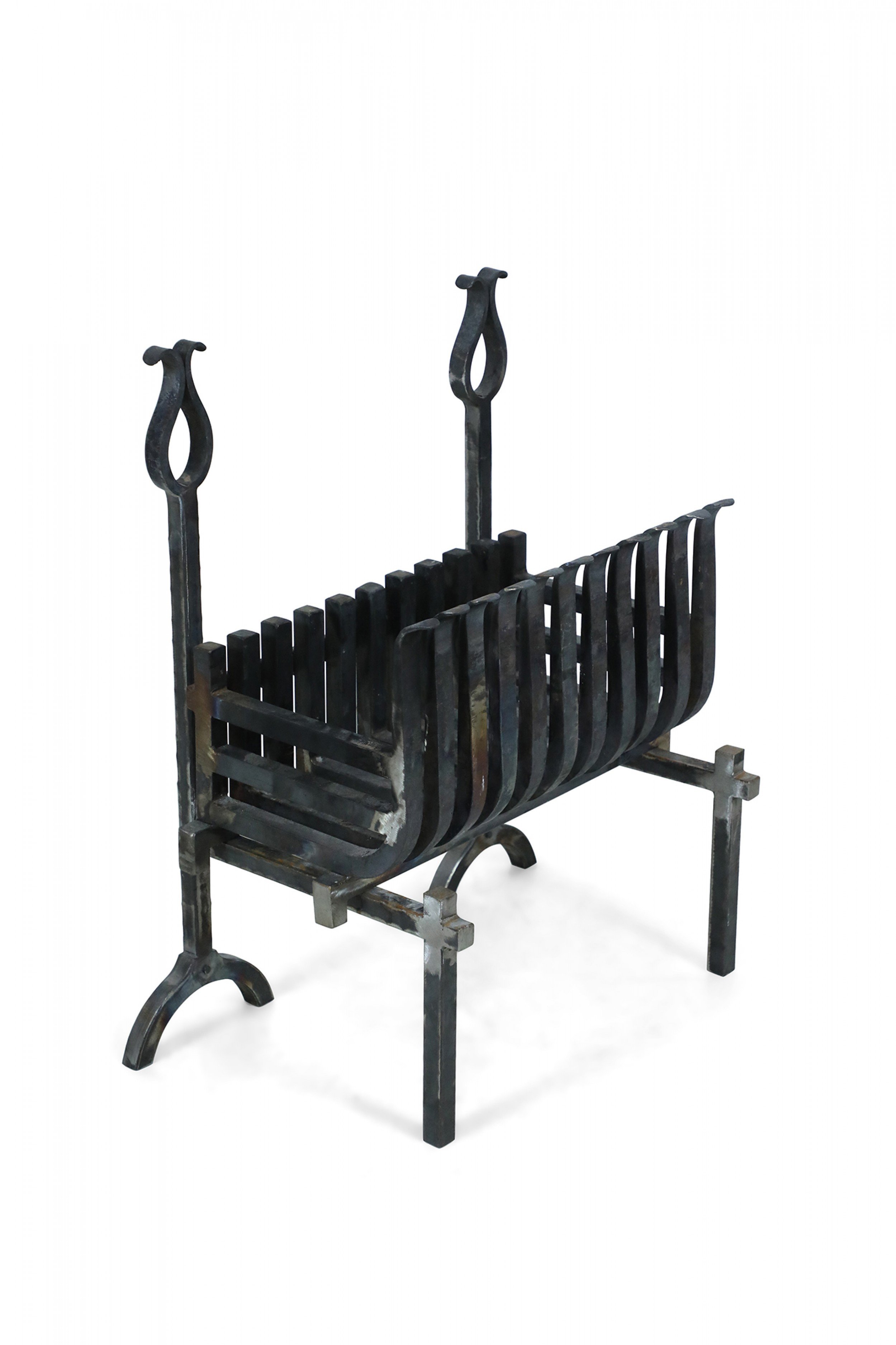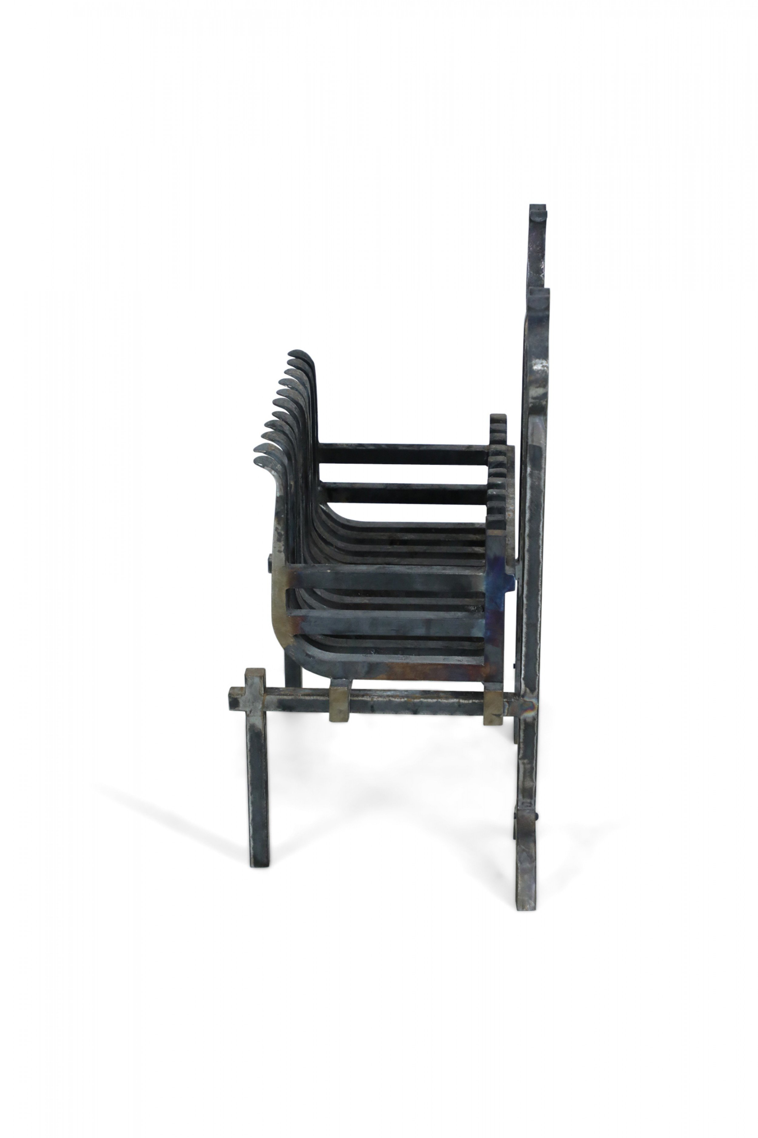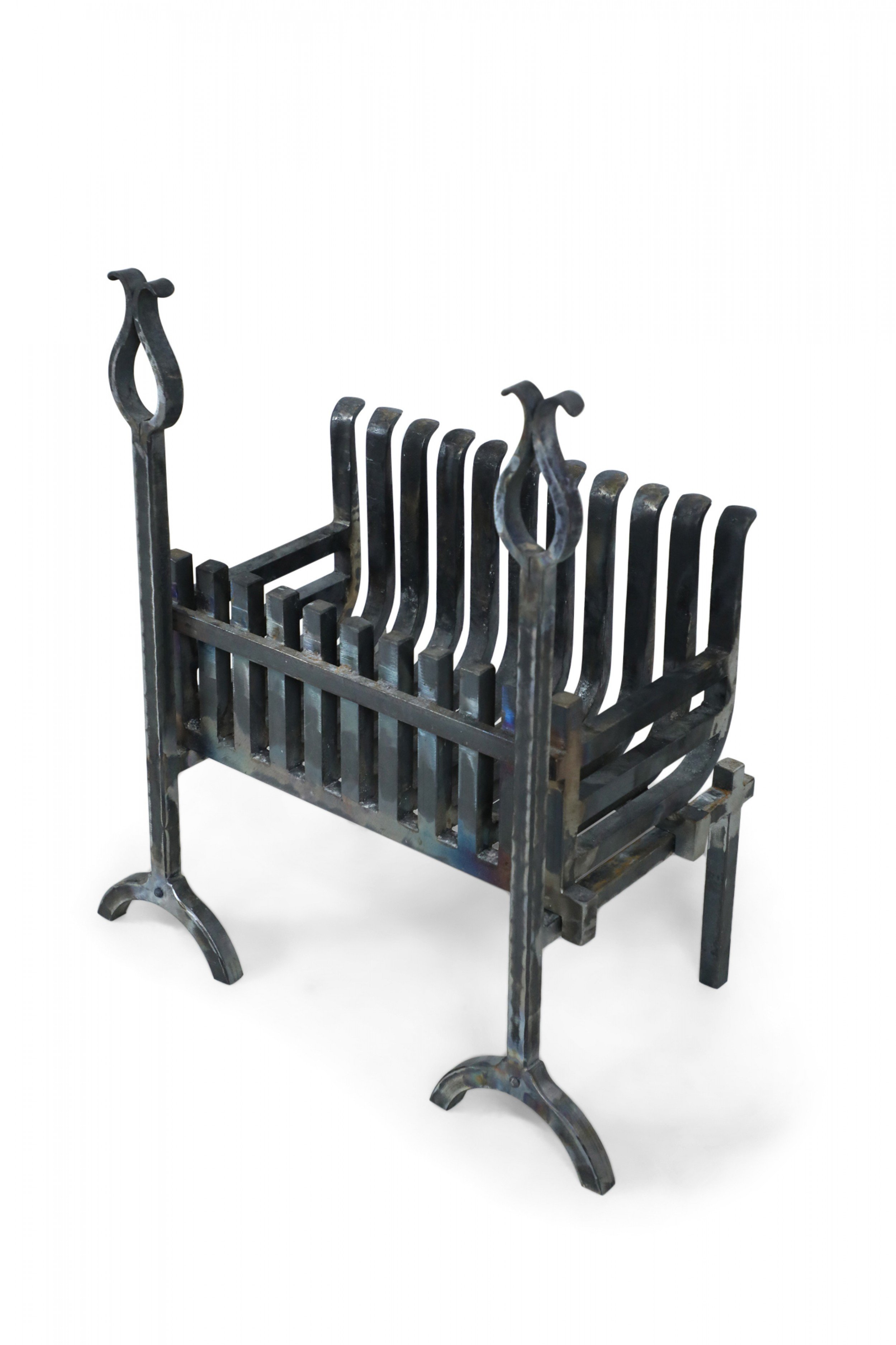 American Art Deco 3-piece iron fire grate comprised of a curved iron slat grate resting on two independent andirons.