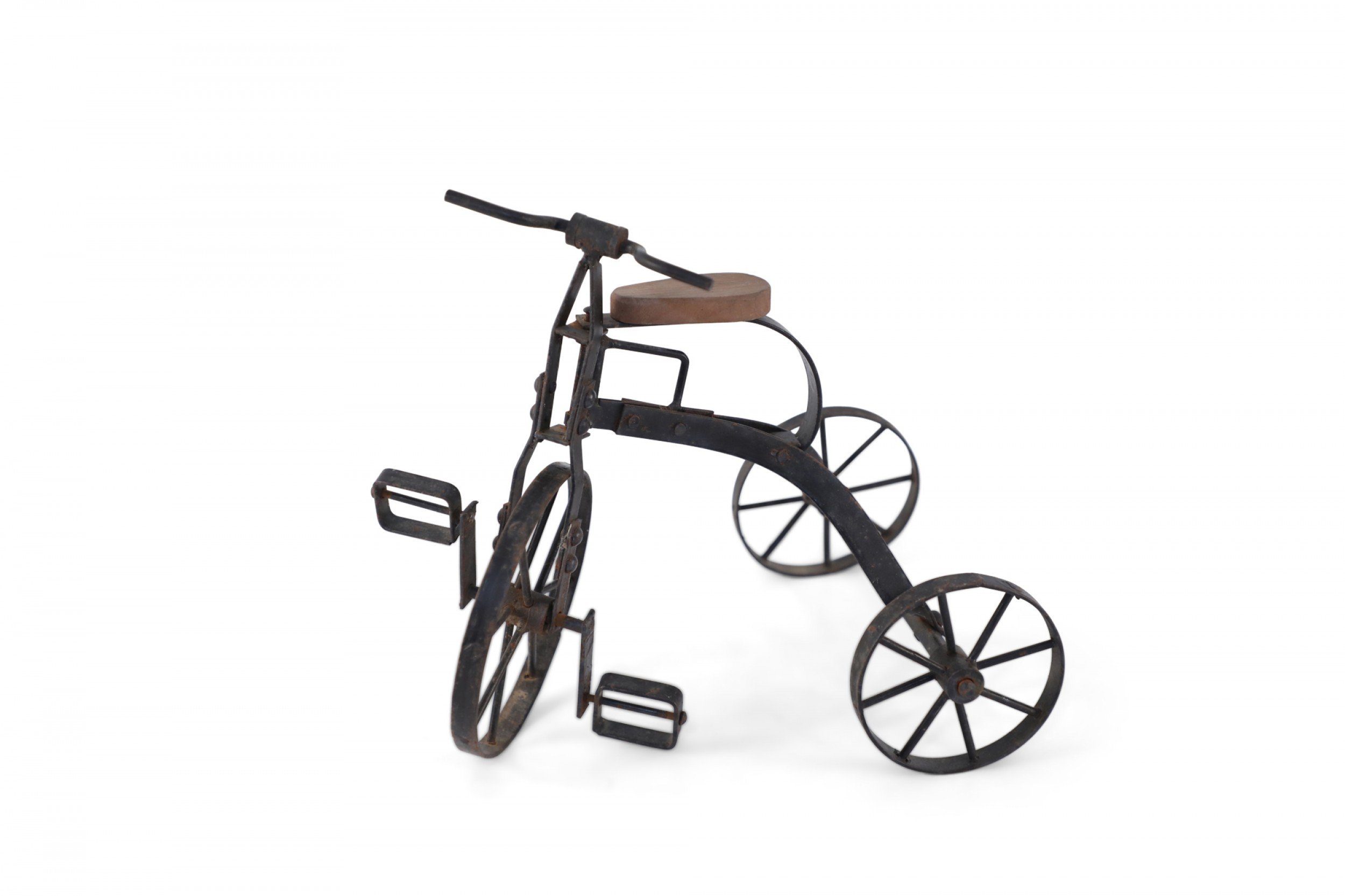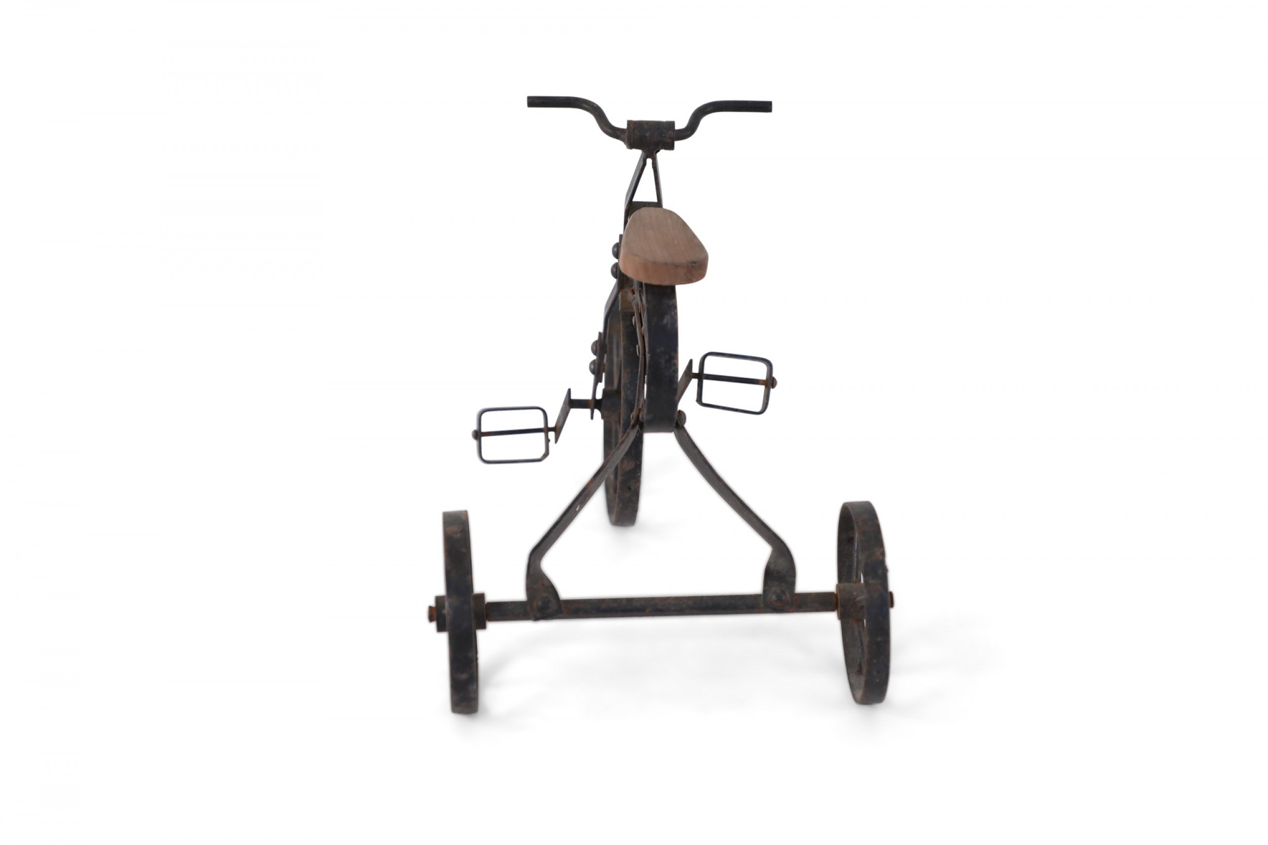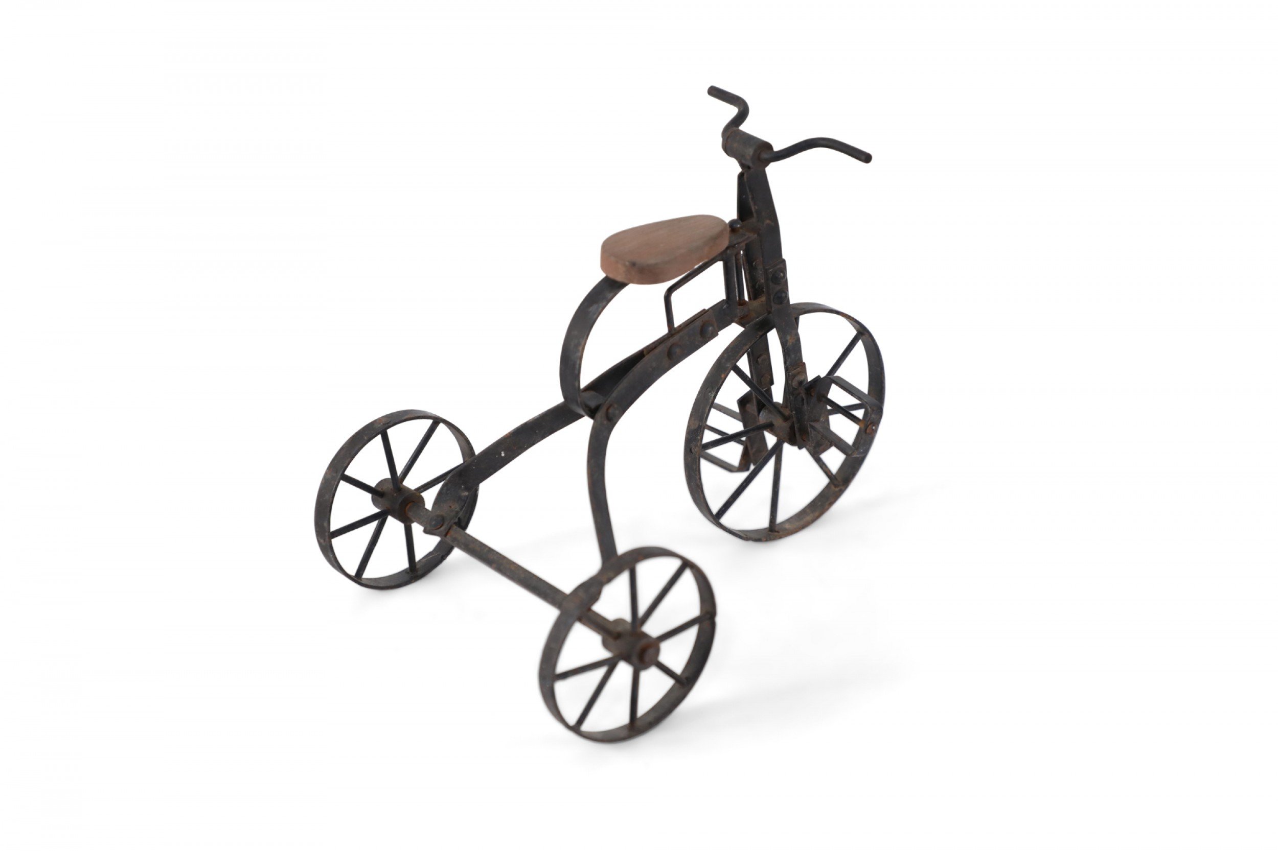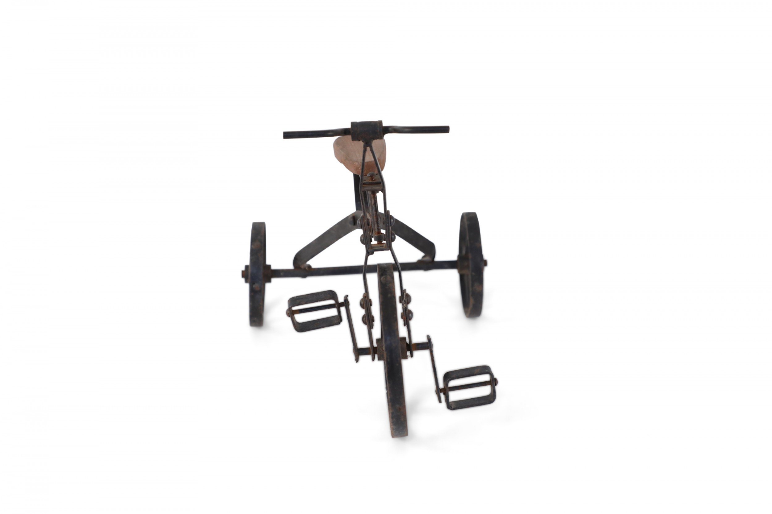 American Country-style rustic iron miniature tricycle sculpture with pine wood seat and rotating wheels and pedals..