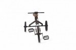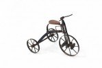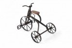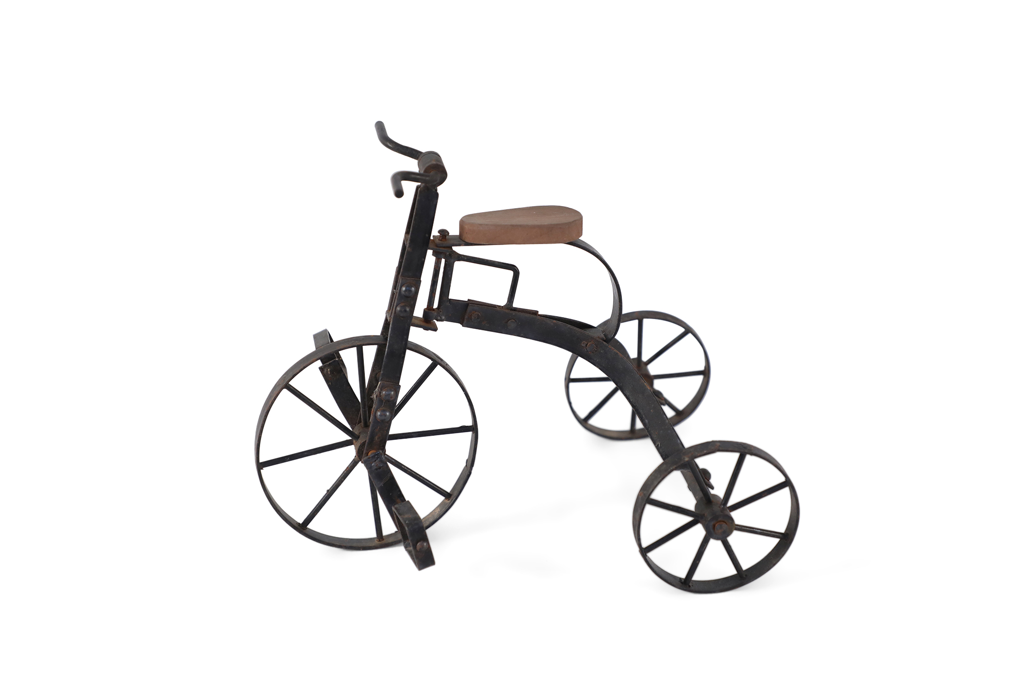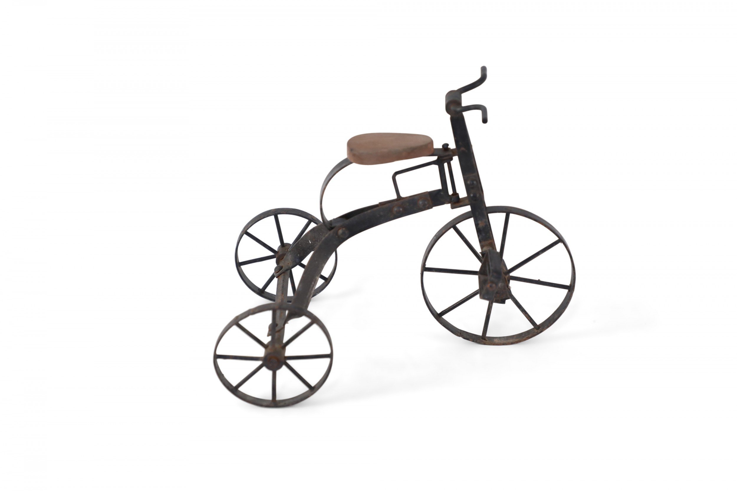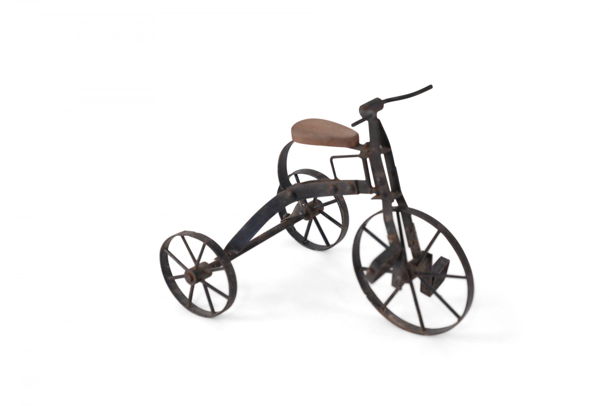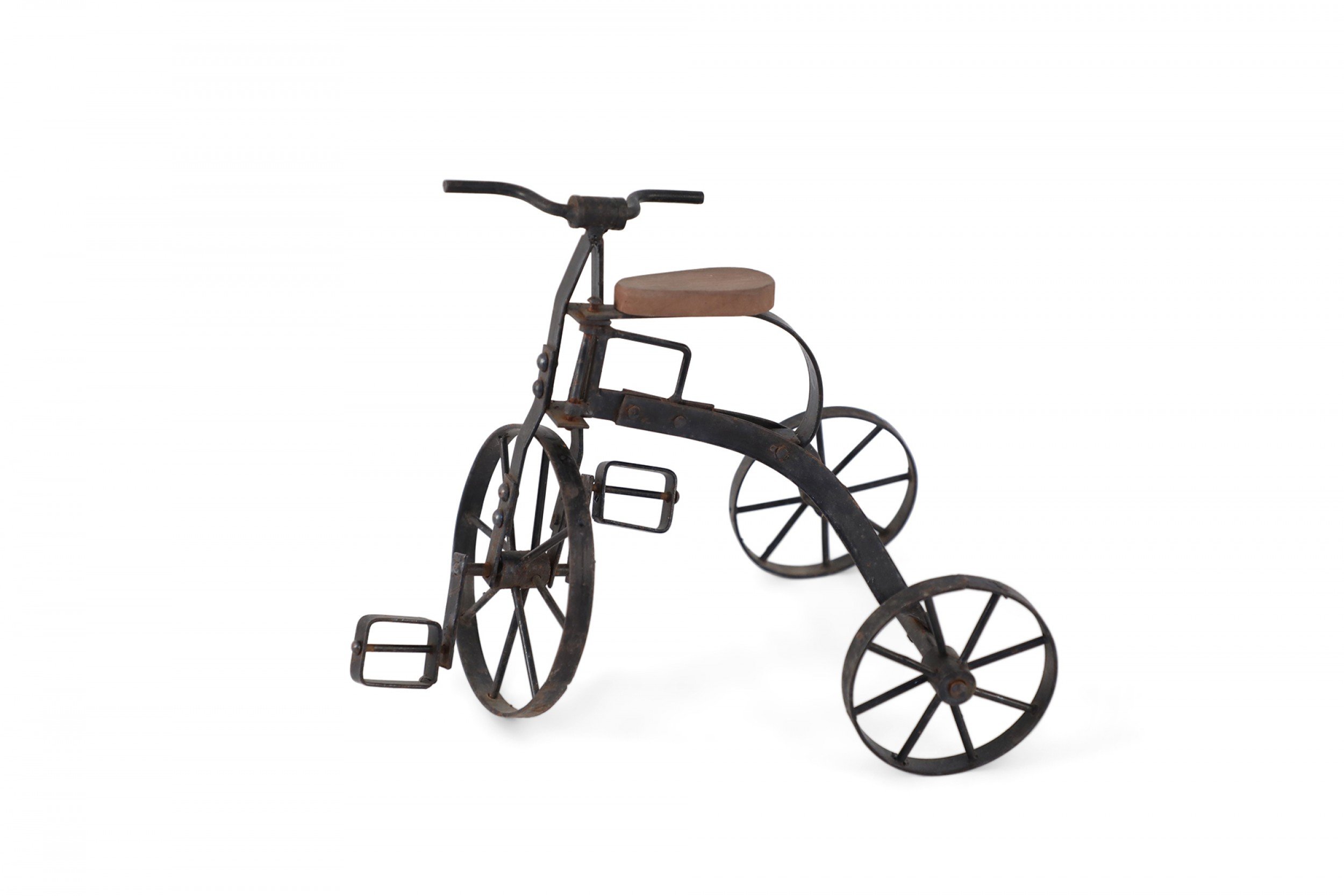 American Country-style rustic iron miniature tricycle sculpture with pine wood seat and rotating wheels and pedals..