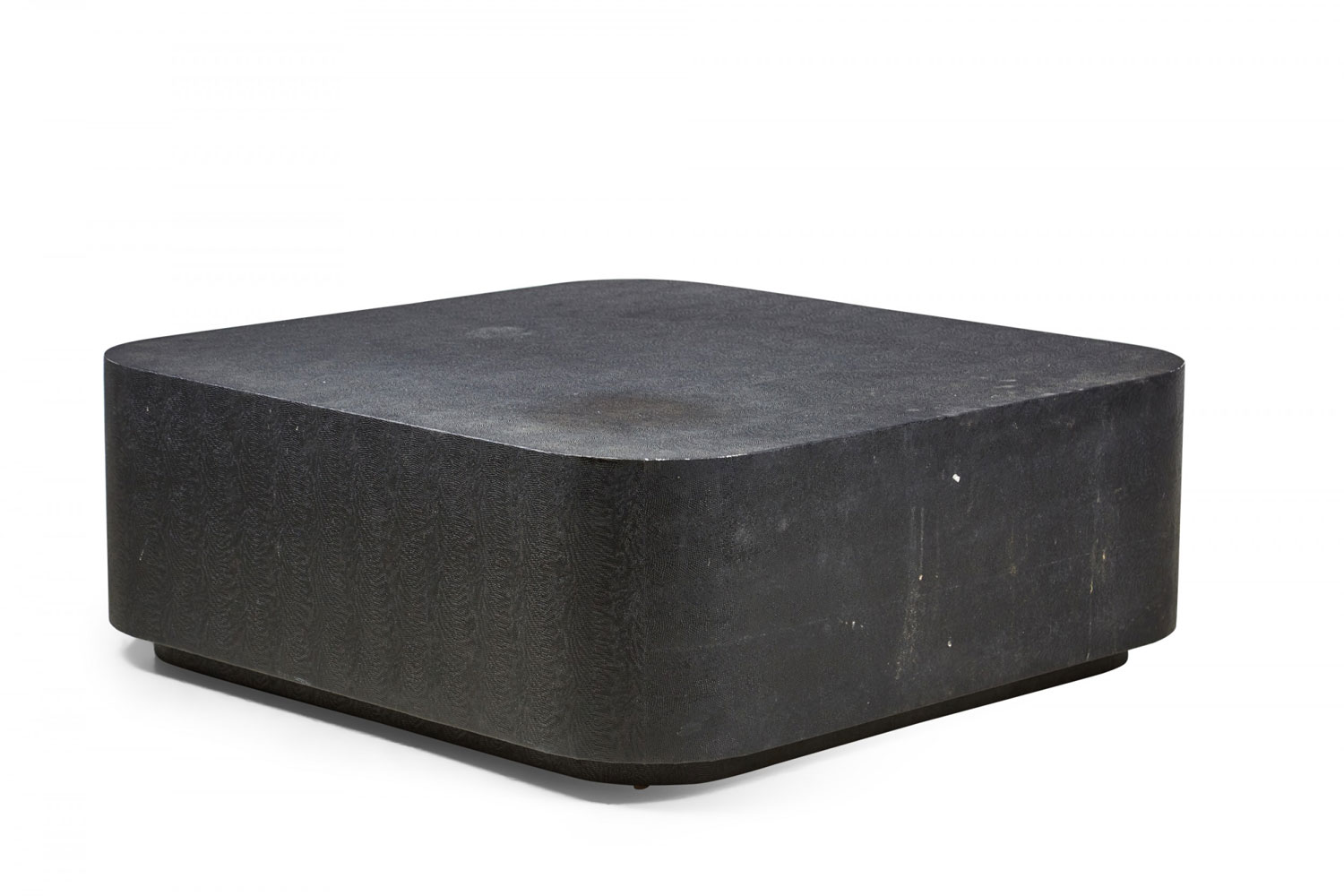 American Mid-Century black faux shagreen wrapped coffee table with a square profile and rounded corners on an inset platform base. (manner of Karl Springer).
