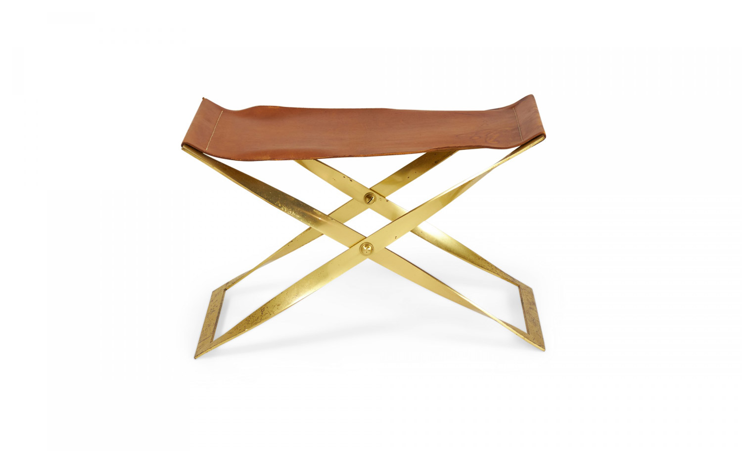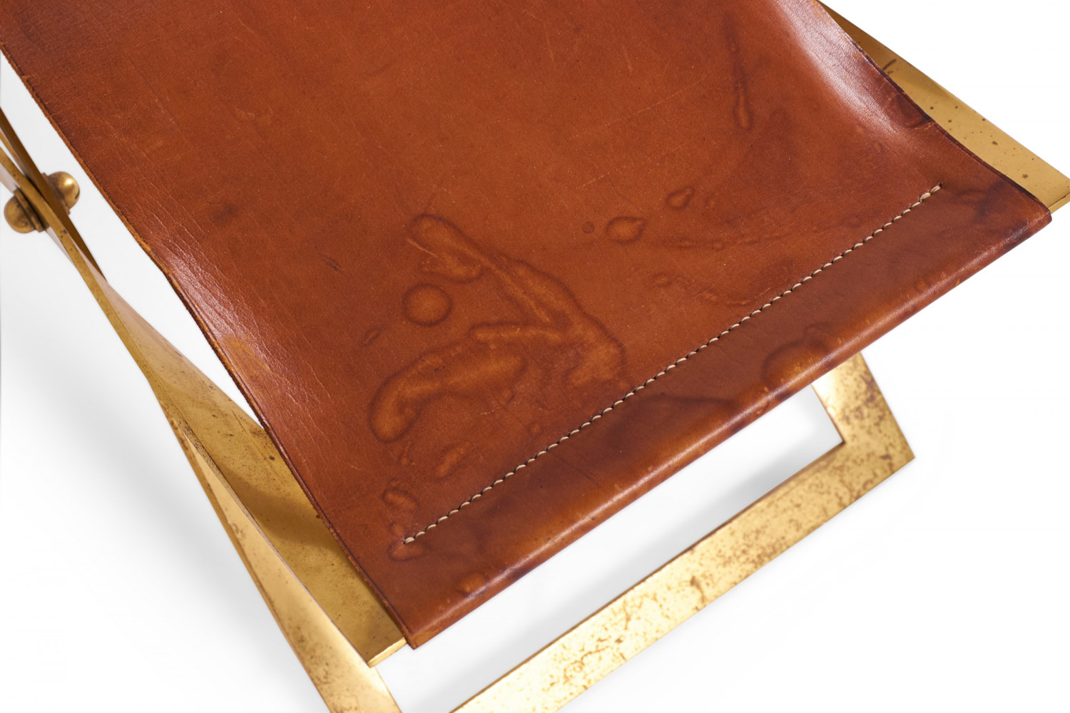 American Mid-Century scissor bench with a polished brass x-shaped frame and a brown leather sling seat.