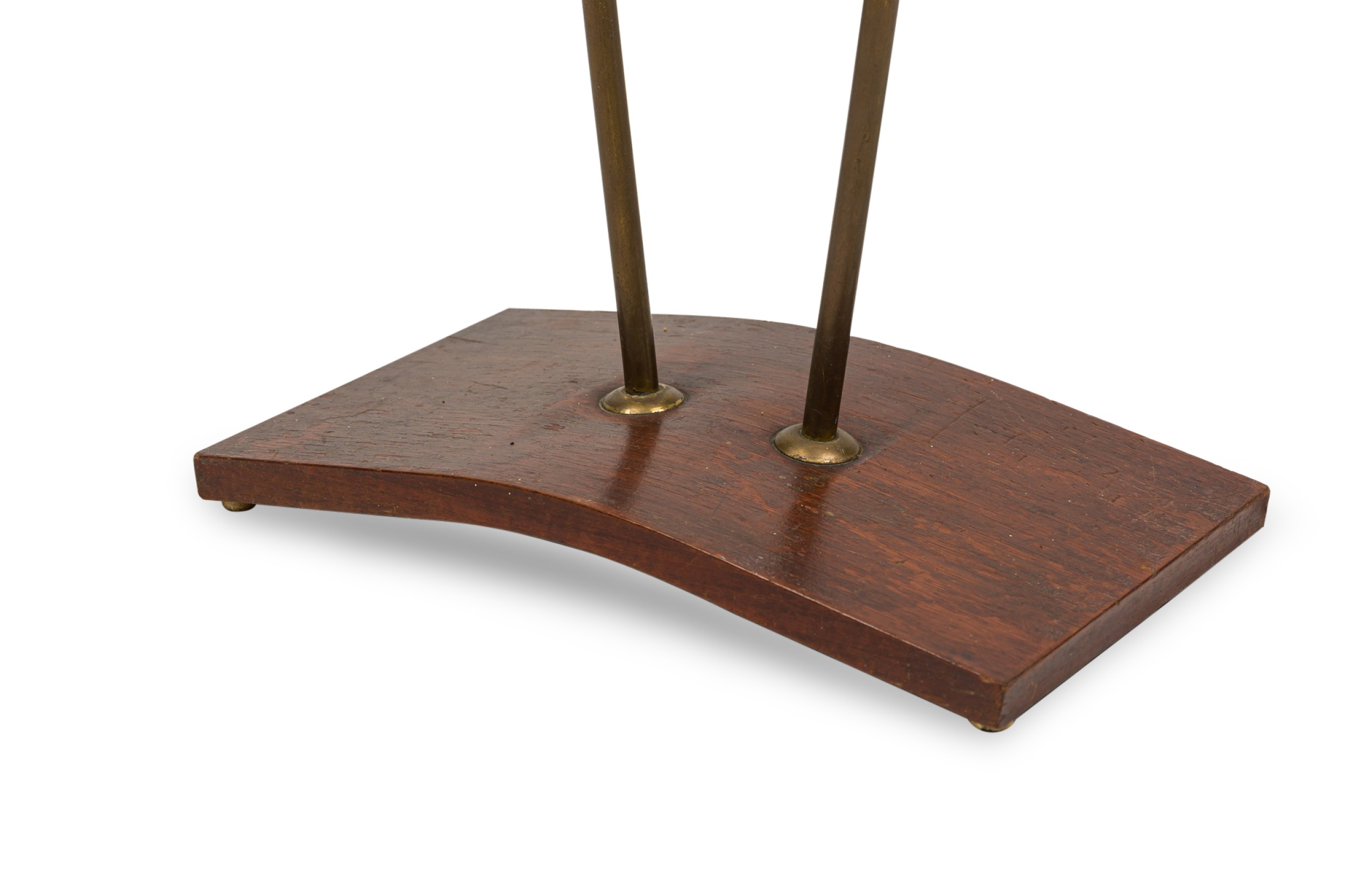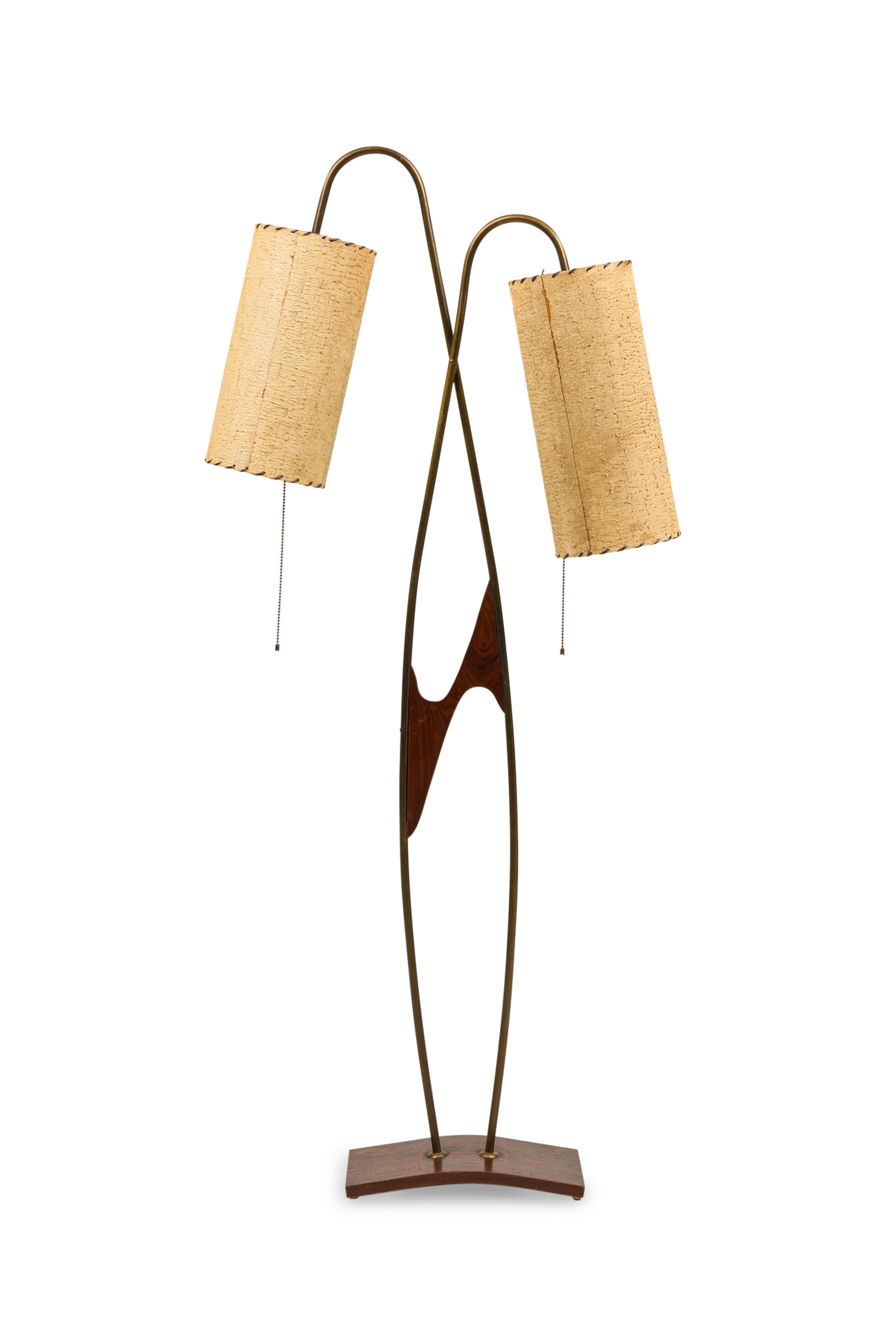 American Mid-Century Atomic floor lamp with dual metal stems connected in the center with teak and crossing at the top, finishing in 2 shaded lamps (MAJESTIC LAMP CO.).