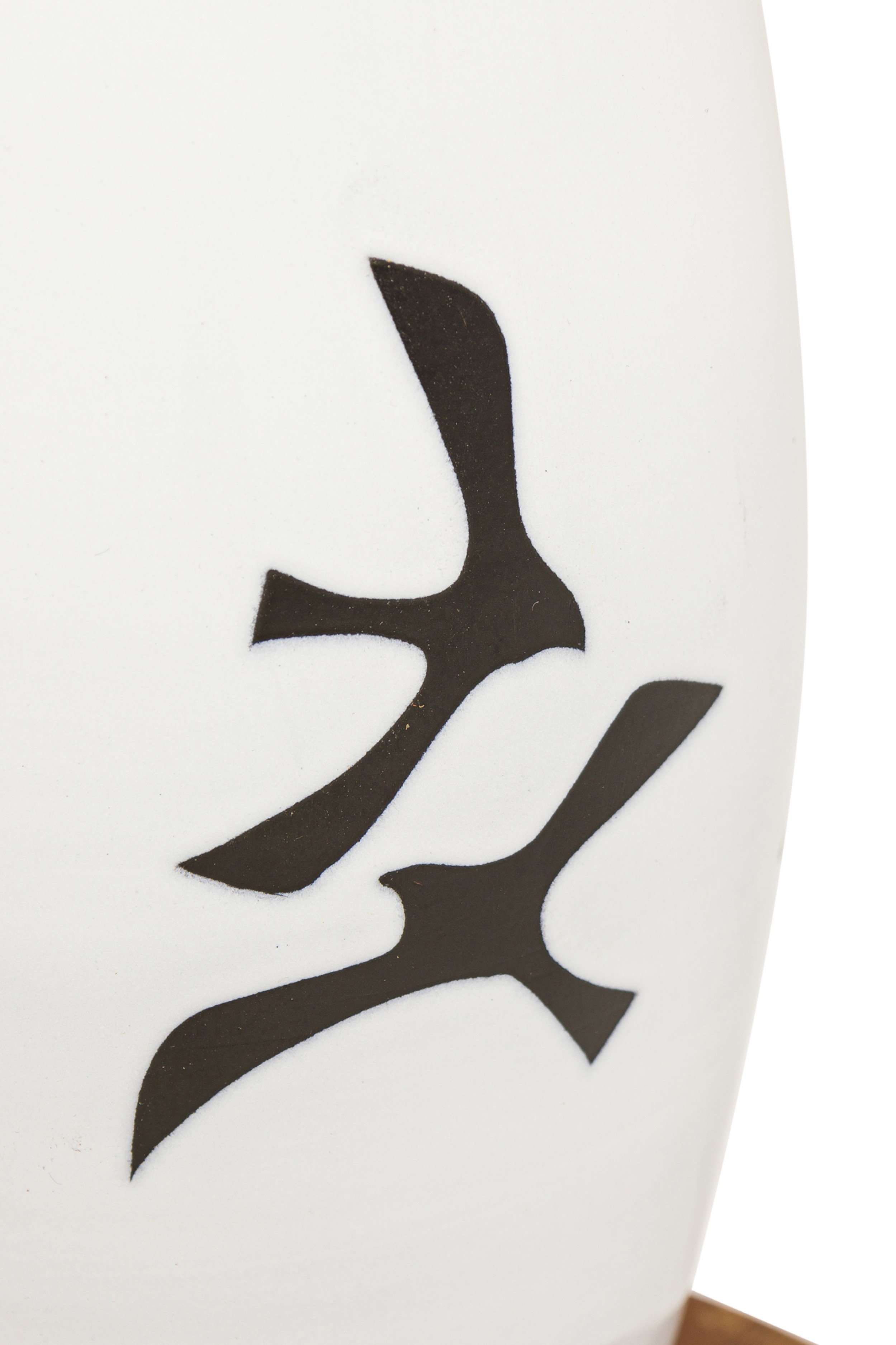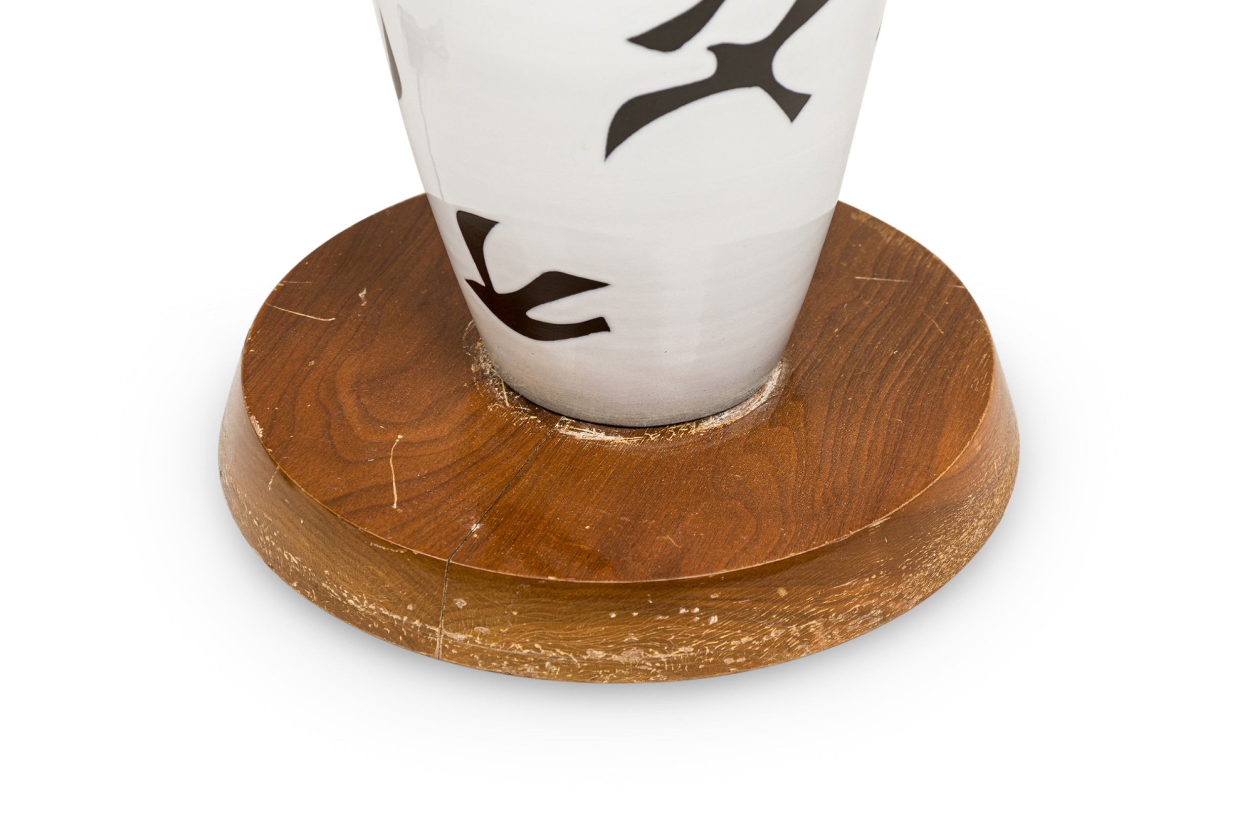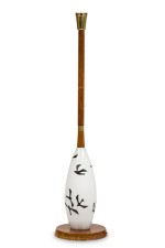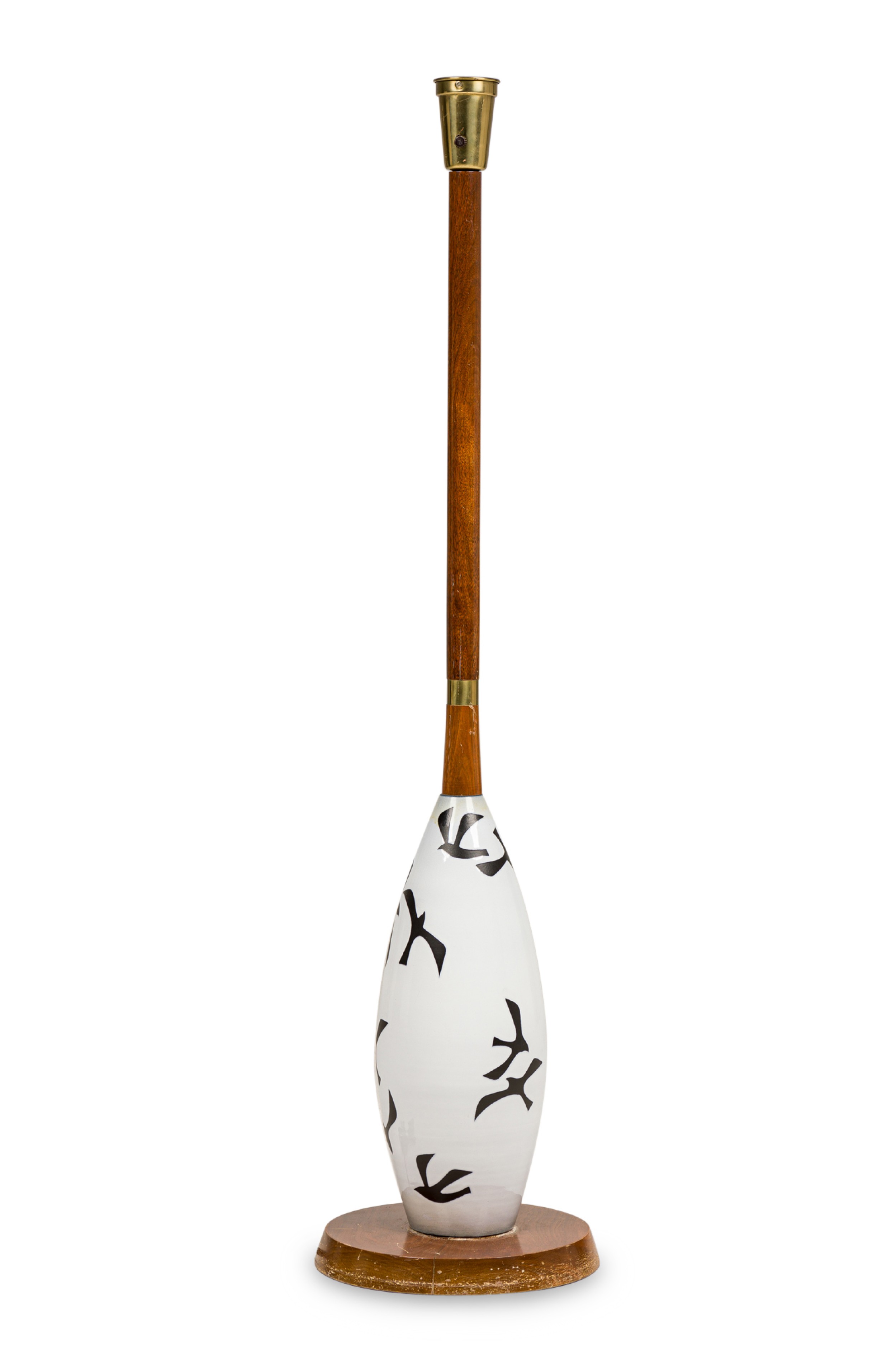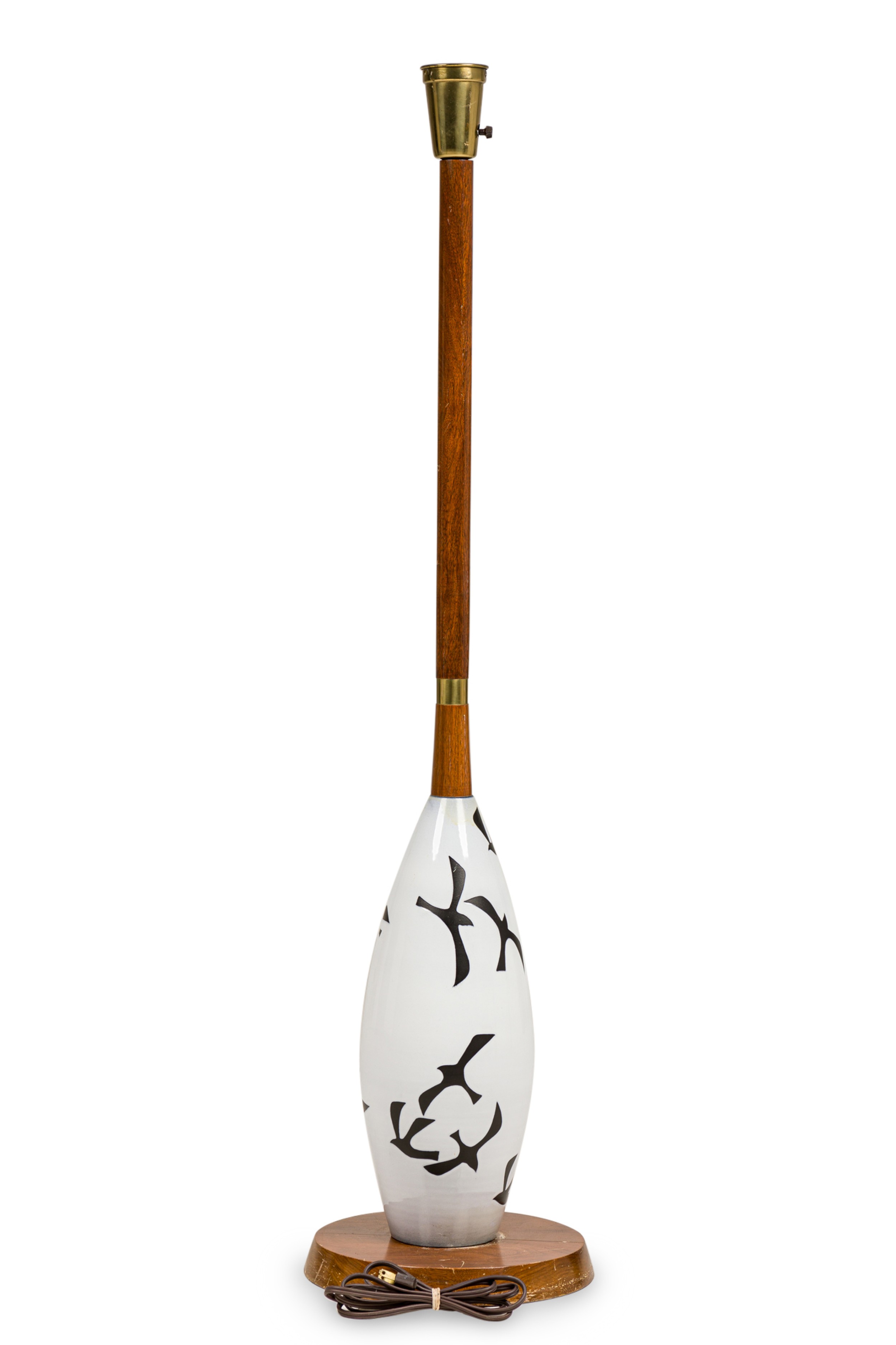 American Mid-Century floor lamp featuring a milk glass pendant at the base with hand painted bird design atop a round wooden base and turned wooden stem
