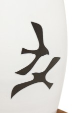 American Mid-Century floor lamp featuring a milk glass pendant at the base with hand painted bird design atop a round wooden base and turned wooden stem.