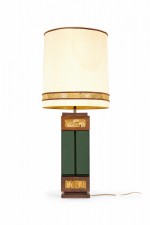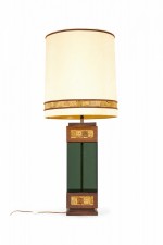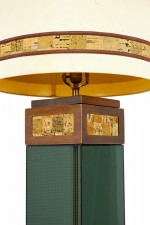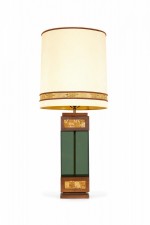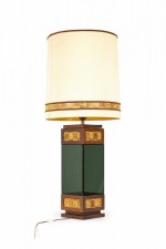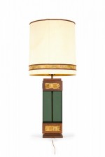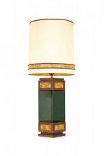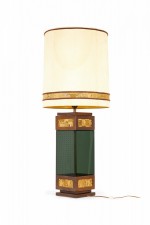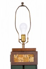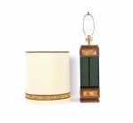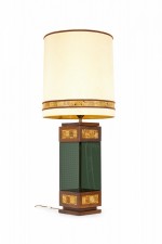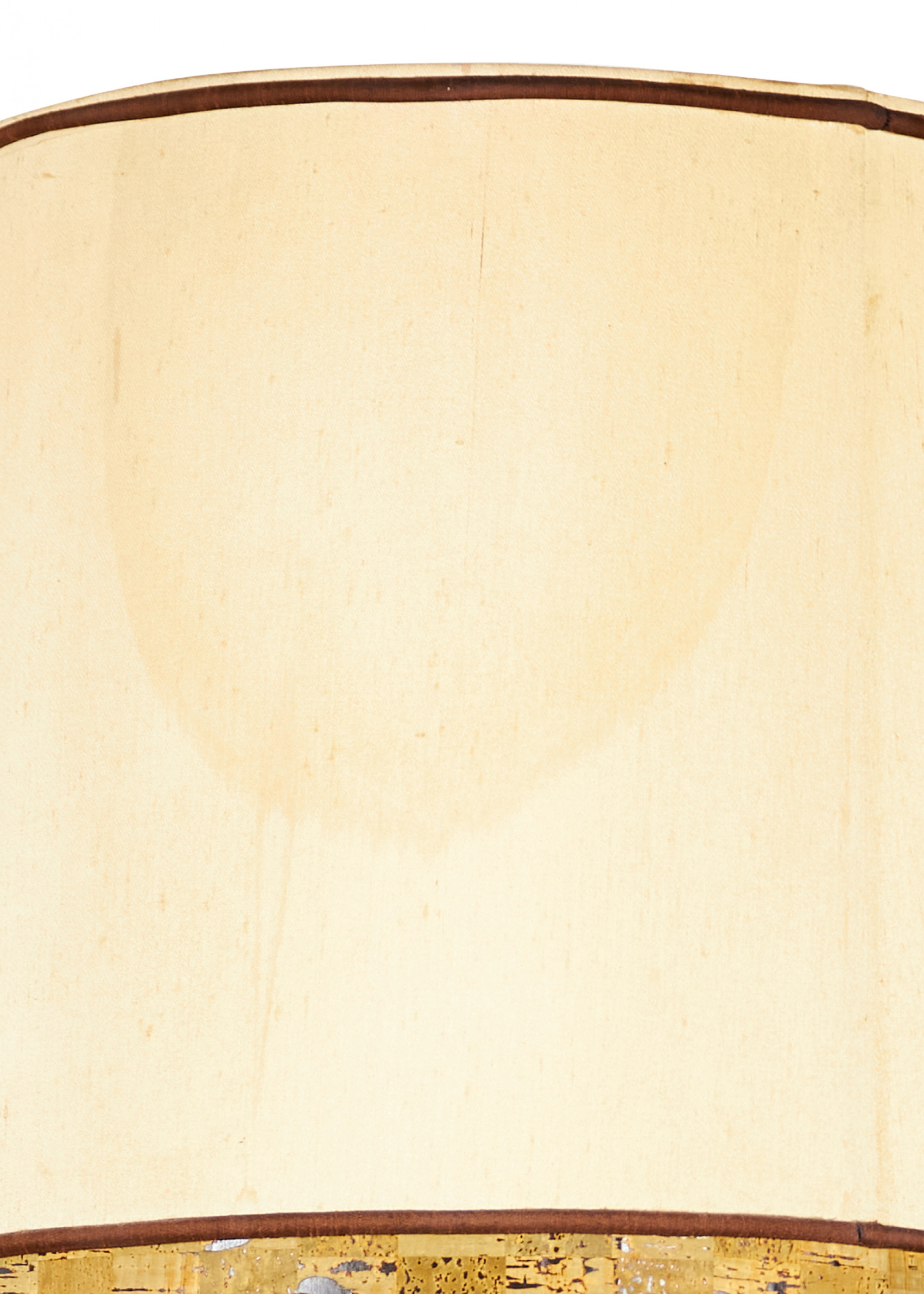 Style: Mid-Century Materials & Techniques: Brass, cork, glass, metal Category: Lighting Condition: Ships with shade. Good; Wear consistent with age and use