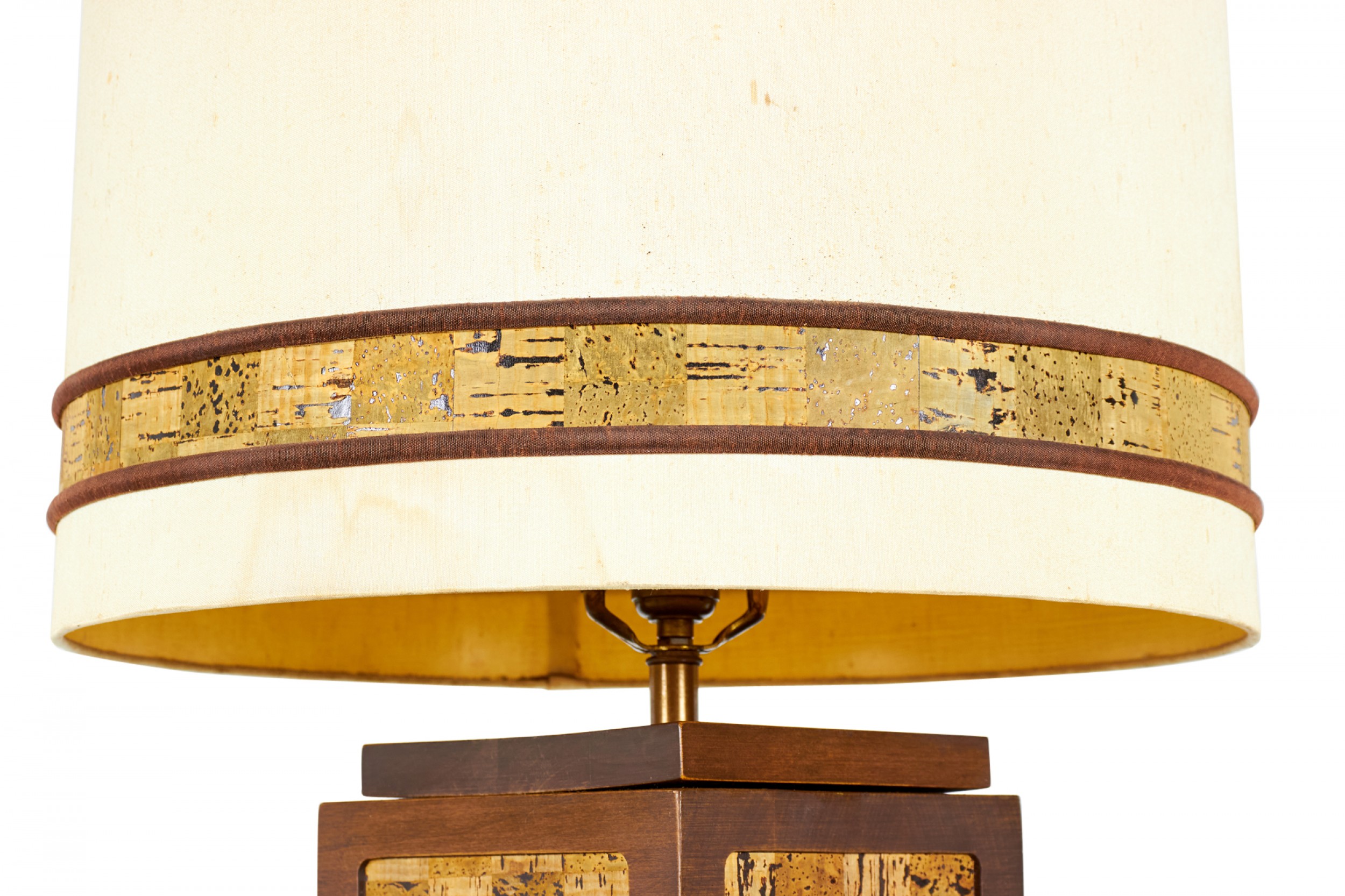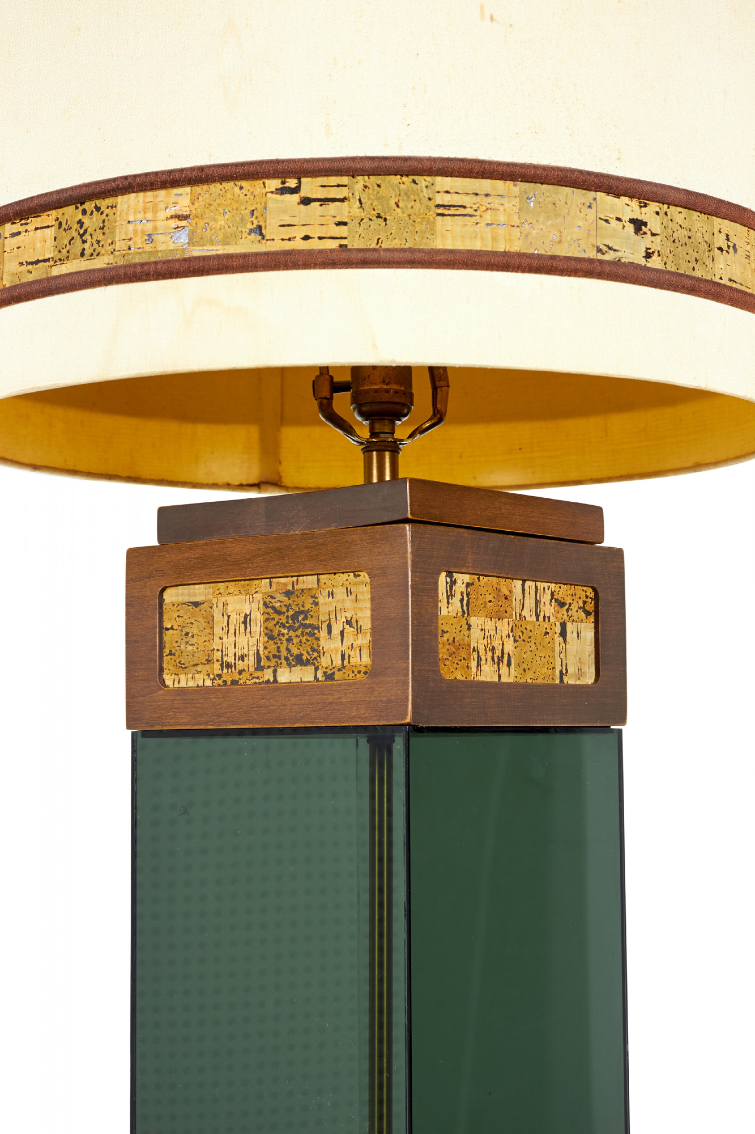 American Mid-Century table lamp with a square smoked glass base with cork insets and brass trip and hardware, topped with a matching beige fabric drum shade with a decorative cork band.