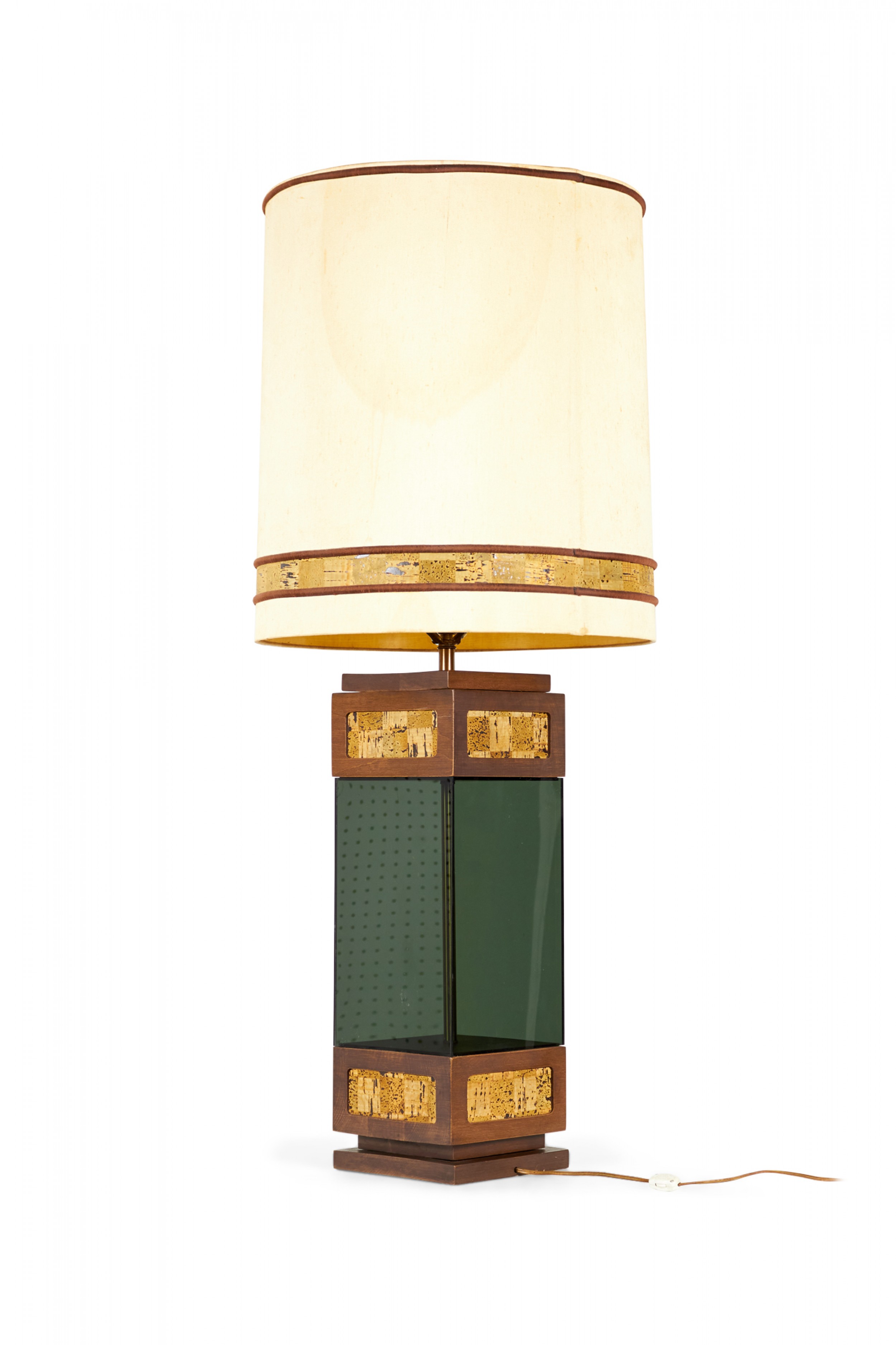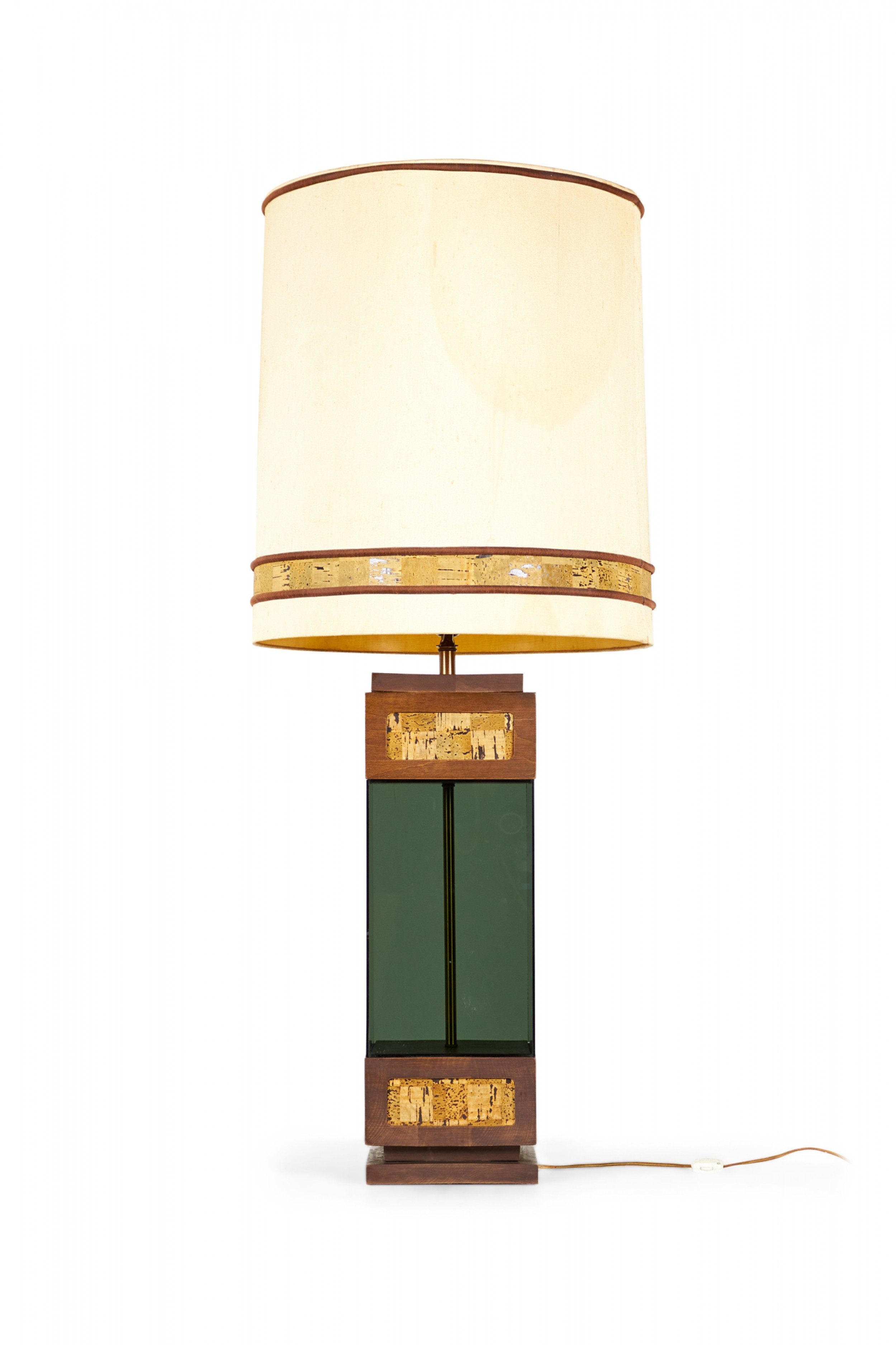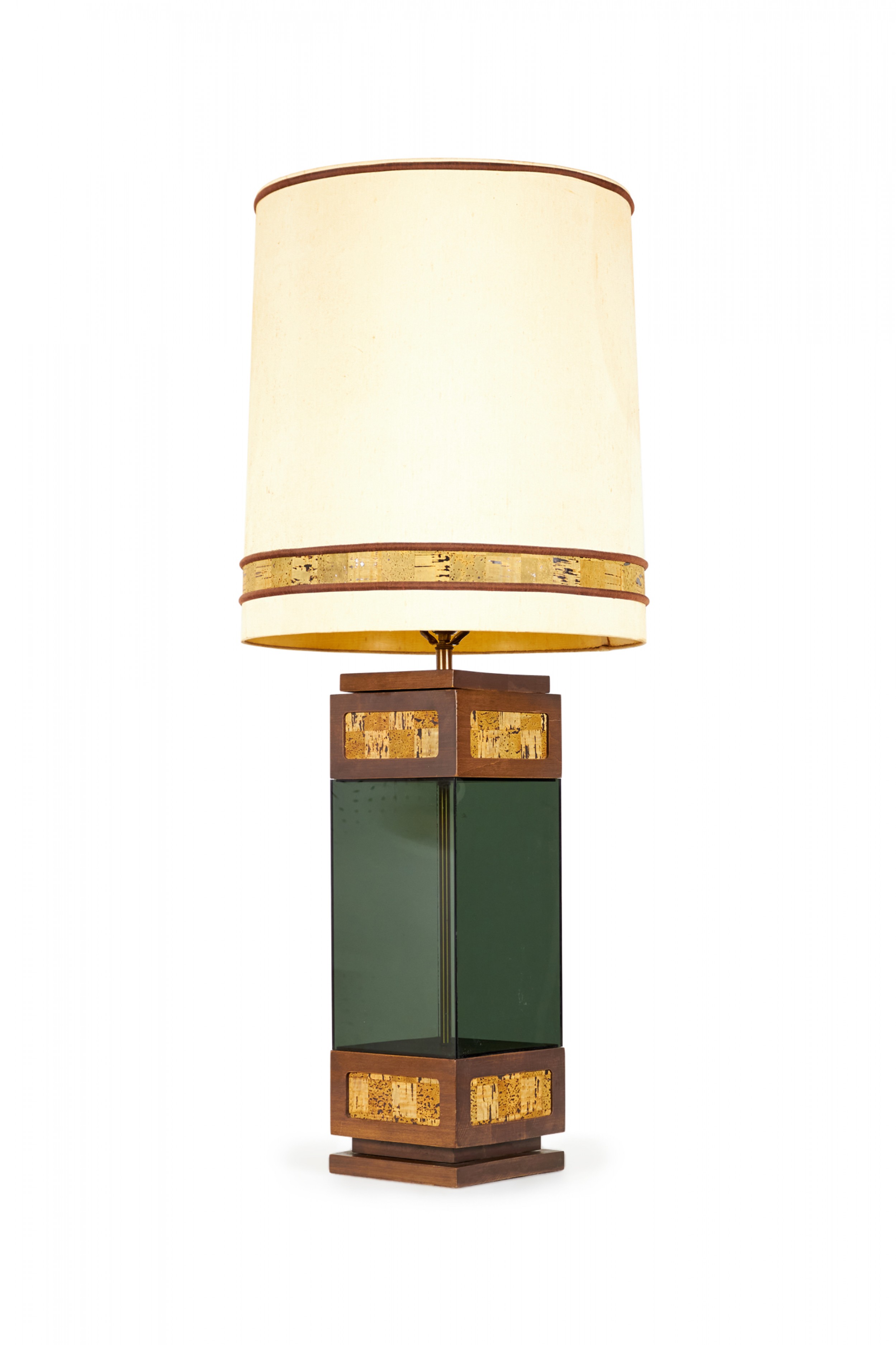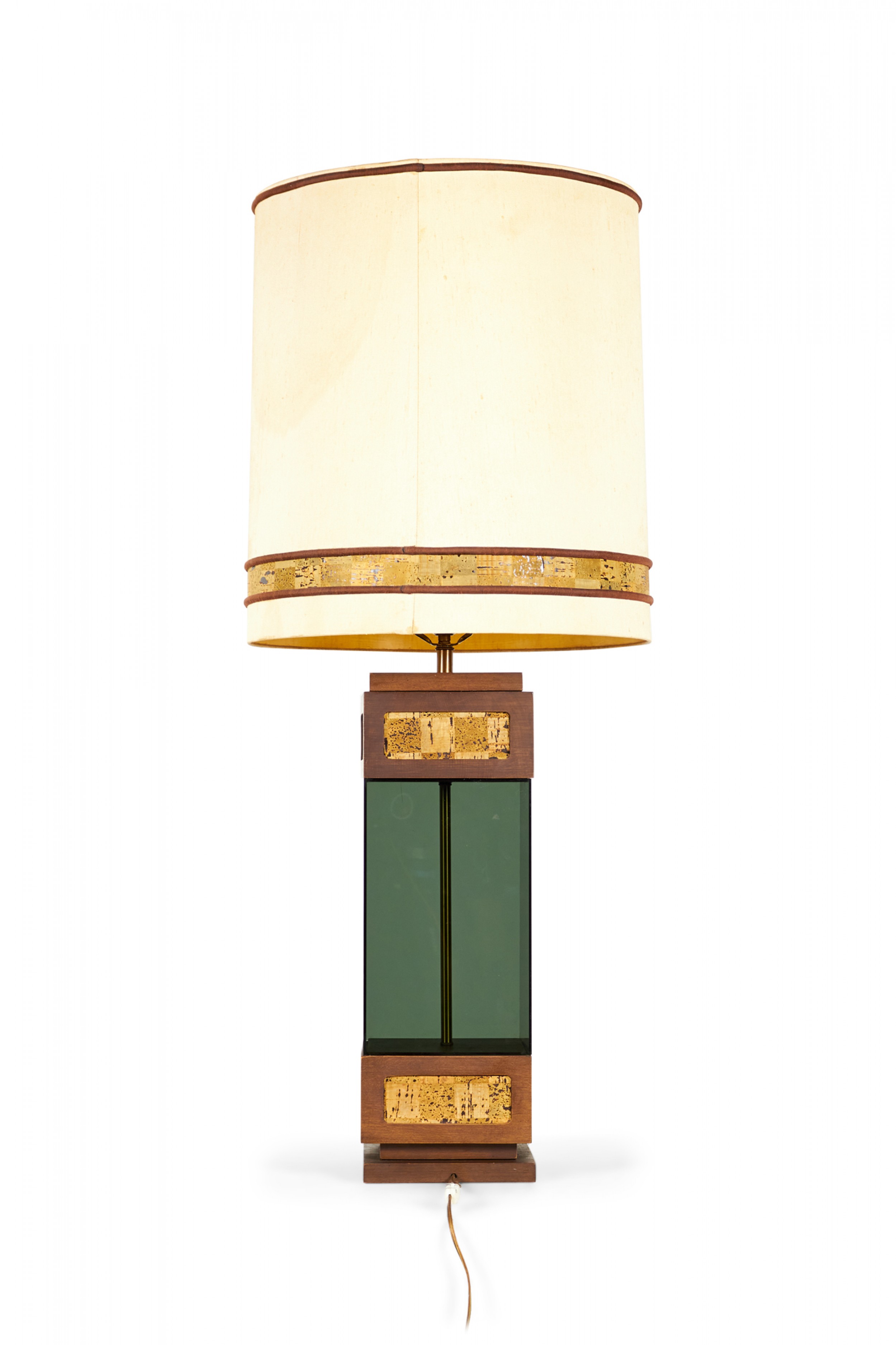 American Mid-Century table lamp with a square smoked glass base with cork insets and brass trip and hardware, topped with a matching beige fabric drum shade with a decorative cork band..