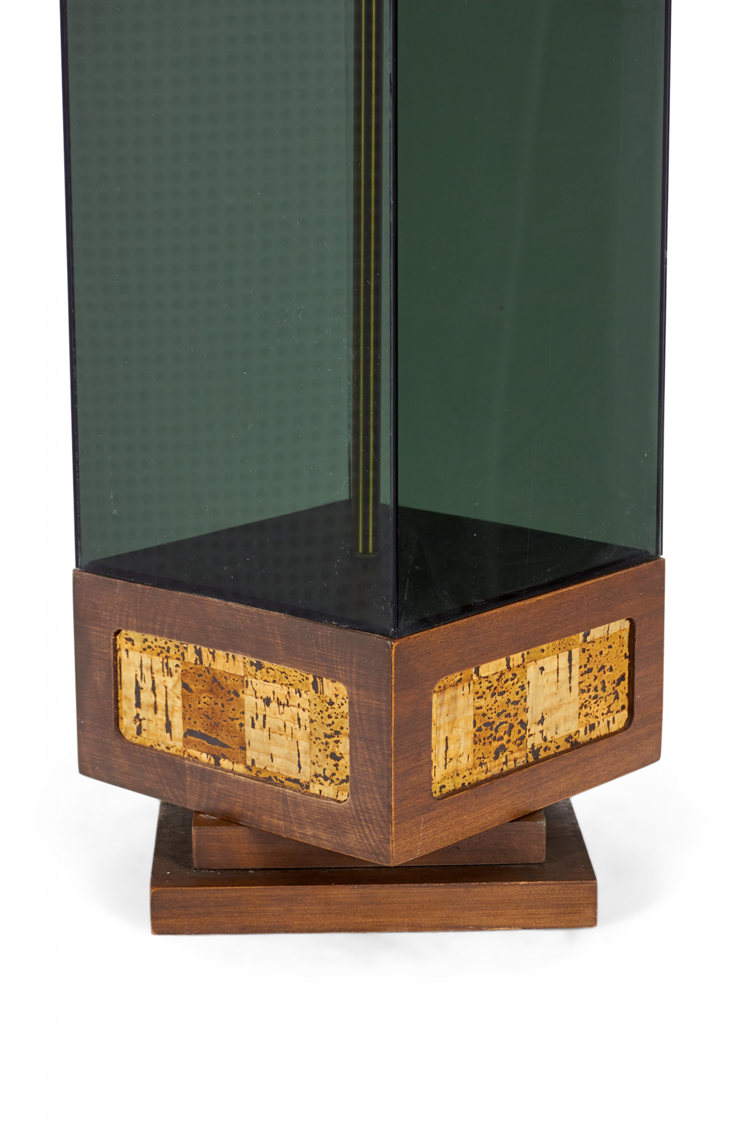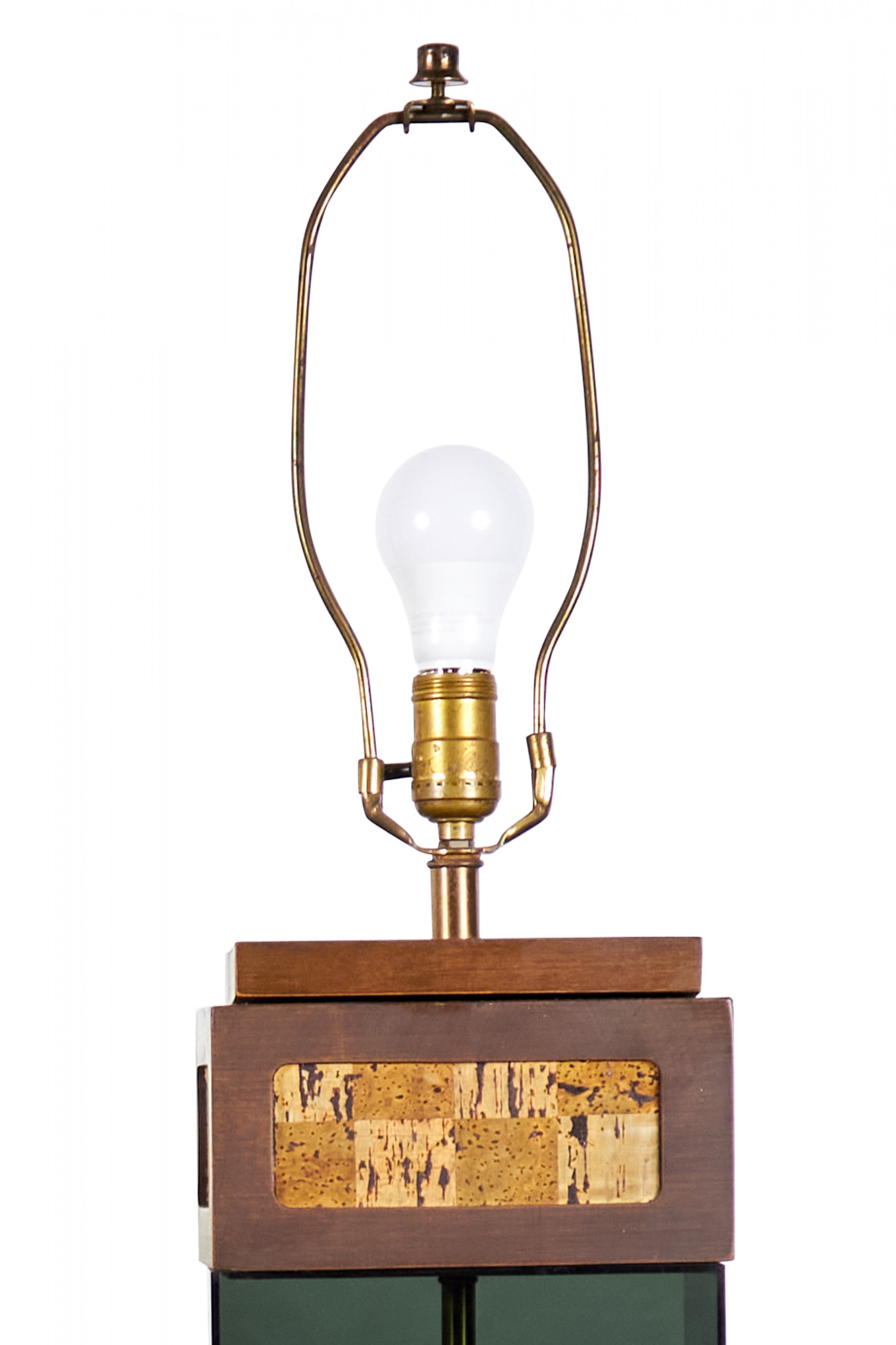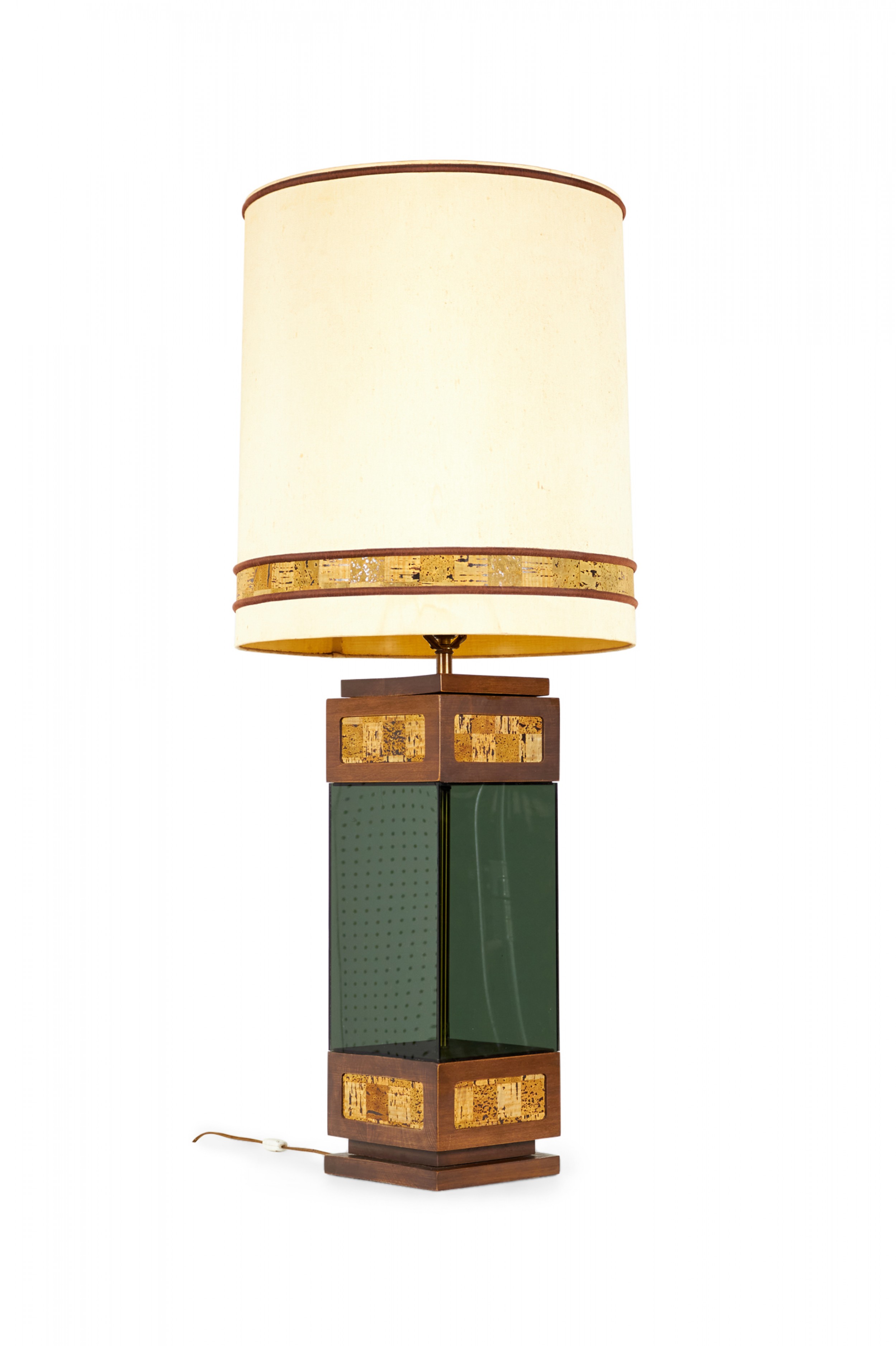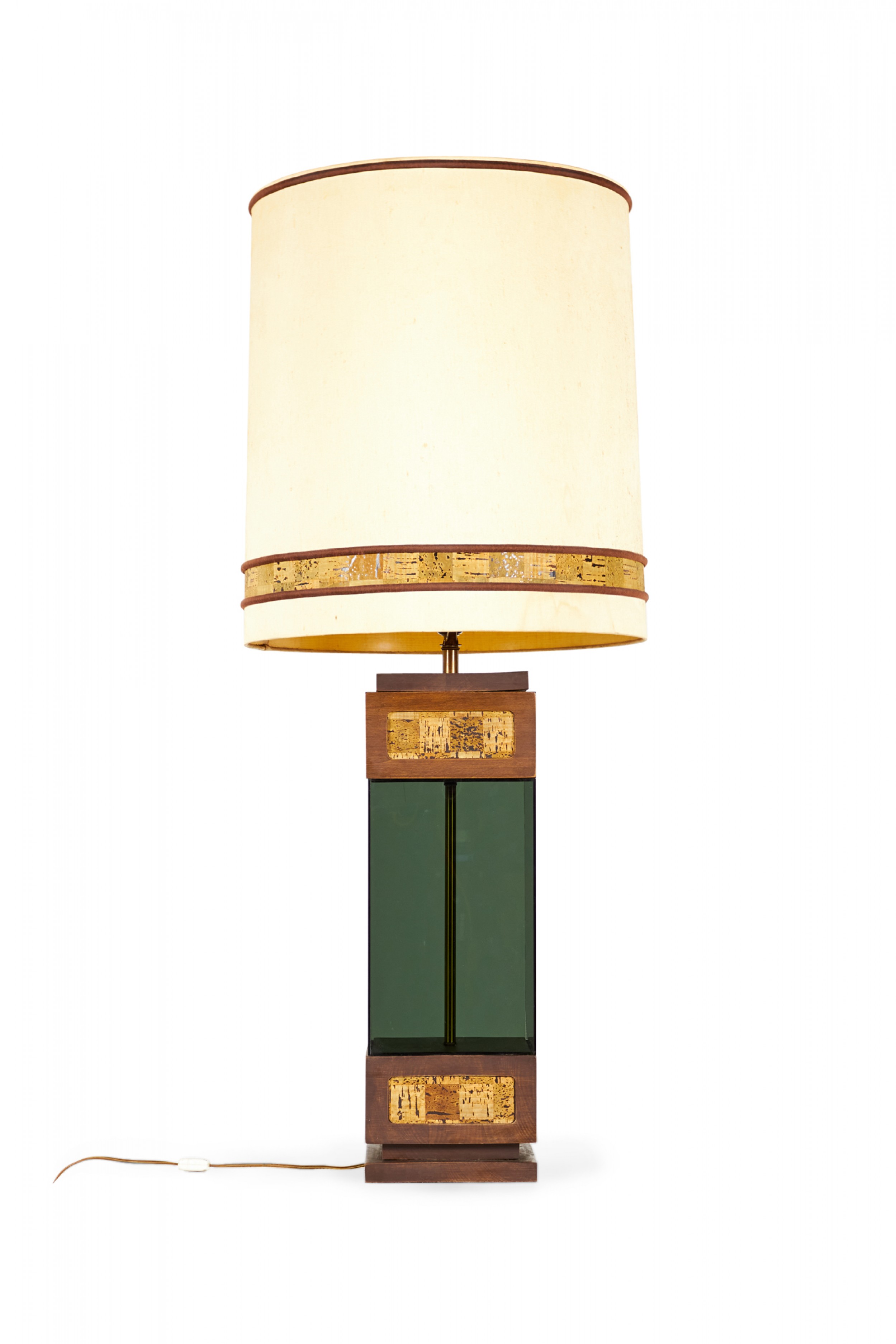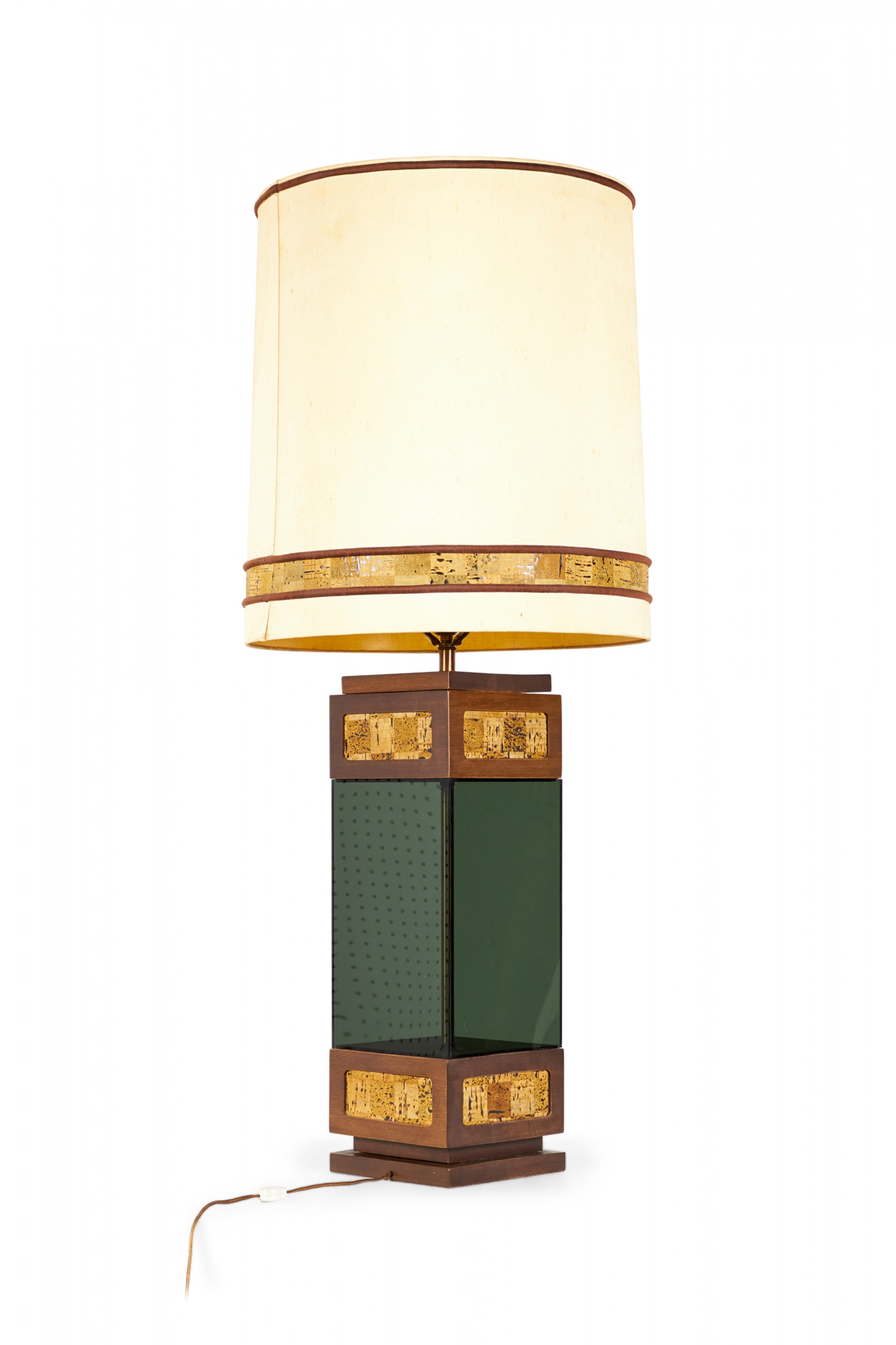American Mid-Century table lamp with a square smoked glass base with cork insets and brass trip and hardware, topped with a matching beige fabric drum shade with a decorative cork band..
