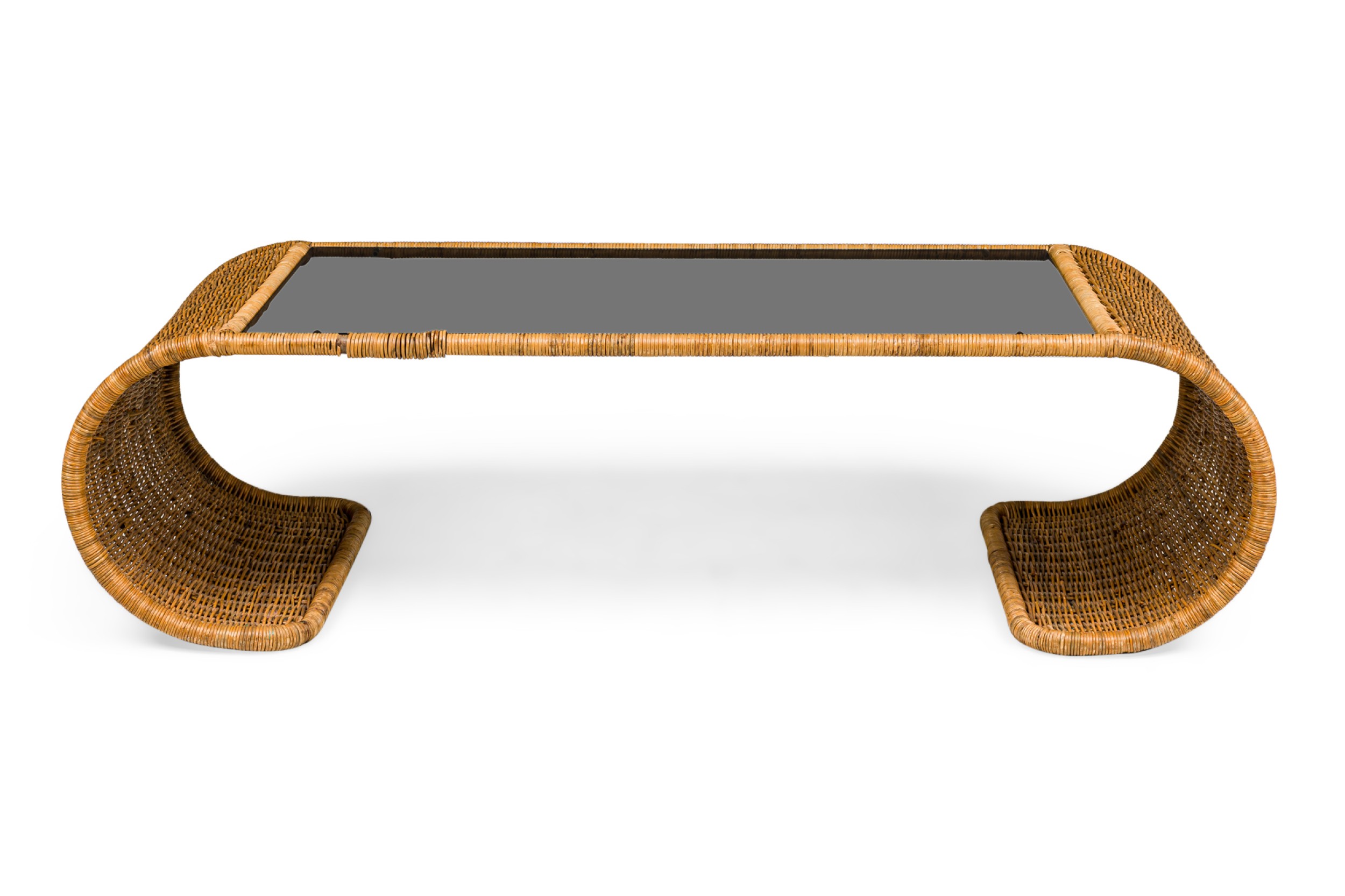 American Mid-Century smoked glass and wicker waterfall edged cocktail table with curved scroll legs.