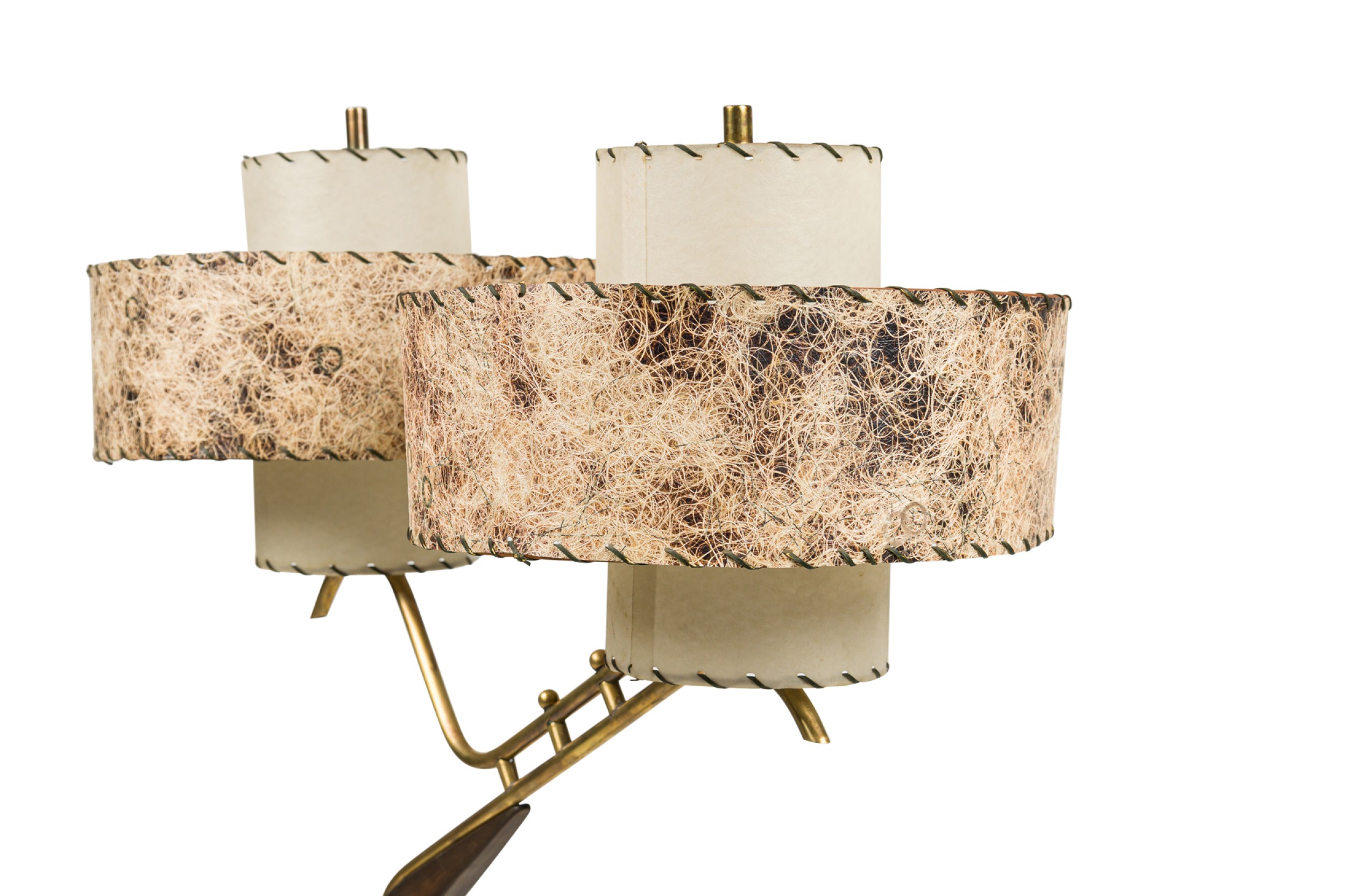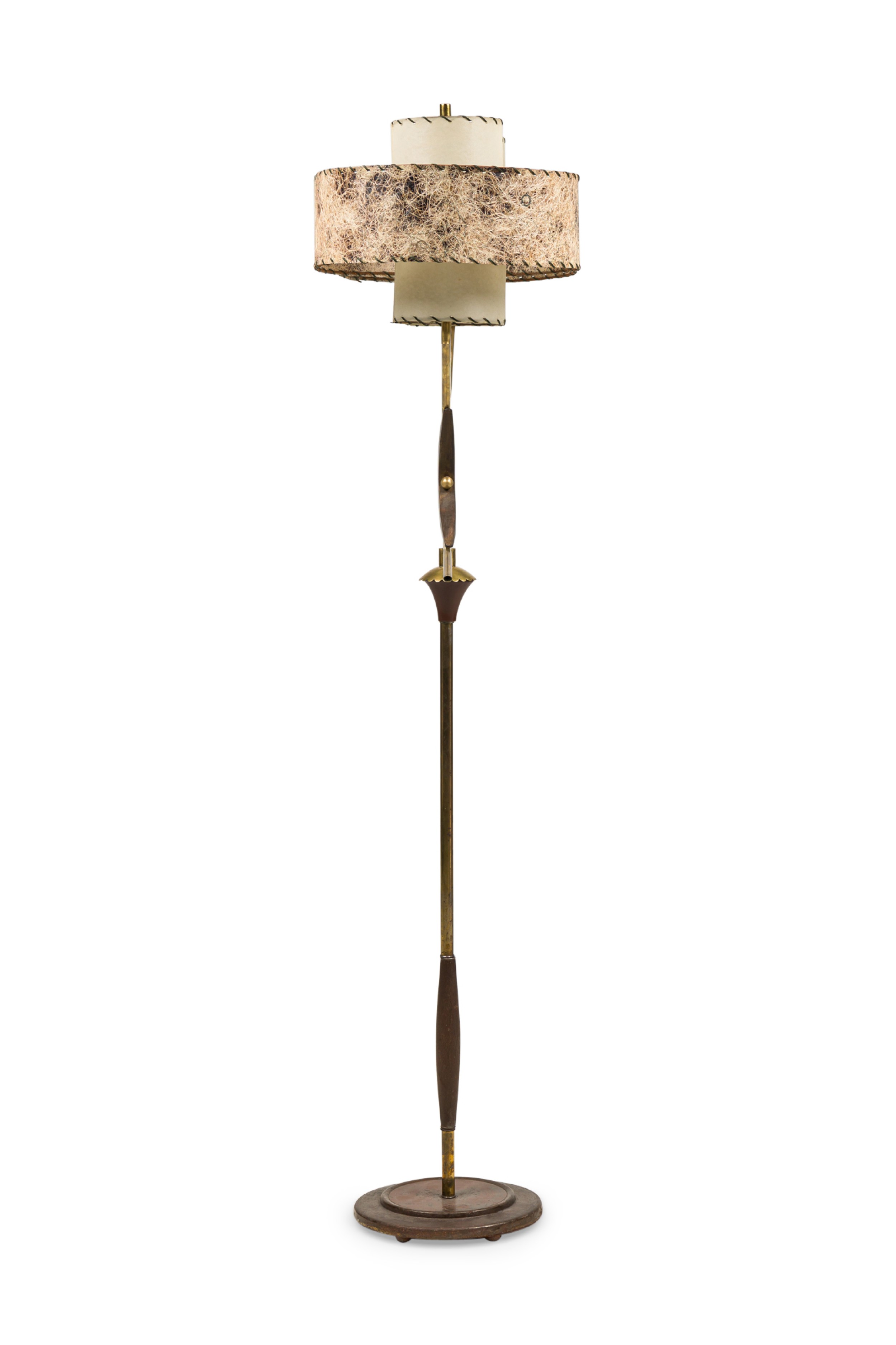 American Mid-Century twin light standing floor lamp with a boomerang shaped teak feature separating a 3-tier shade design consisting of hand stitched banded vellum on upper and lower sections with a larger middle portion handmade from natural fibers.