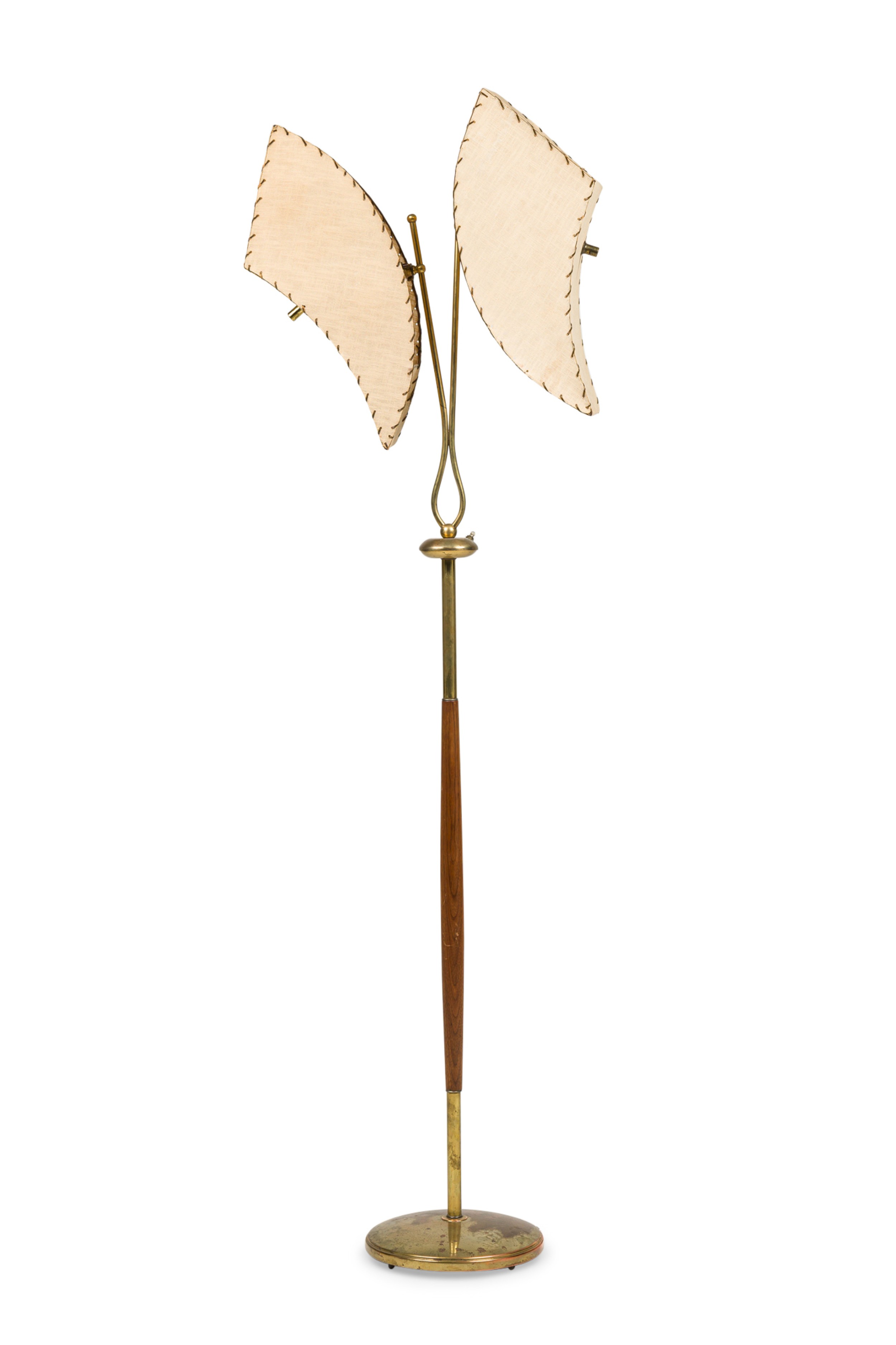 American Mid-Century walnut and brass twin fixture floor lamp with a handcrafted shades made of vellum and other natural fibers