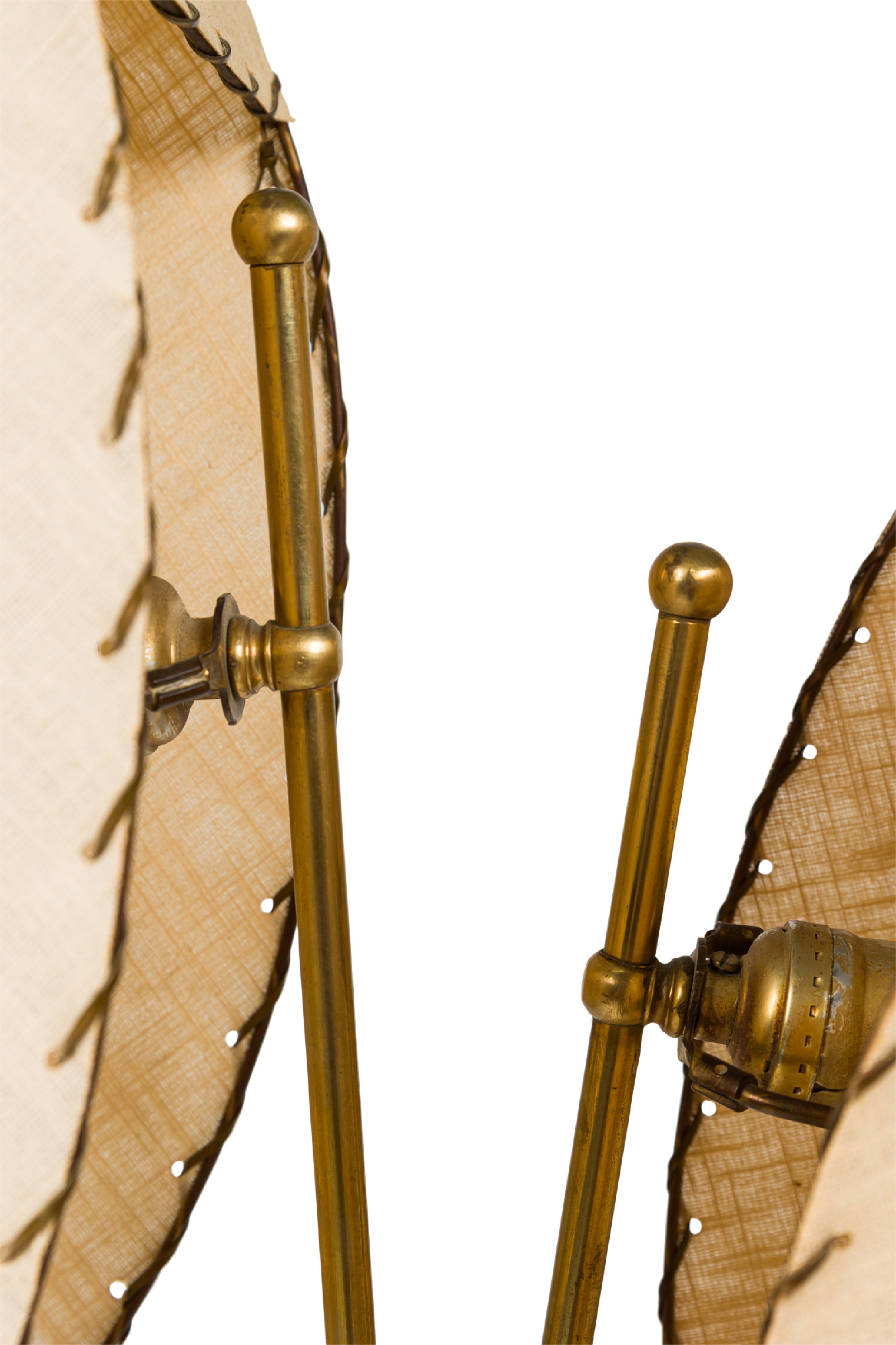 American Mid-Century walnut and brass twin fixture floor lamp with a handcrafted shades made of vellum and other natural fibers.