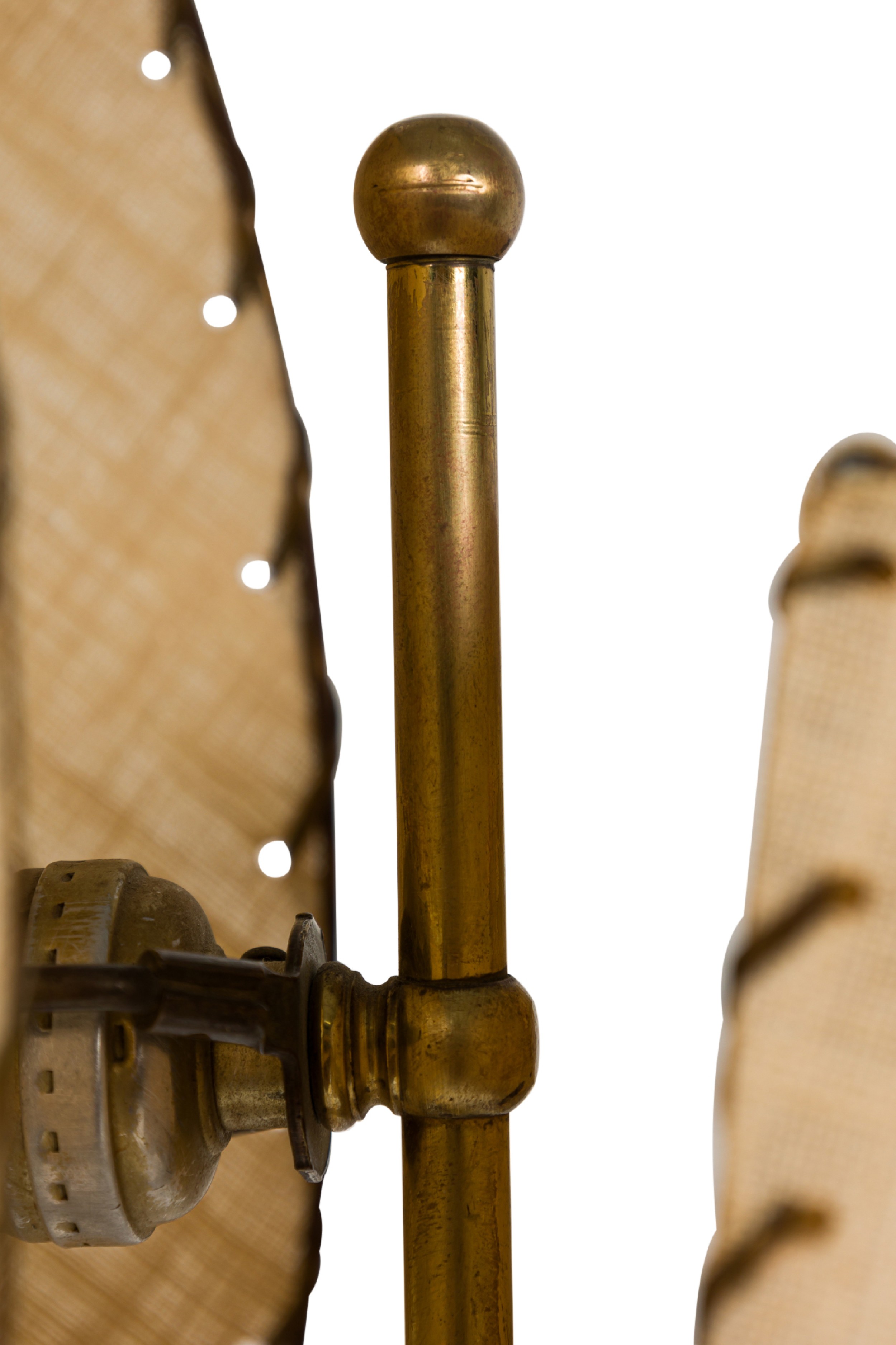 American Mid-Century walnut and brass twin fixture table lamp with handcrafted shades made of vellum and other natural fibers