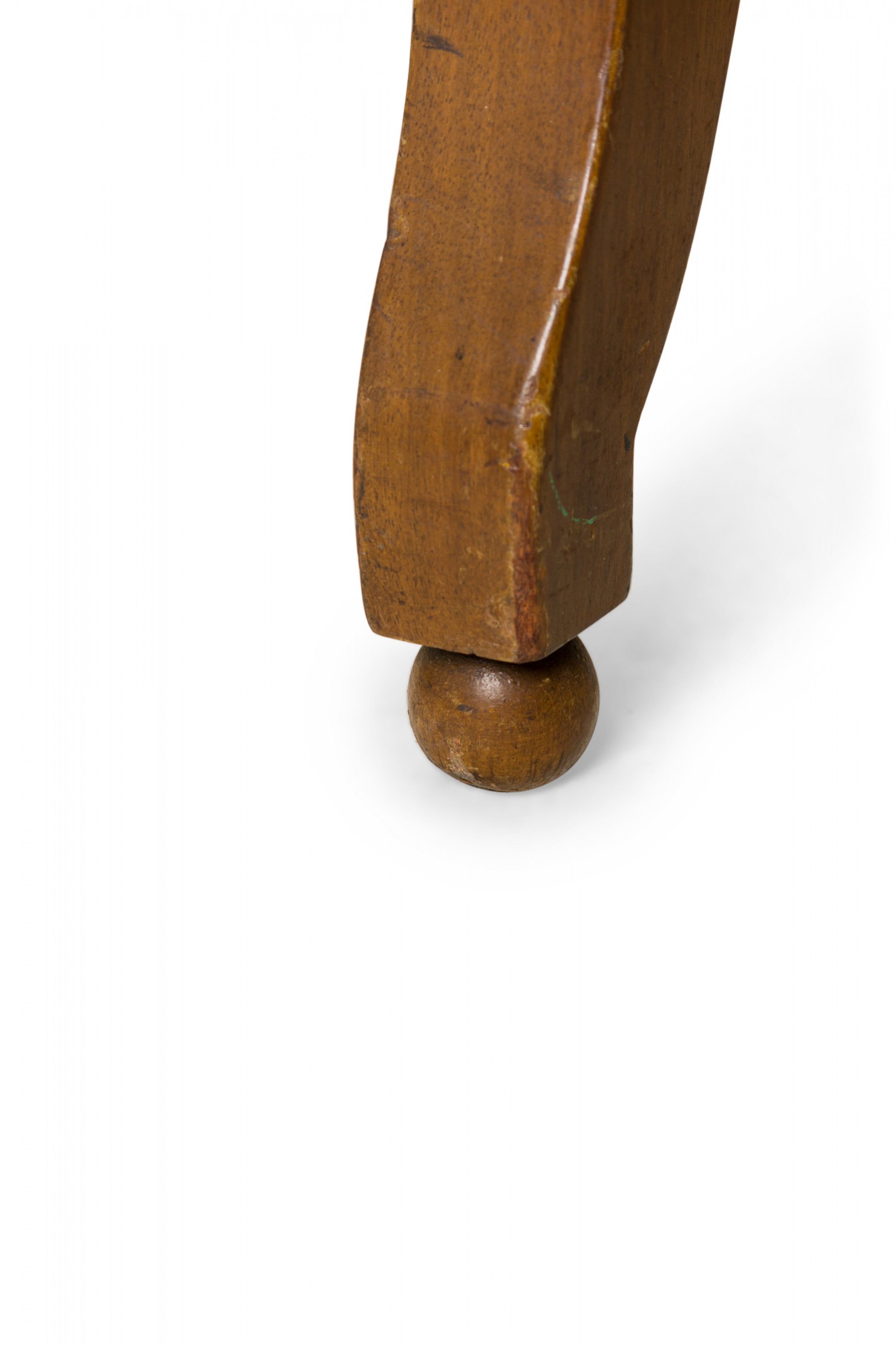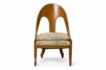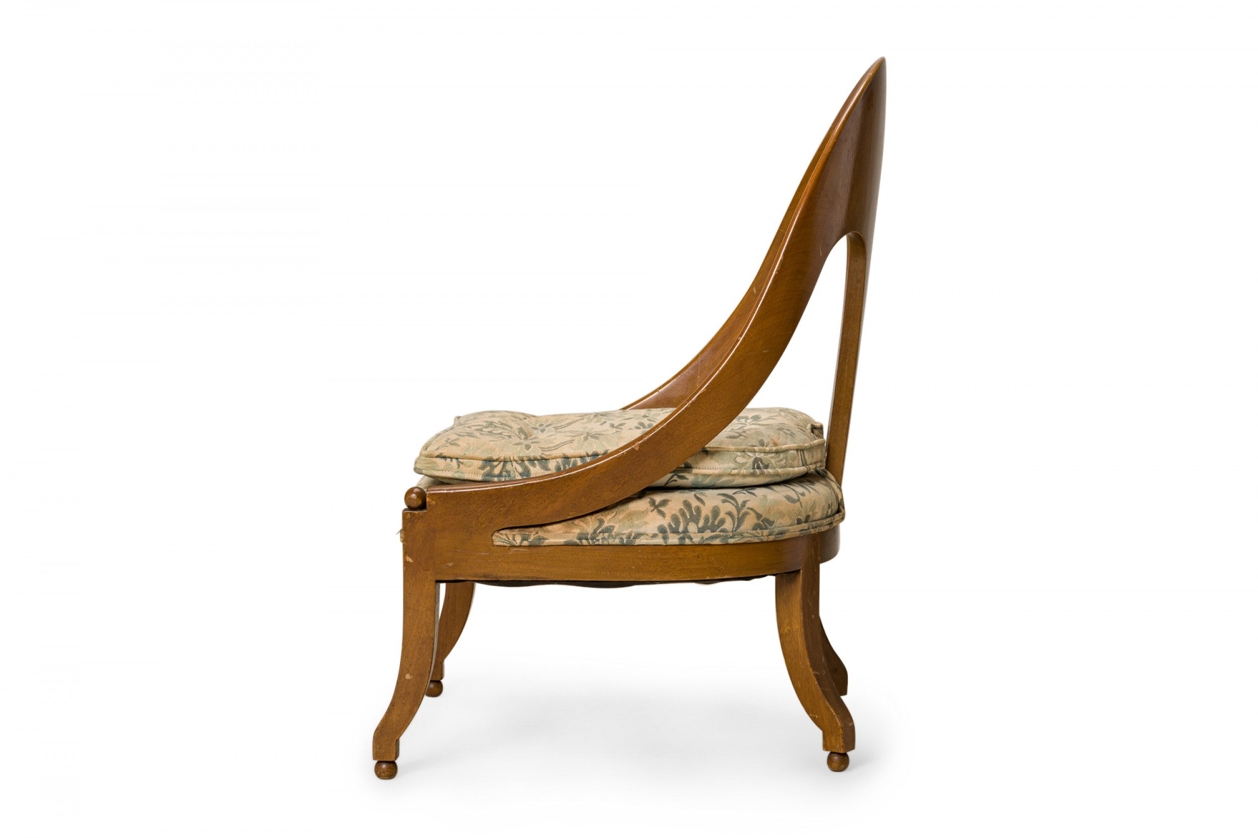American Mid-Century spoon back side / pull up chair with a walnut frame and a floral beige and blue fabric upholstered seat, resting on four square curved legs ending in ball feet. (Similar pieces: DUF0427-DUF0431).