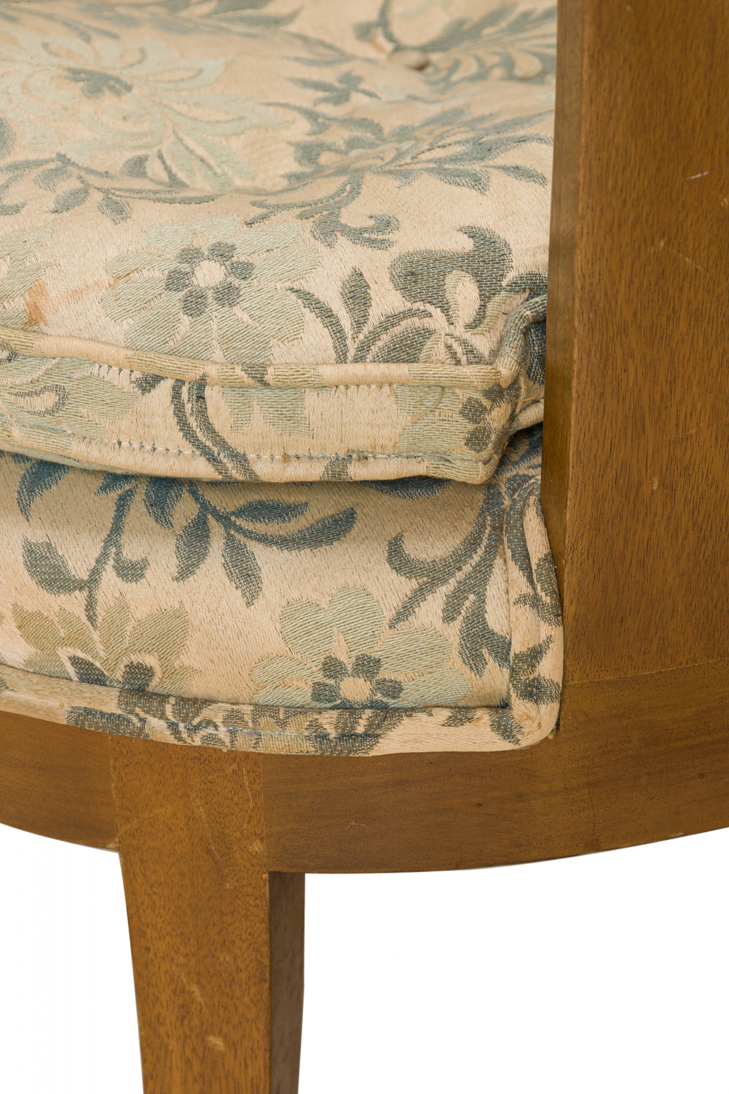 American Mid-Century spoon back side / pull up chair with a walnut frame and a floral beige and blue fabric upholstered seat, resting on four square curved legs ending in ball feet. (Similar pieces: DUF0427-DUF0431)