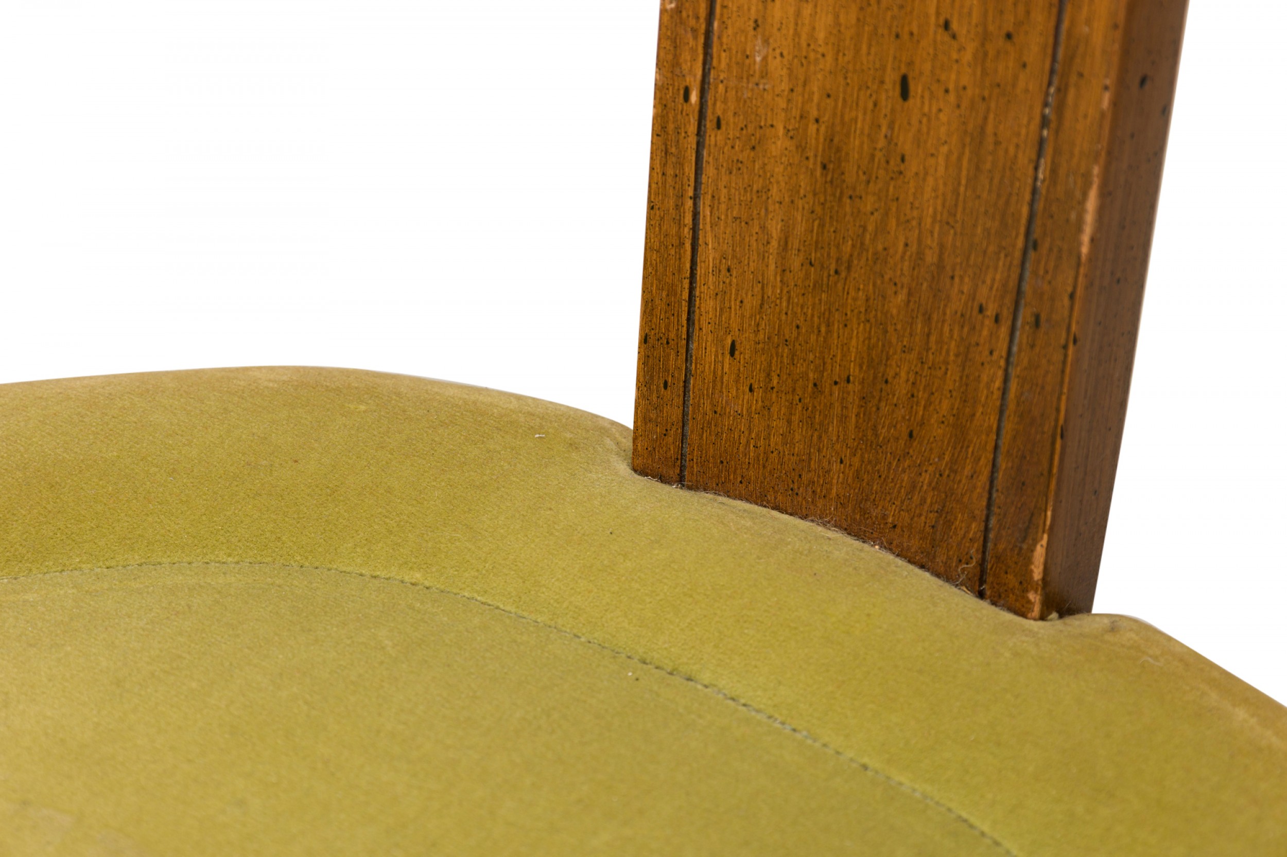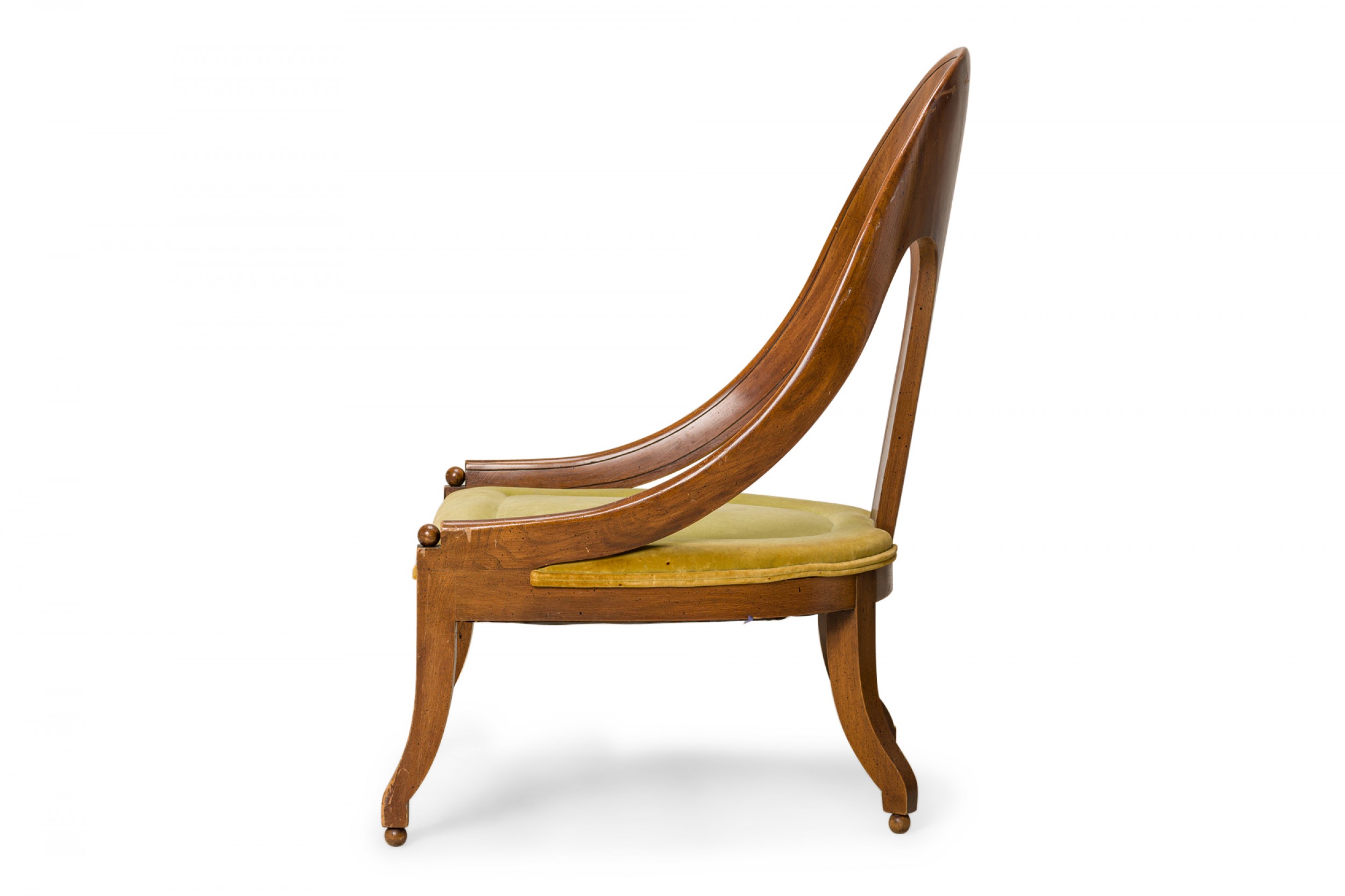 American Mid-Century spoon back side / pull up chair with a walnut frame and green velvet upholstered seat, resting on four square curved legs ending in ball feet. (Similar pieces: DUF0427-DUF0431)