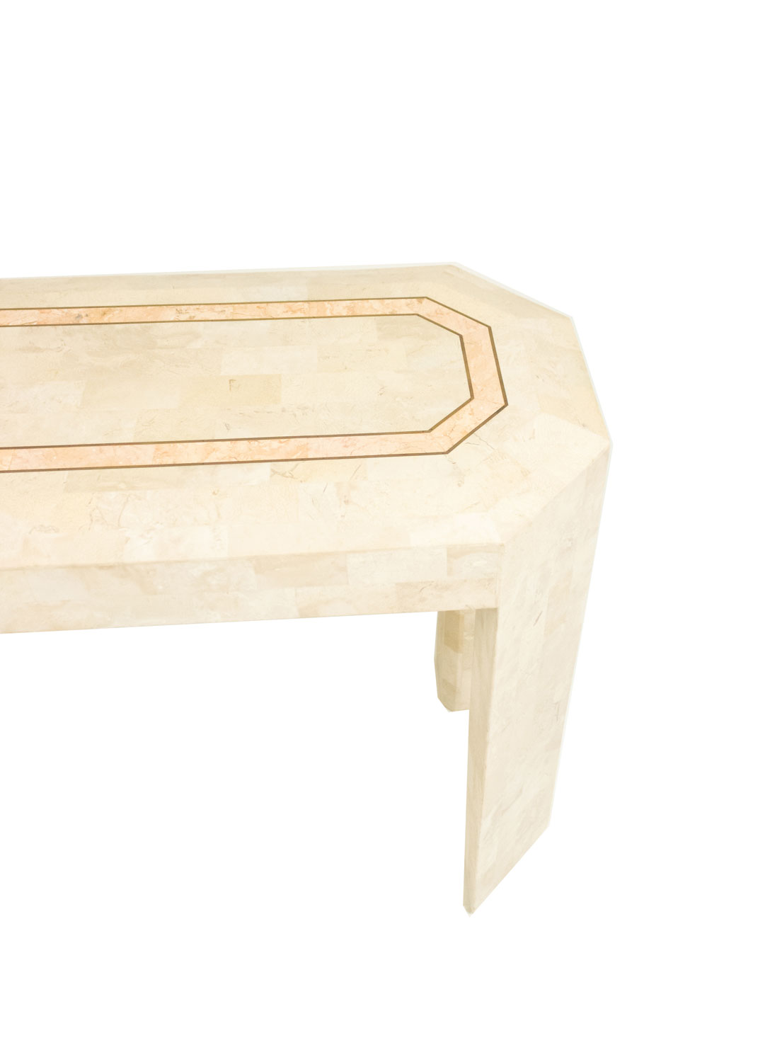 American Mid-Century beige tessellated hardstone faceted console table with pink hardstone and brass inlay border (repairs to top edge).