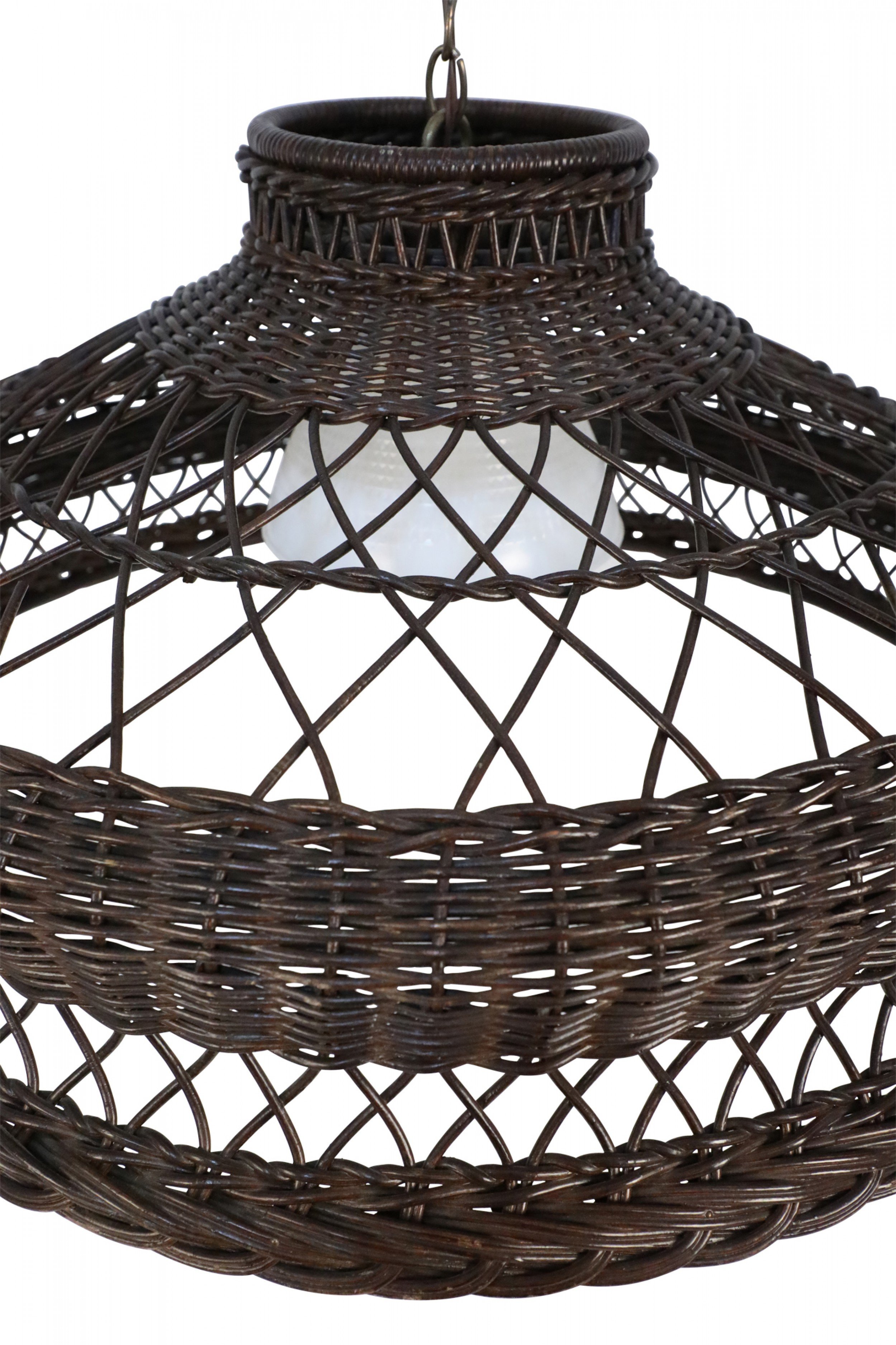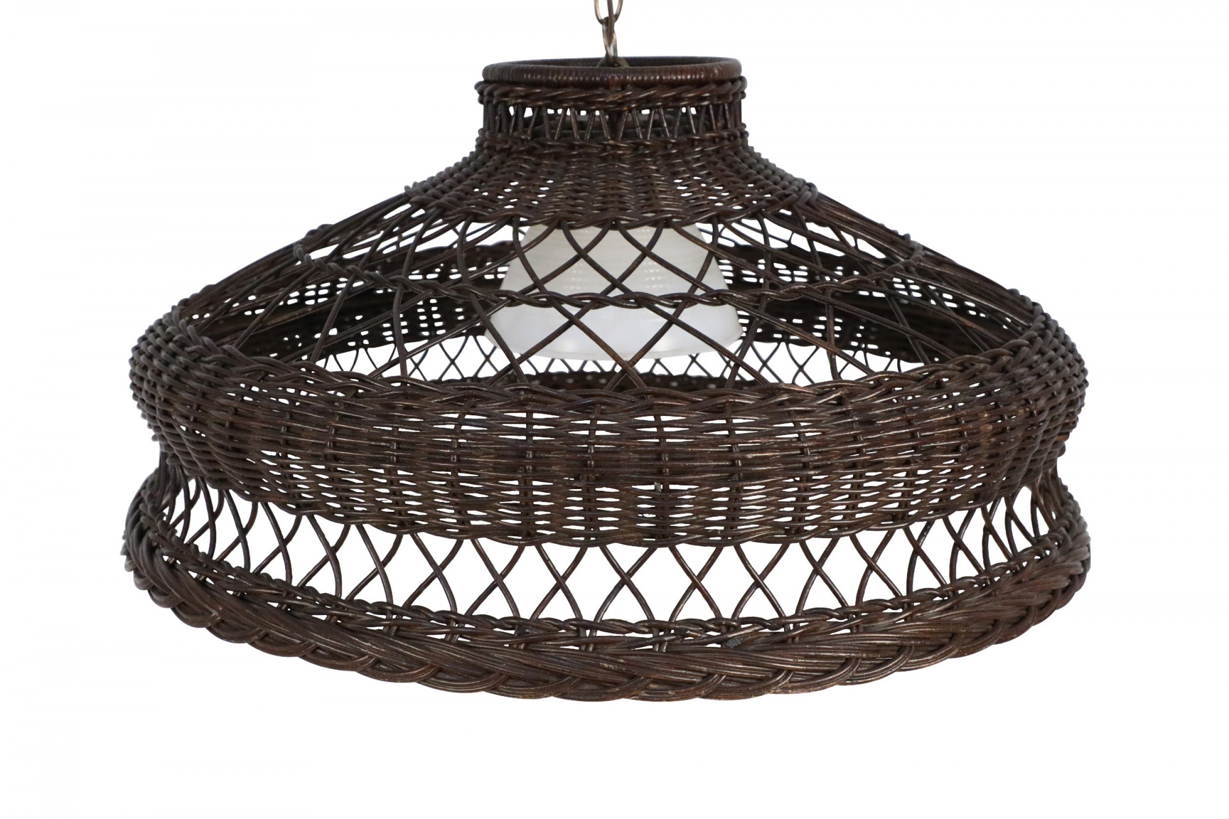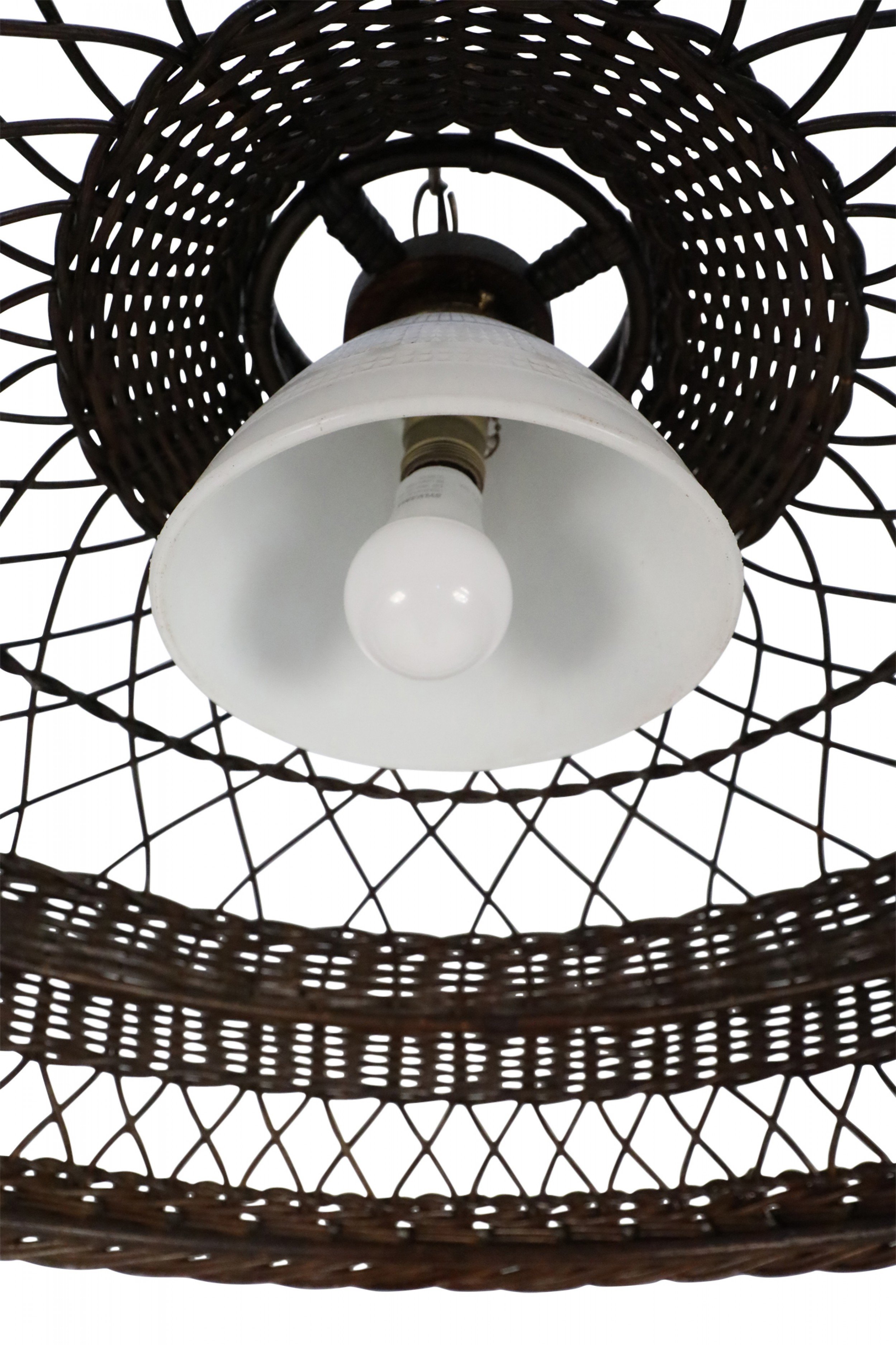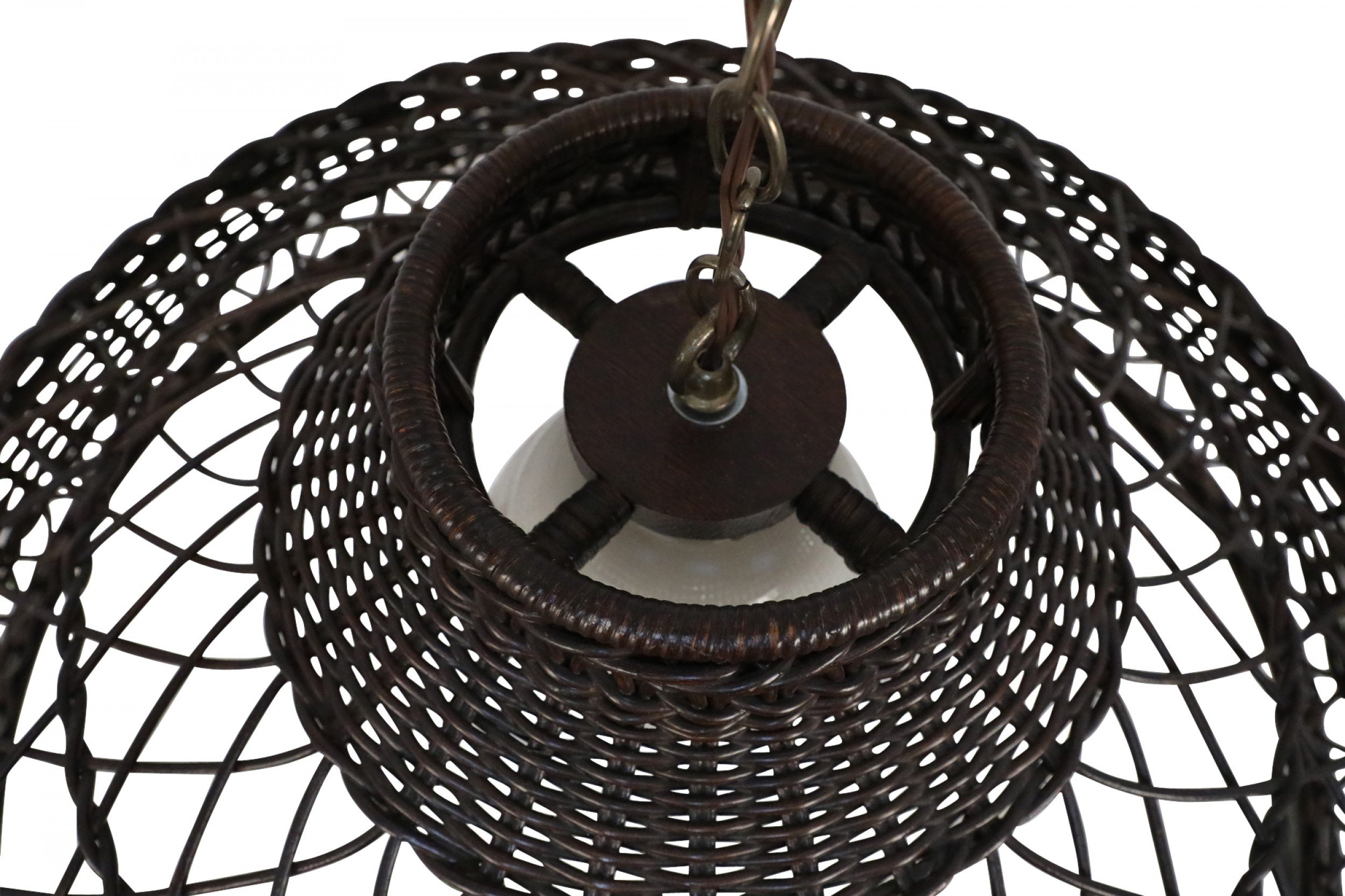 American Victorian (Mission style) chandelier with an exterior circular brown wicker shade and an interior white frosted glass shade..