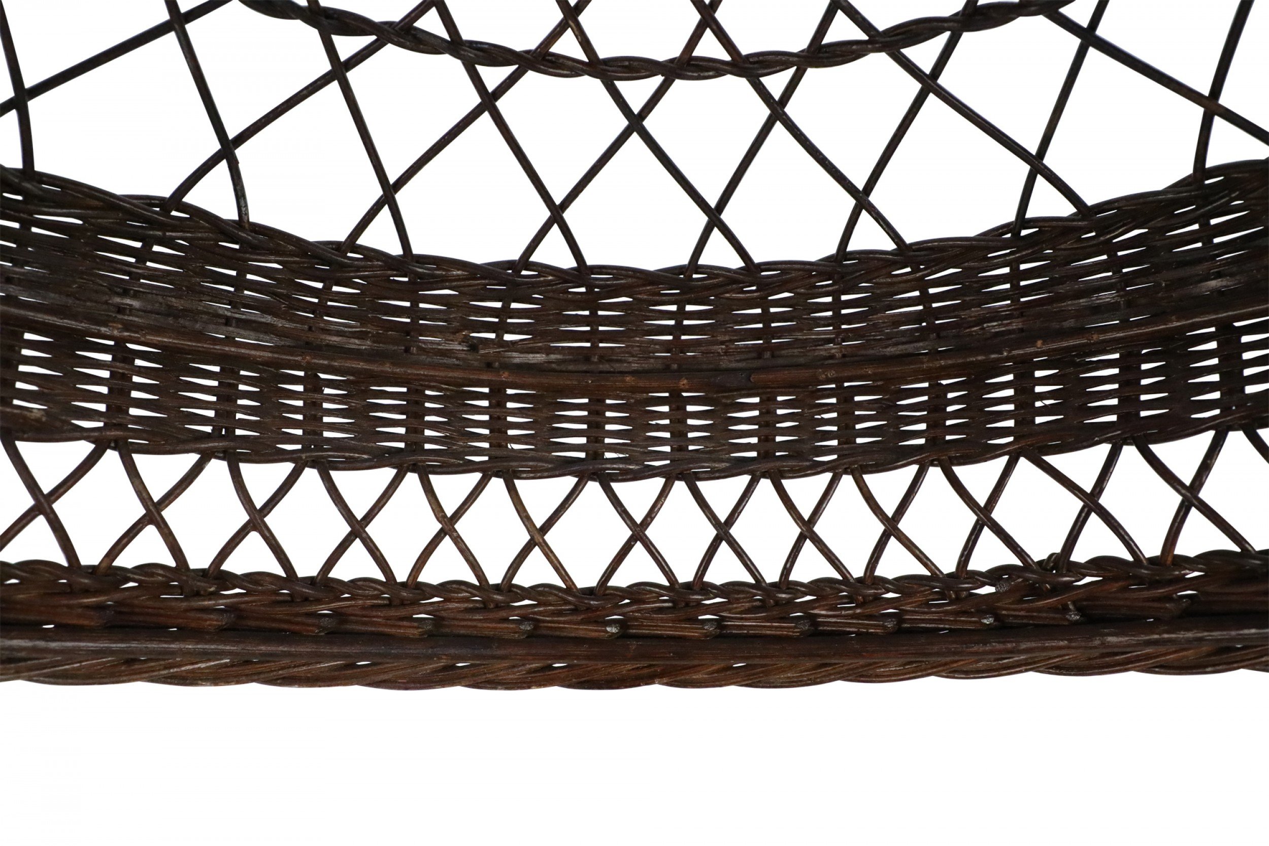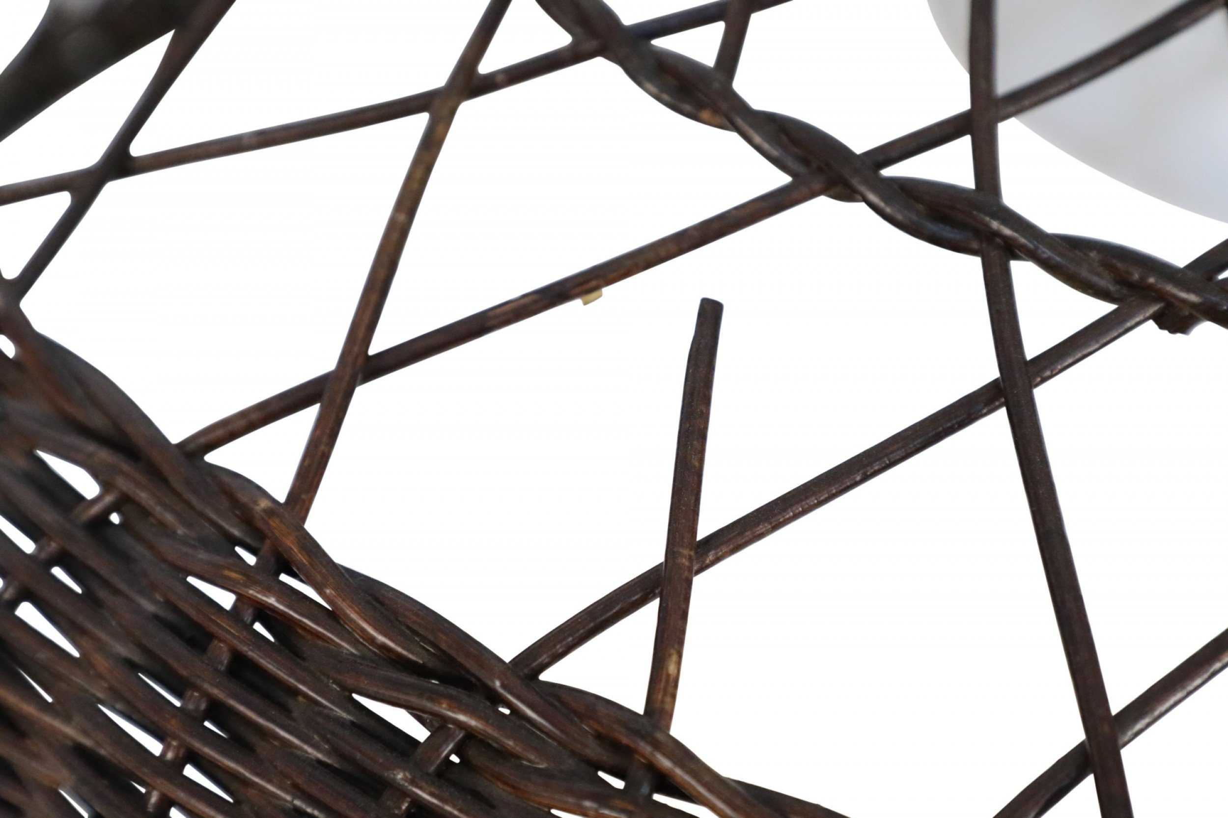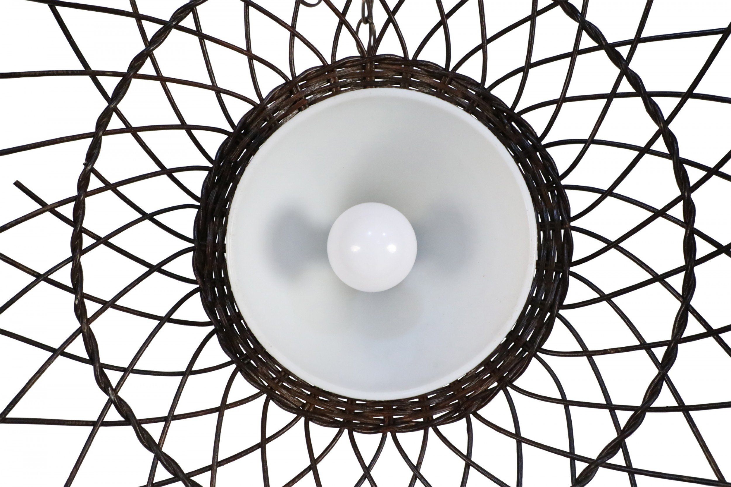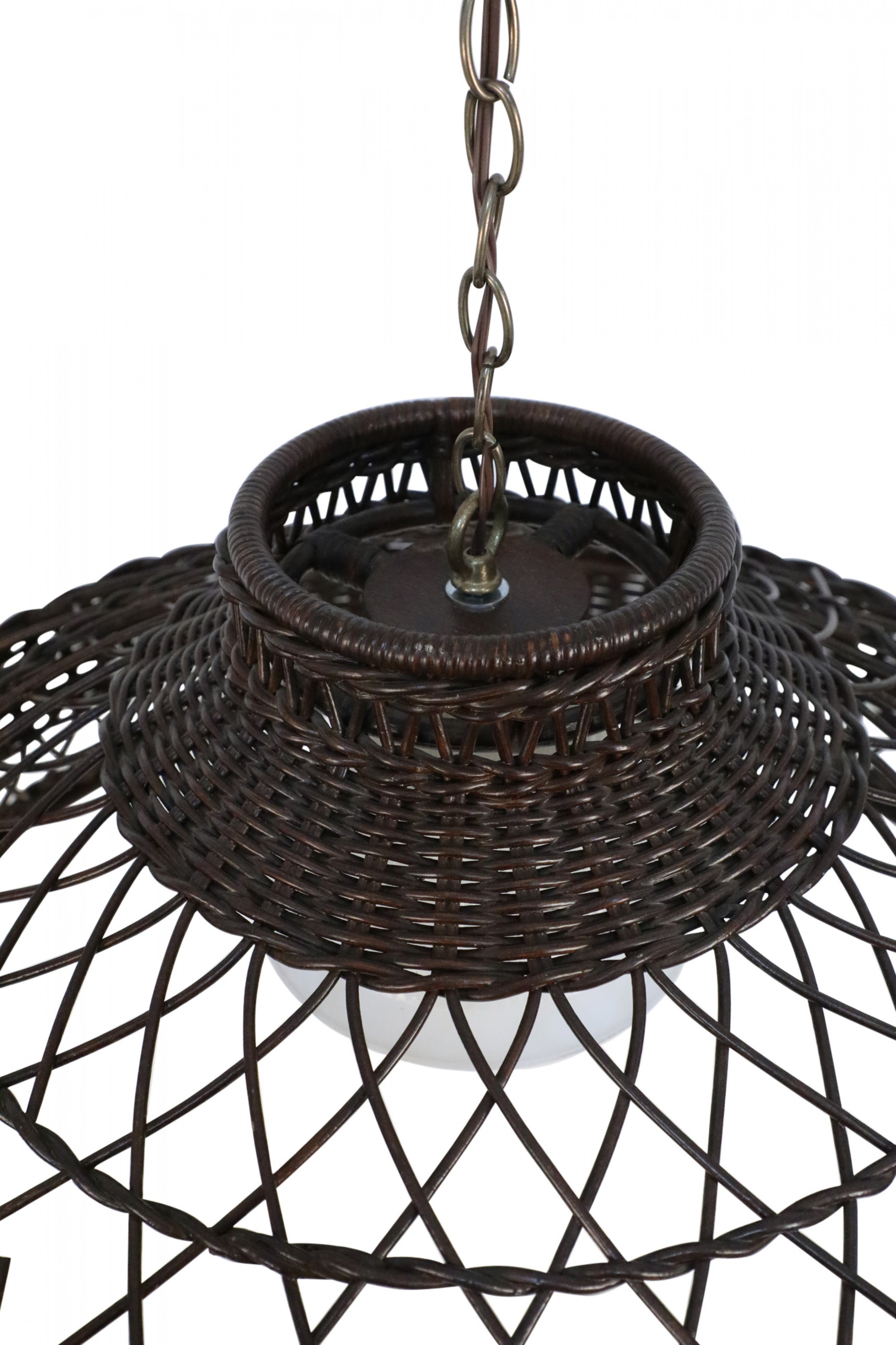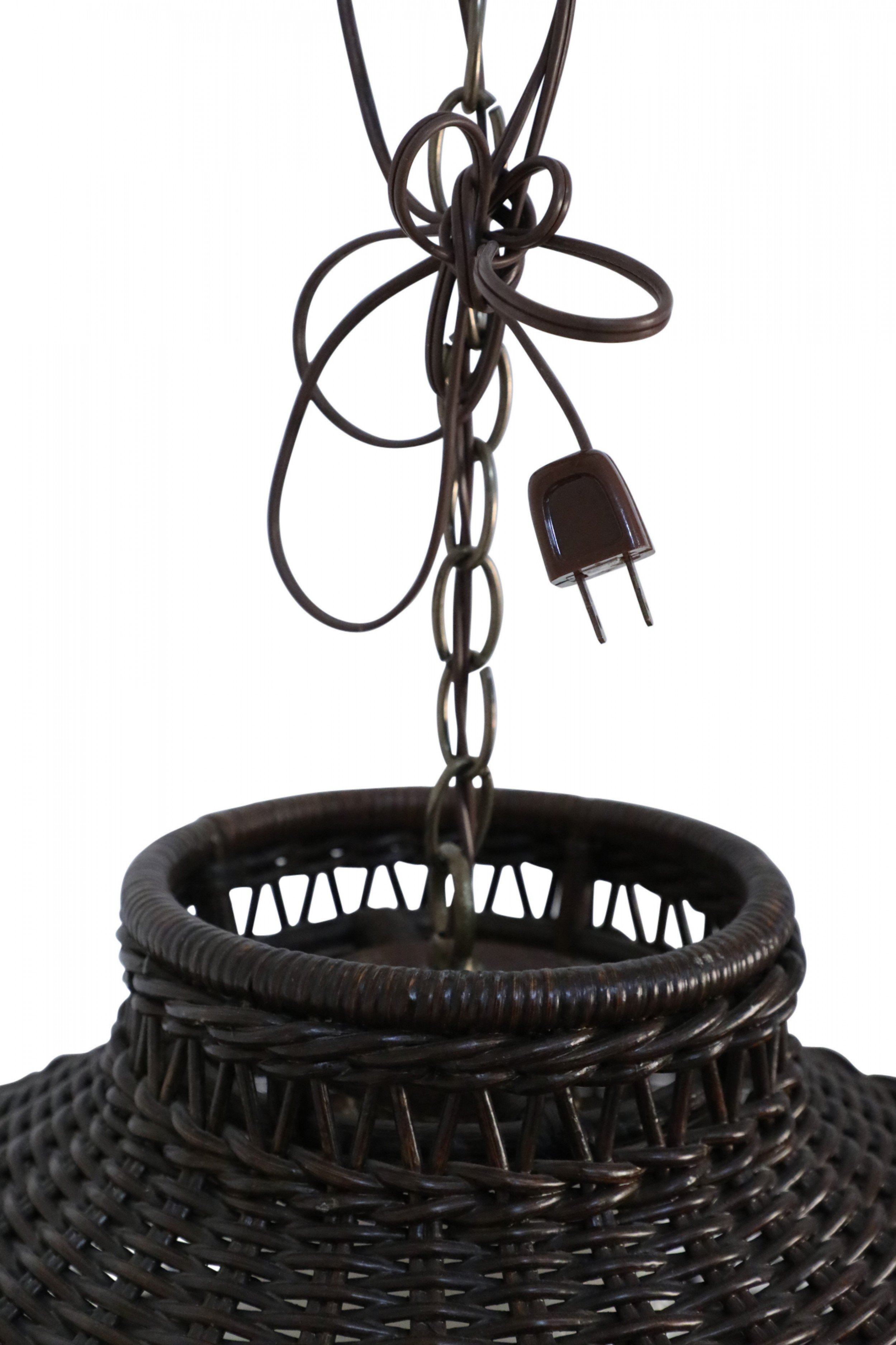 American Victorian (Mission style) chandelier with an exterior circular brown wicker shade and an interior white frosted glass shade..