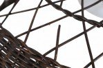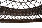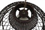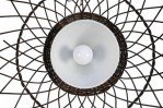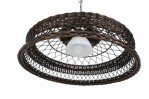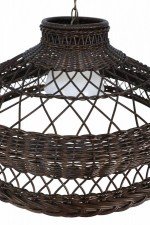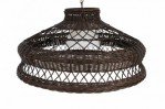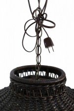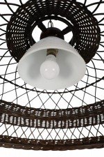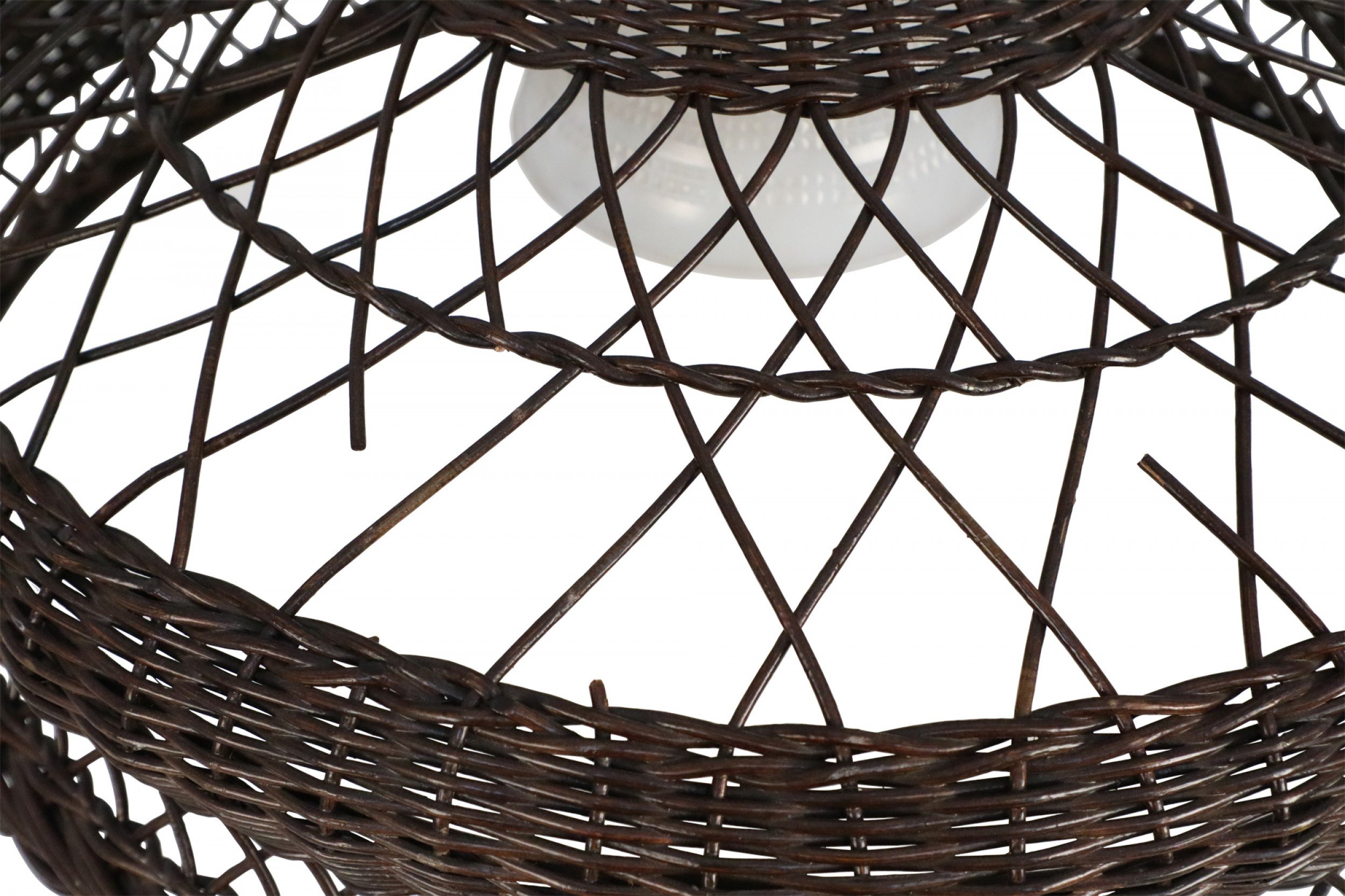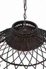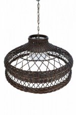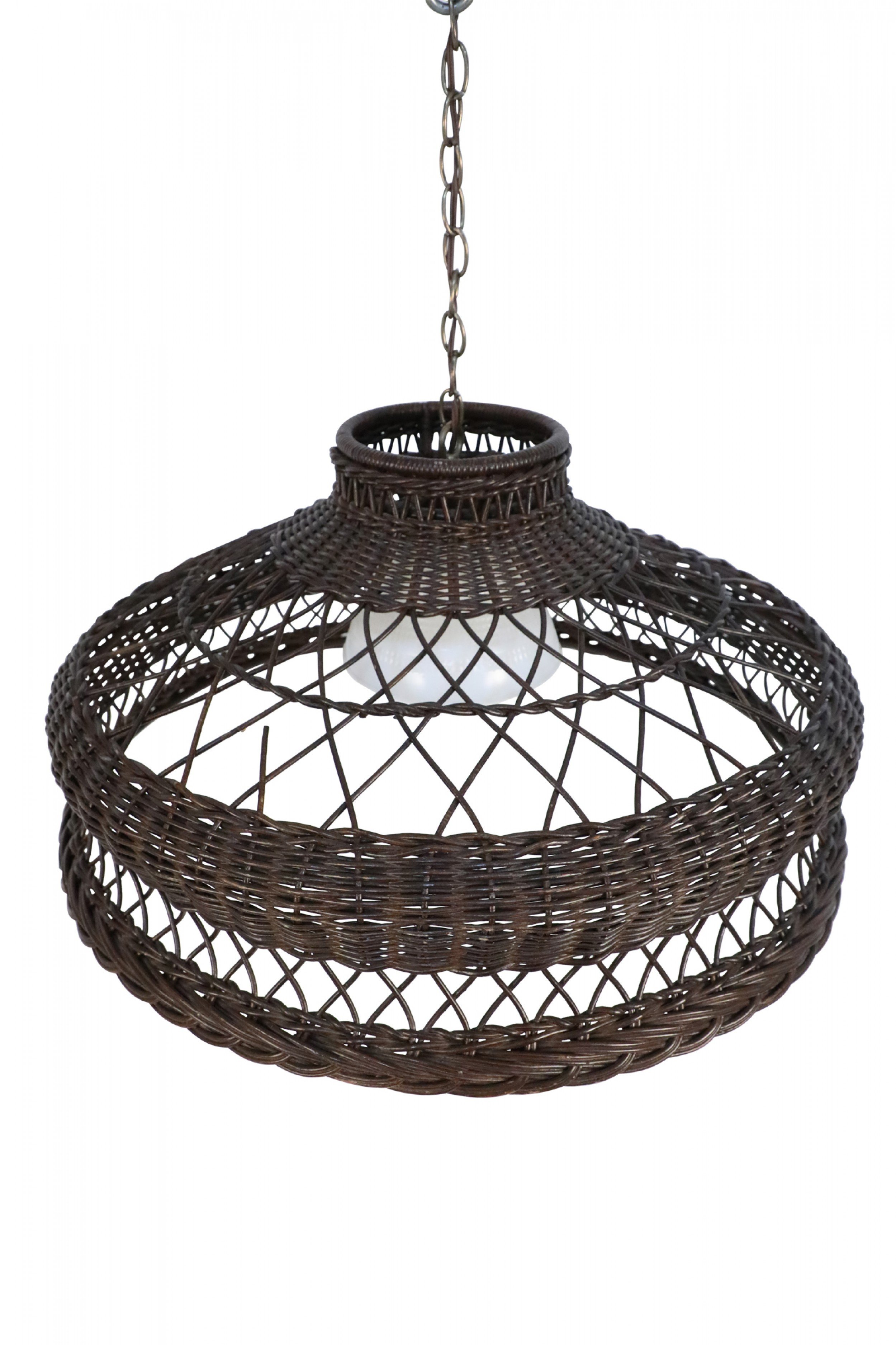 American Victorian (Mission style) chandelier with an exterior circular brown wicker shade and an interior white frosted glass shade.