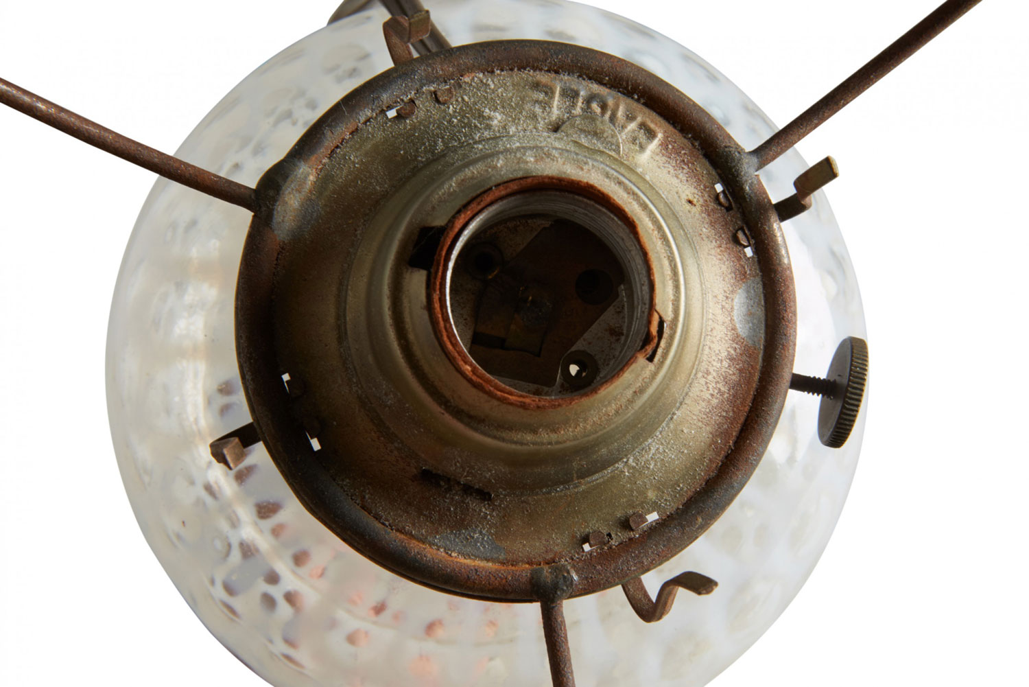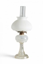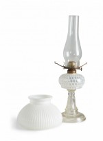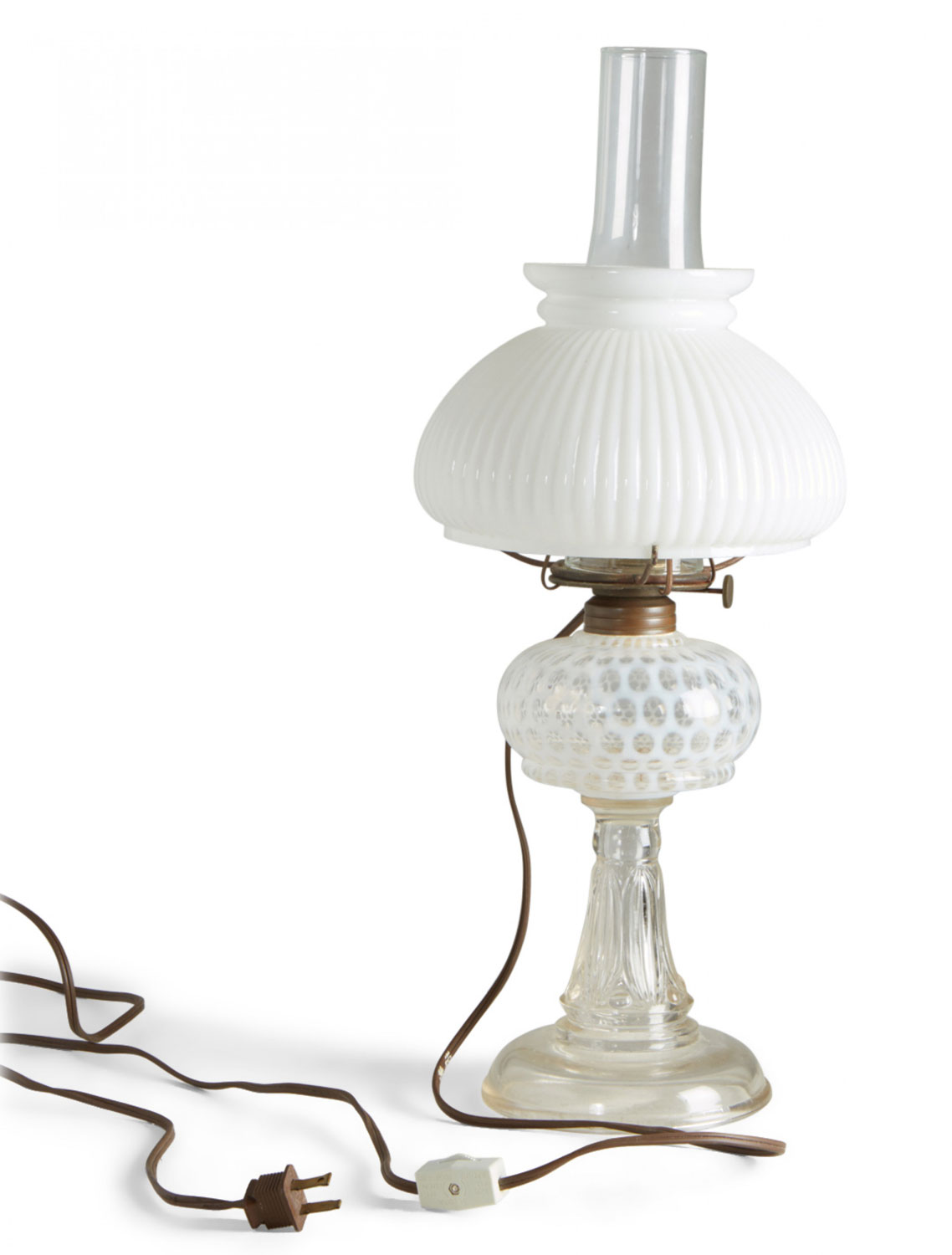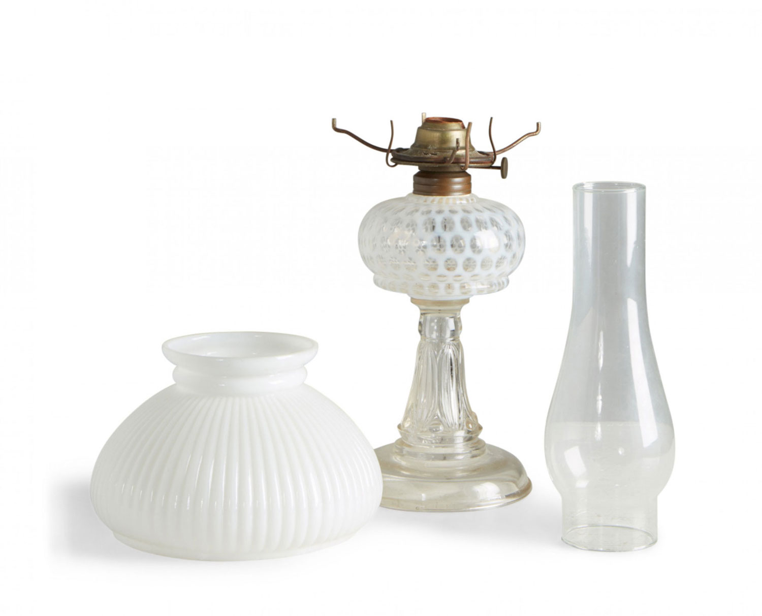 American Victorian glass table lamp comprised of a shaped clear glass base with decorative circular white pattern with threaded brass hardware and a clear hurricane shade beneath a larger ribbed milk glass shade (now wire for electricity).