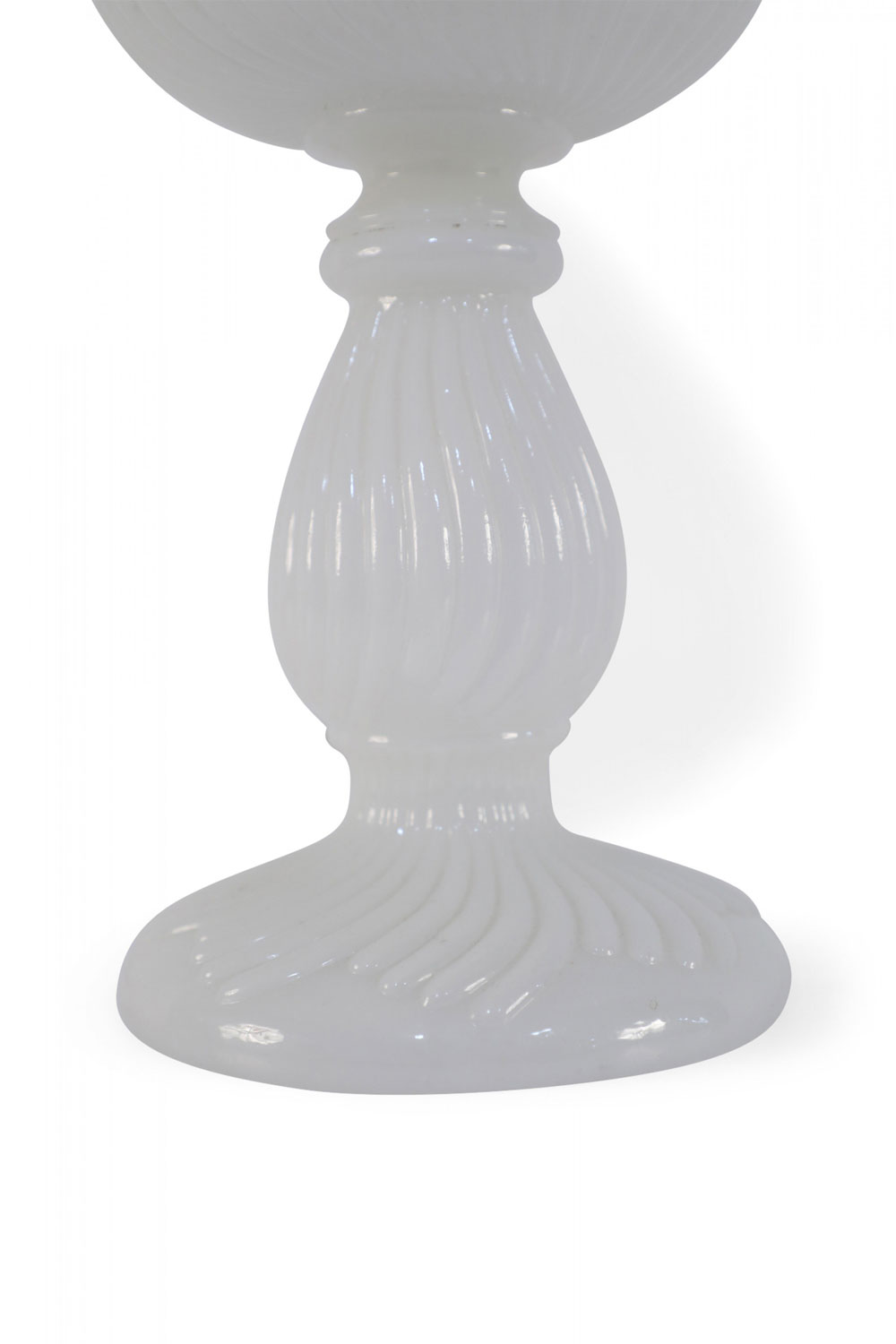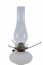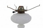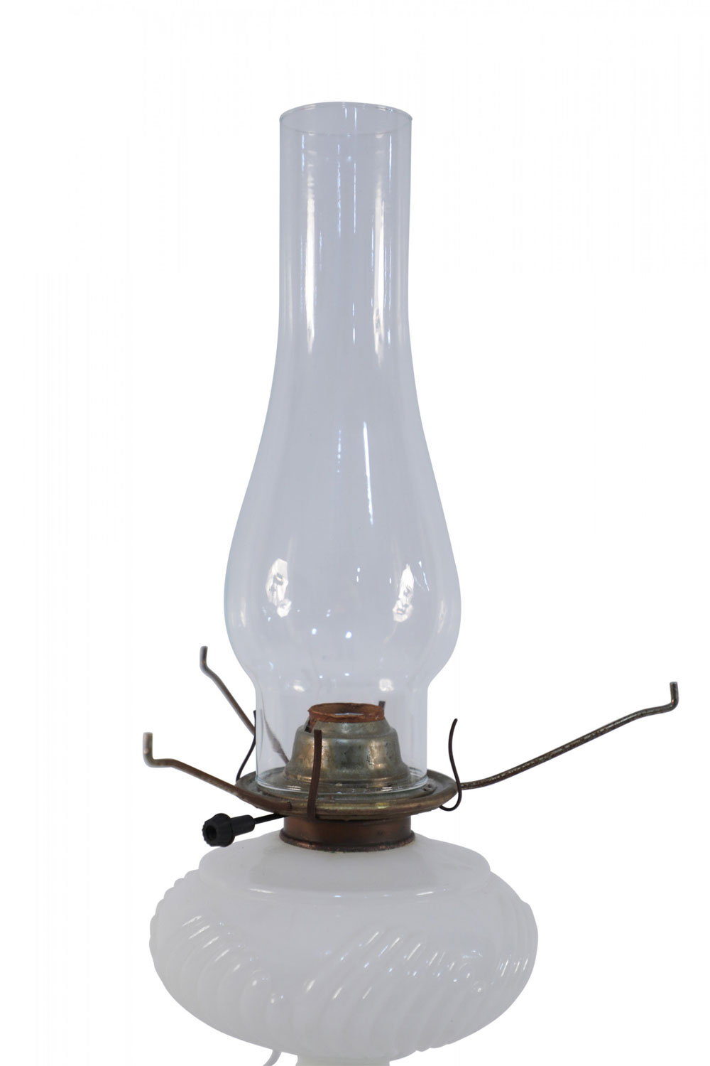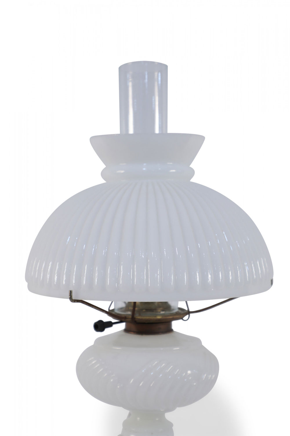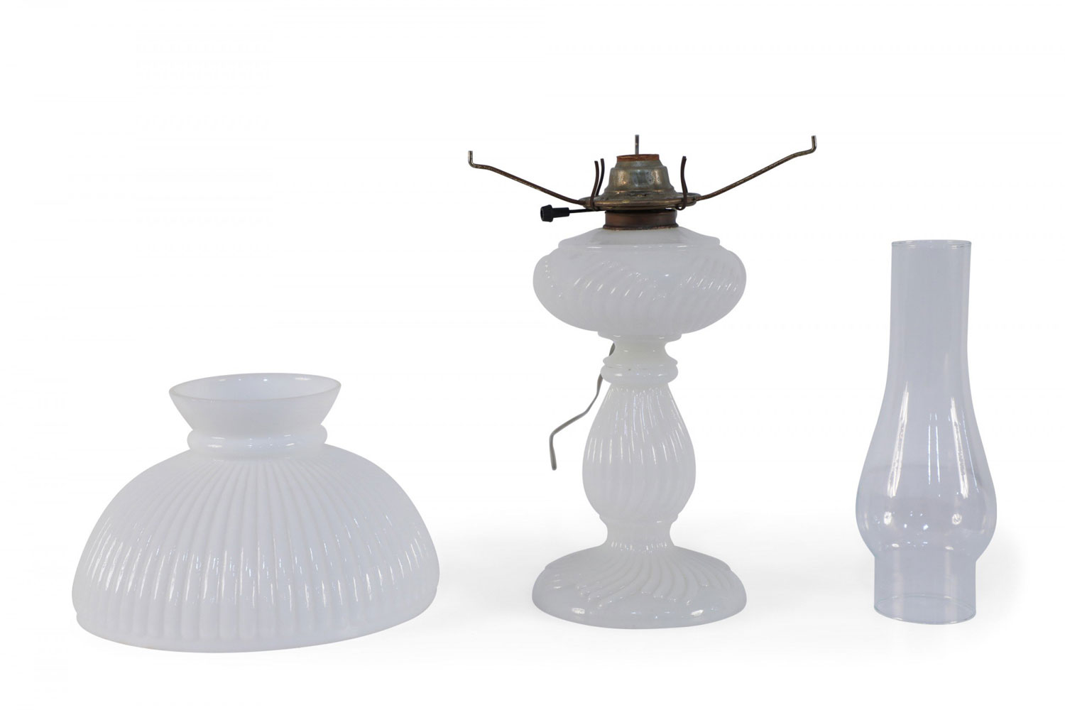 American Victorian ribbed milk glass (oil) table lamp comprised of a shaped glass base with threaded brass hardware and a clear glass hurricane shade beneath a larger ribbed milk glass shade..