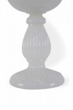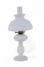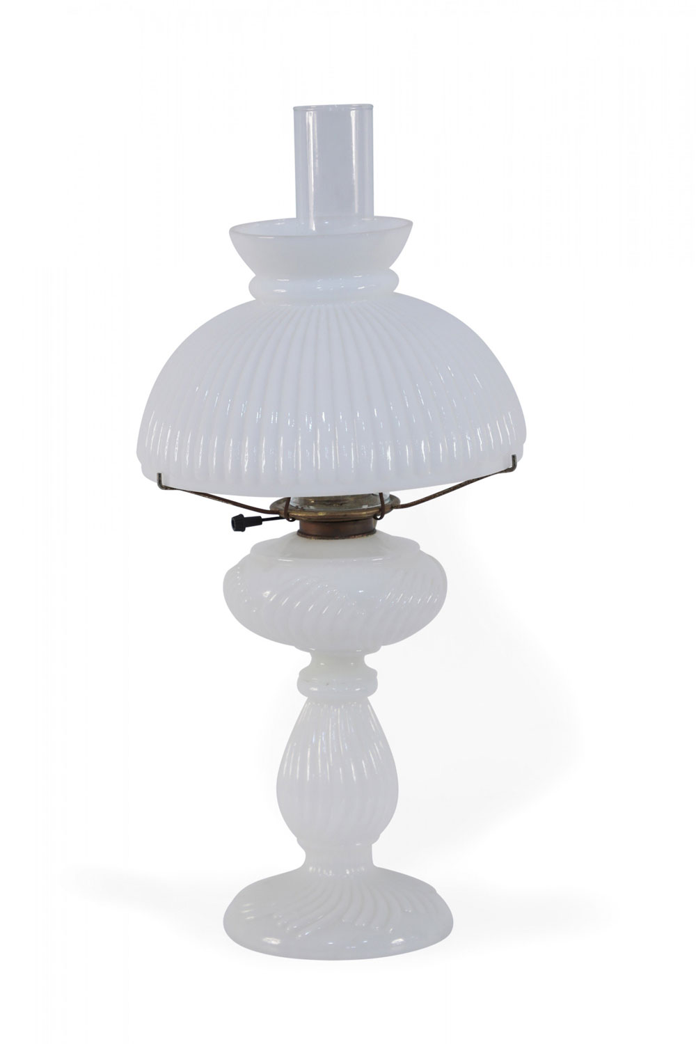 American Victorian ribbed milk glass (oil) table lamp comprised of a shaped glass base with threaded brass hardware and a clear glass hurricane shade beneath a larger ribbed milk glass shade.